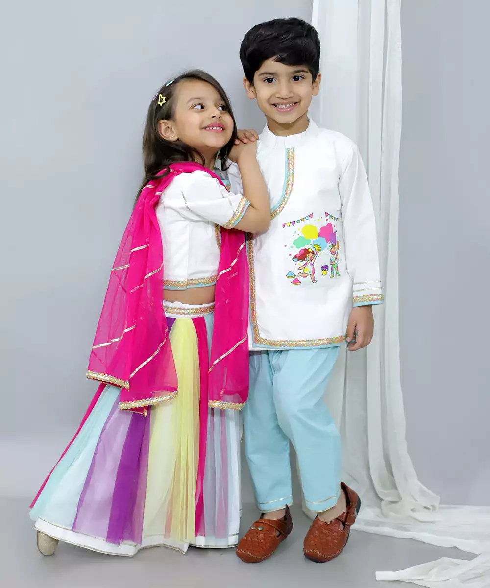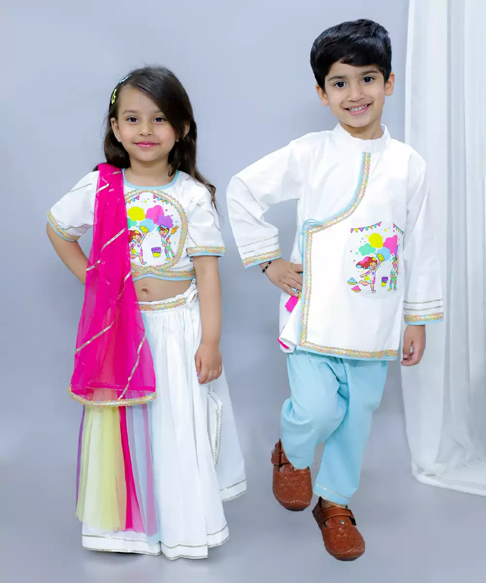 White Poplin Angrakha Style Kurta With Kis Playing Holi Printed Big Pocket For Keeping Ample Amount Of Colours . Blue Pyjama With Elasticated Waist.
