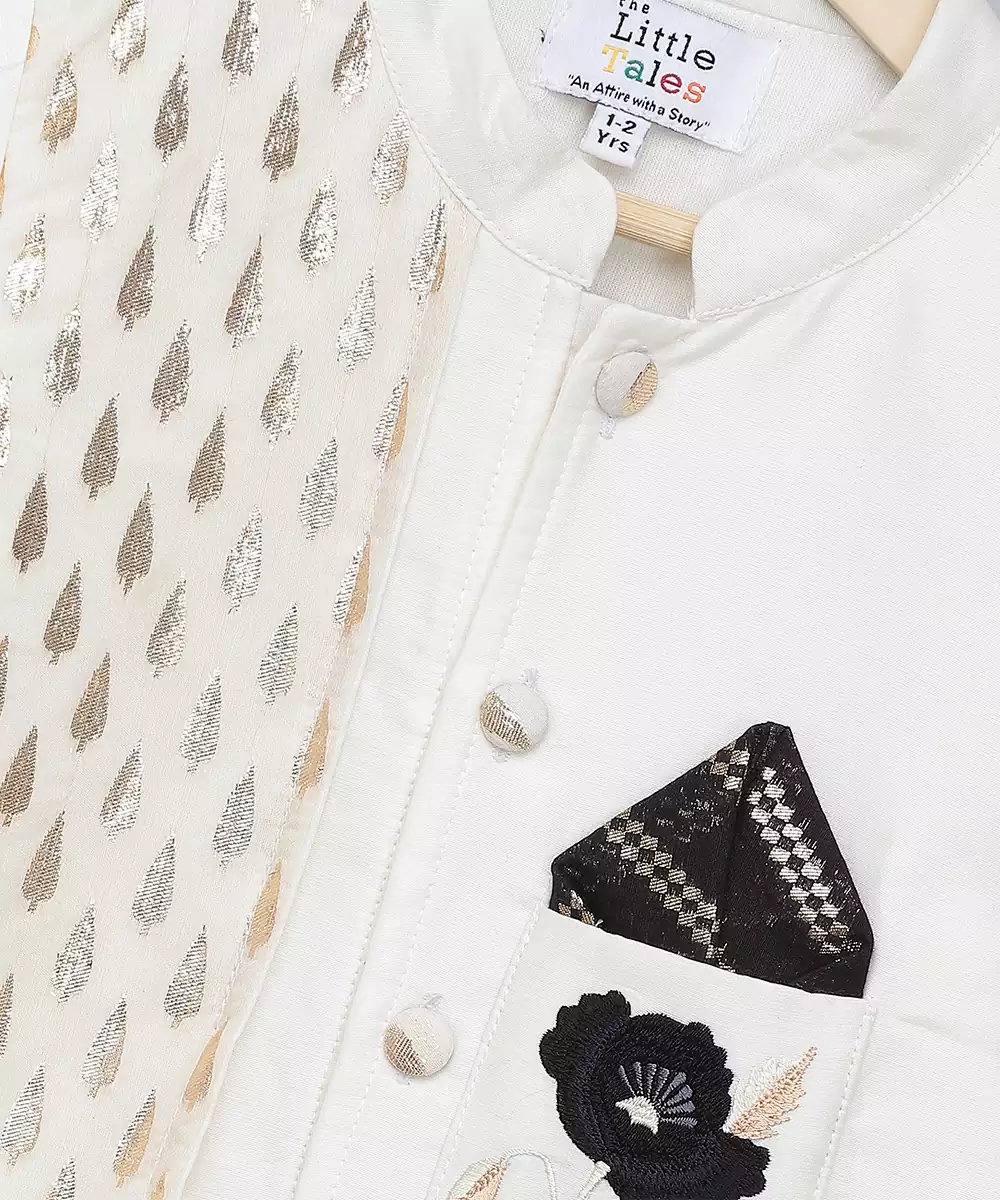 Off White Bandhagla With Pocket Resham Embroidery.Coton Zari Panel Attached On The Side.Cotton Lining Beneath. Bandhgala With Front Opening .Bandhgala With Fabric Buttons.Offwhite Churidar . Bottom With Elasticated Waist