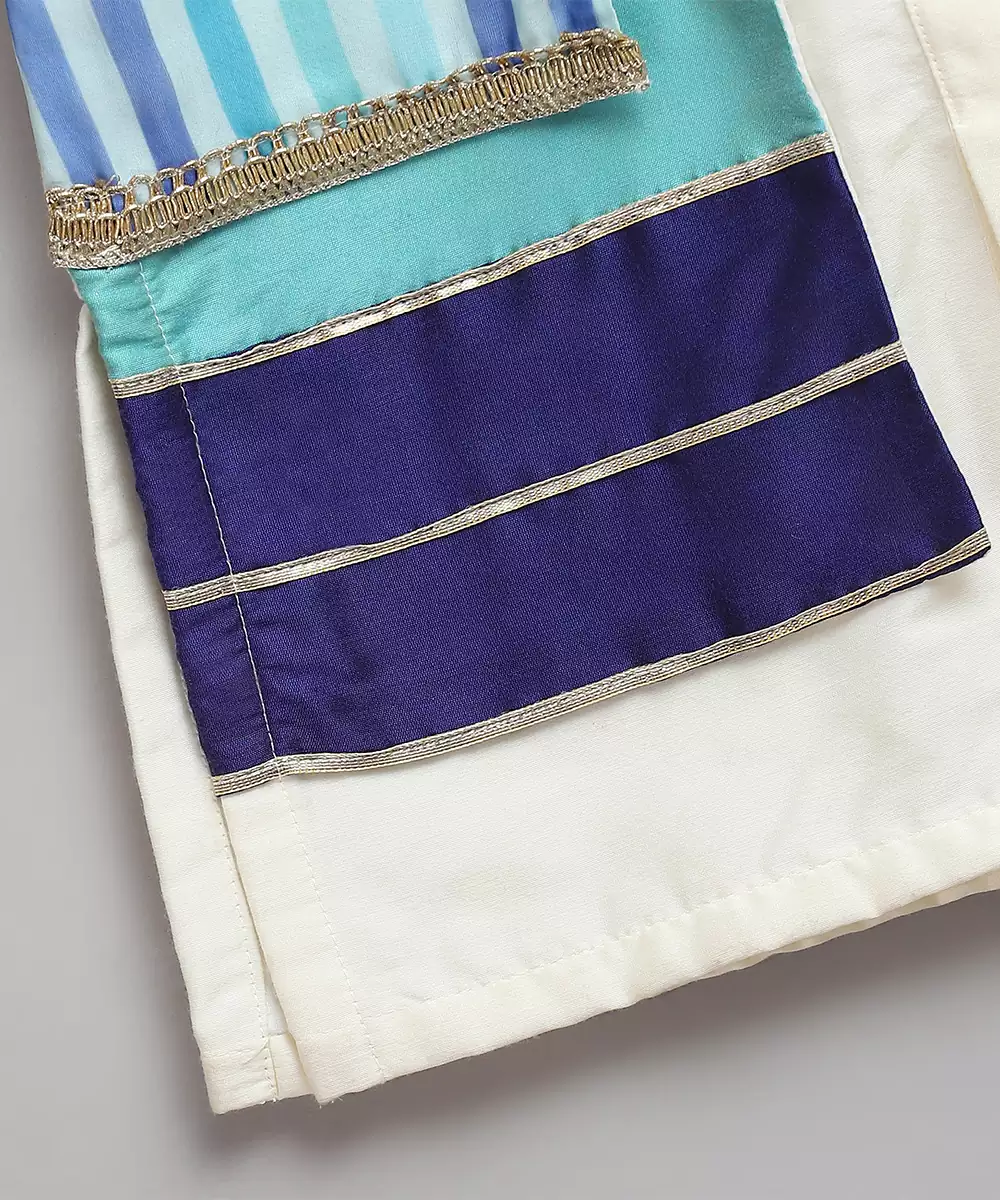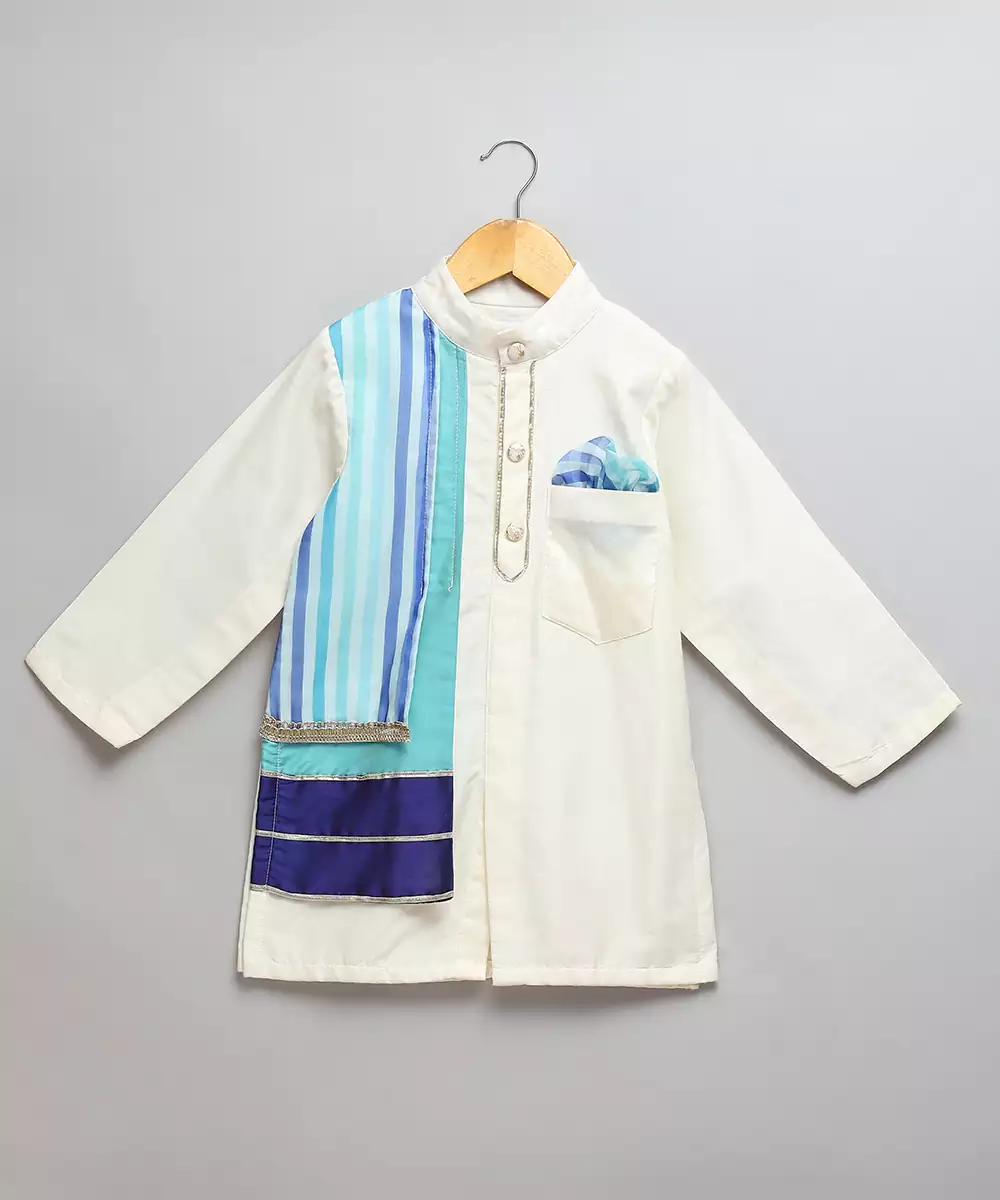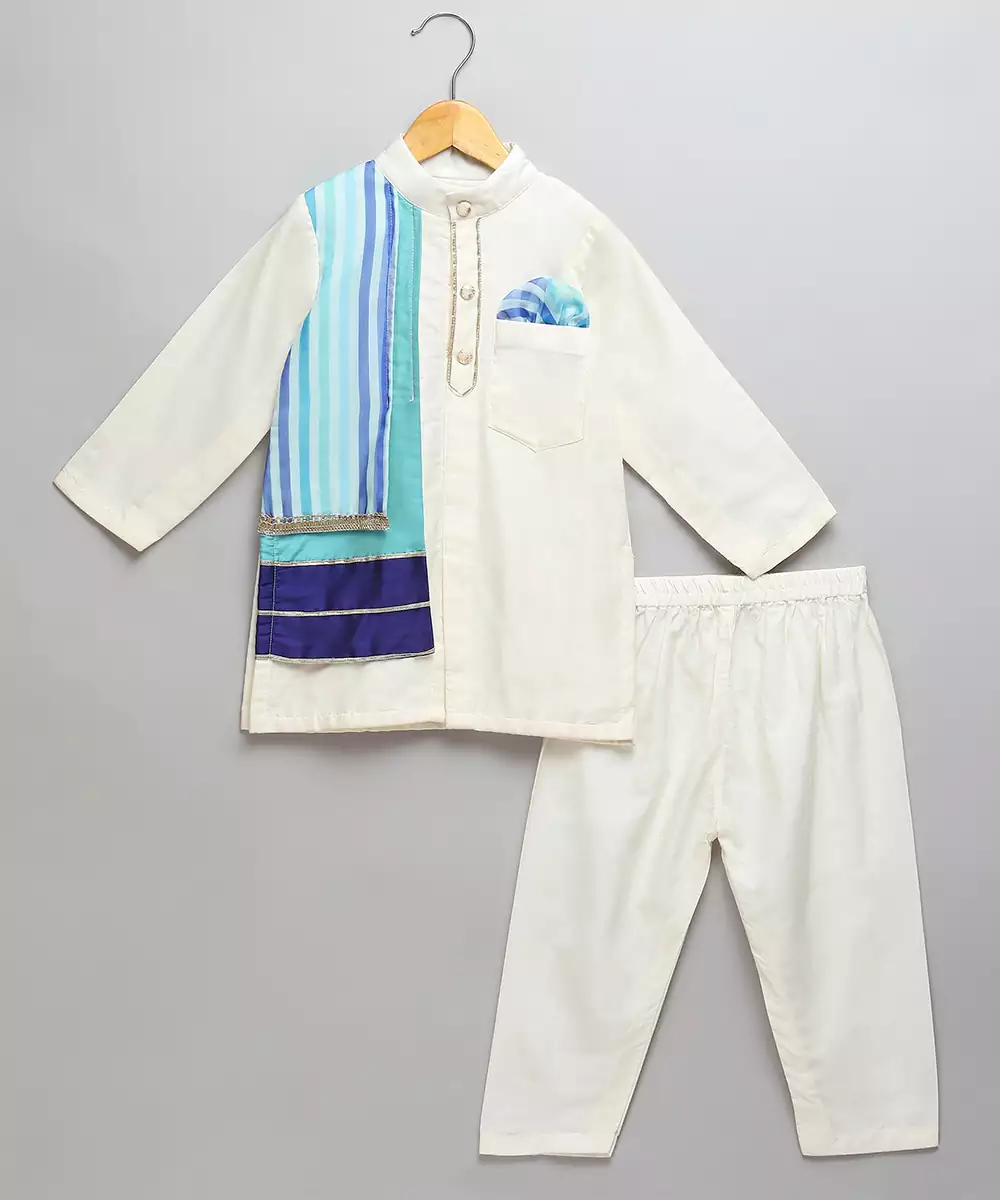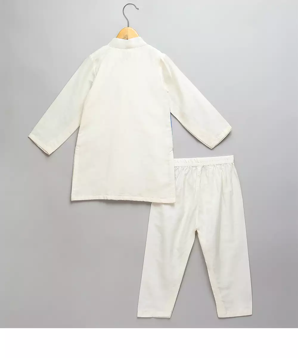 Offwhite Cotton Silk Kurta With Button Opening. Attached Silk And Organza Print Panels On One Side . Lace Finishings.Pajama With Elastic