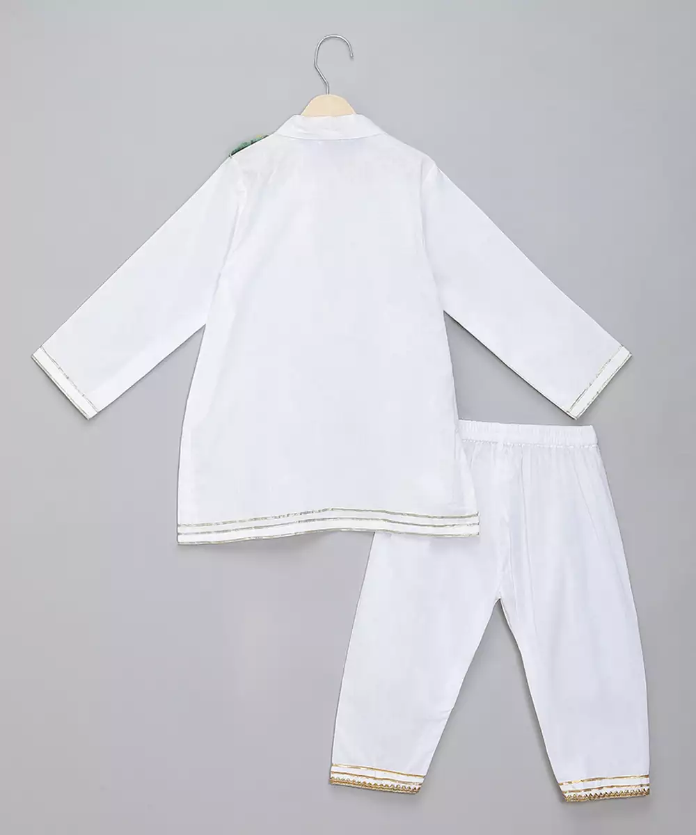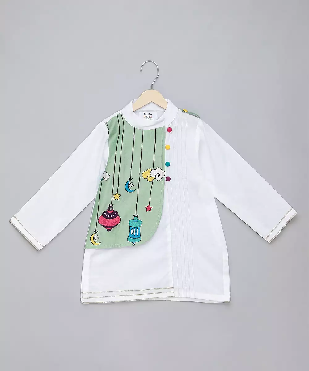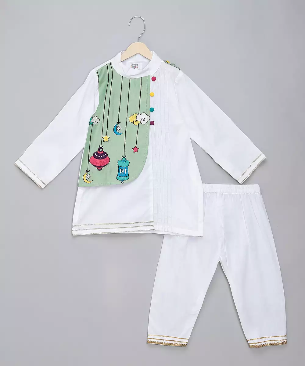 White Cotton Poplin Kurta Pyjama Set With Eid Elements Embroidered Palla Over One Side Of The Kurta . Pyjama With Elasticated Waist.