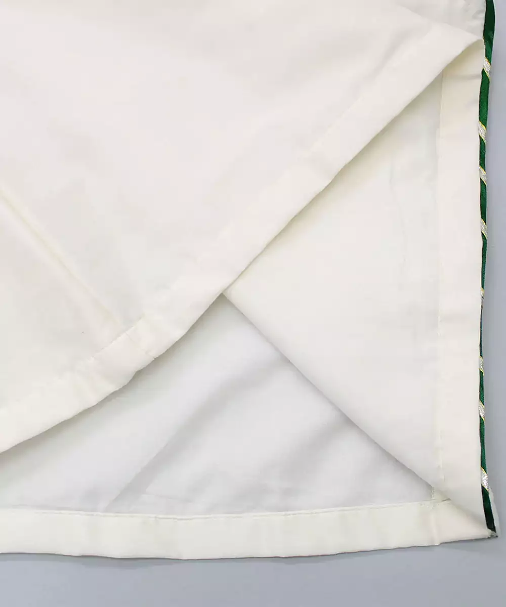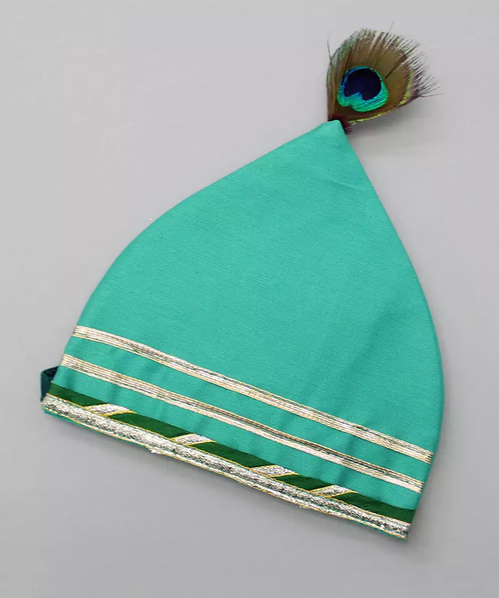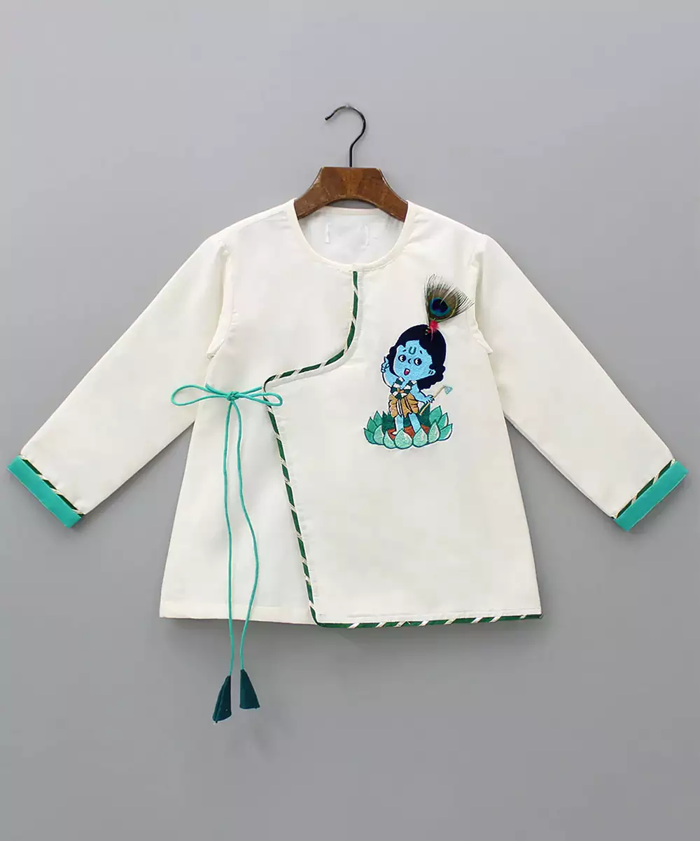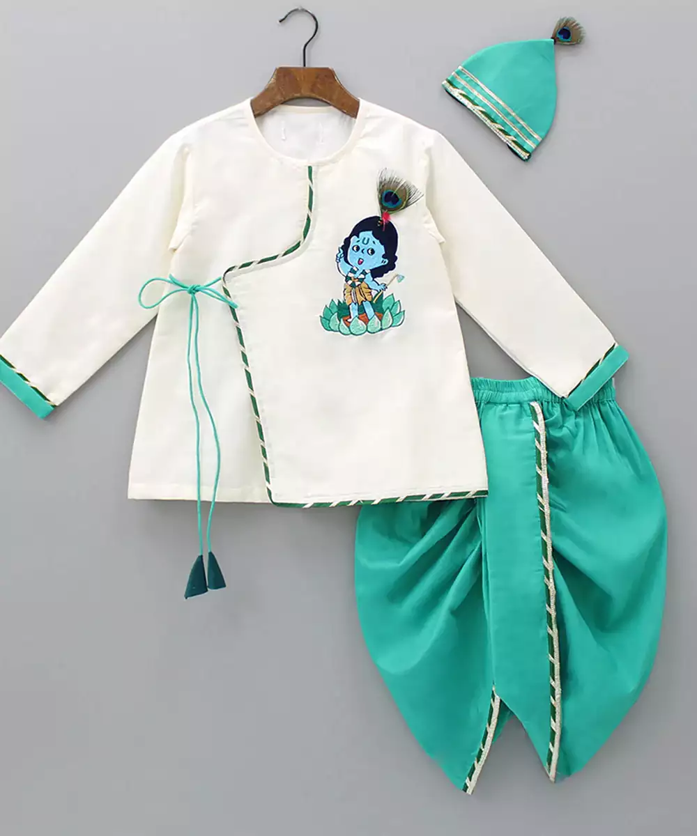 Off White Angrakha Kurta With Krishna Embroidery . Kurta With Lace Finishings.The Set Comes With A Fabric Khadi Printed Mukut . Green Dhoti With Pleating And Contrast Lace Finishings. Bottom With Elasticated Waist