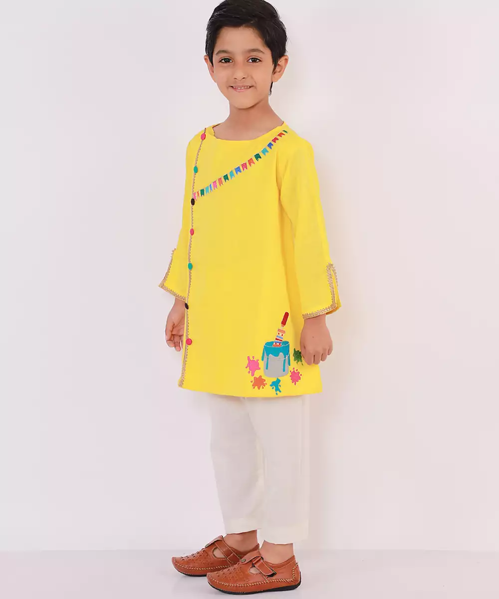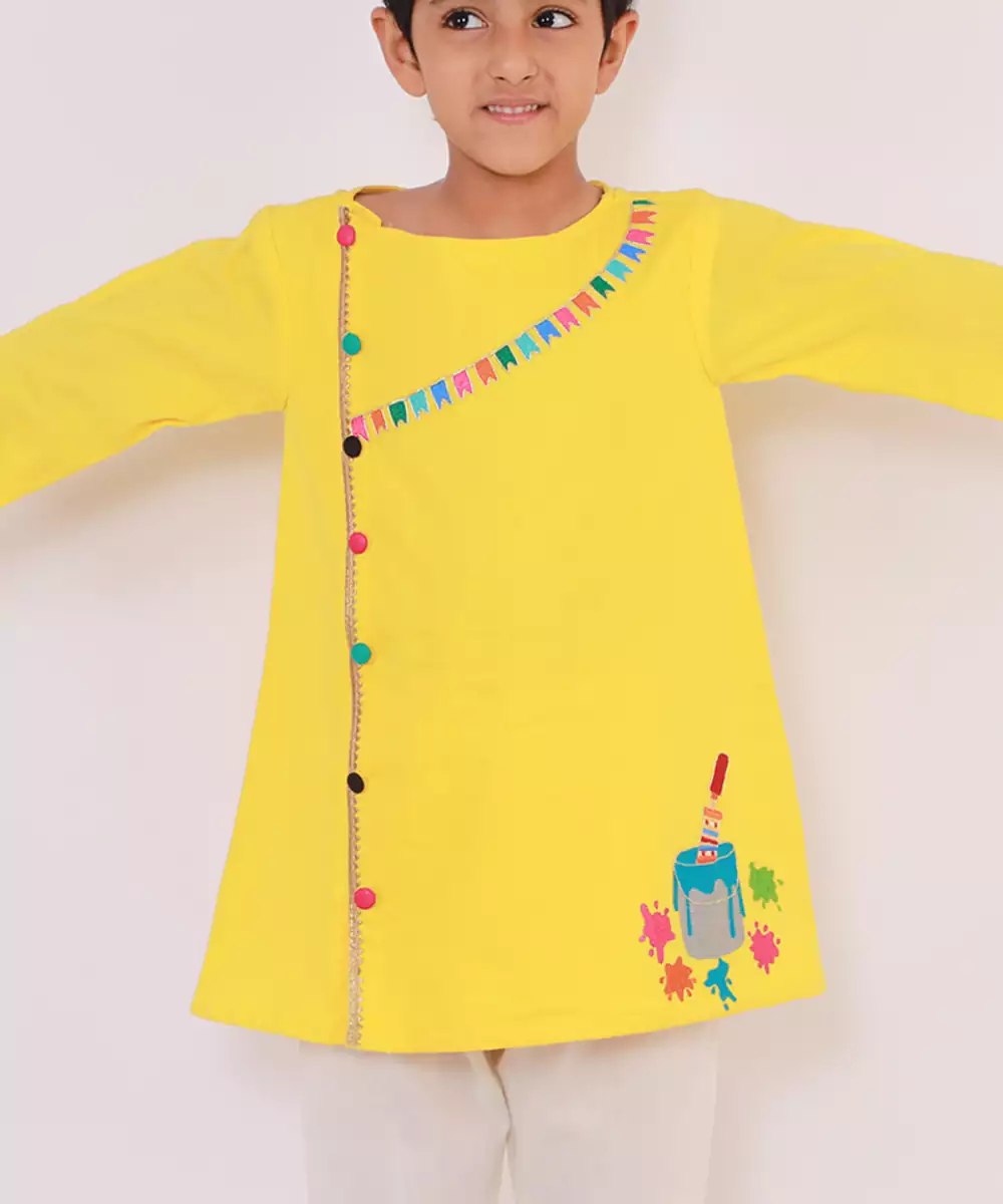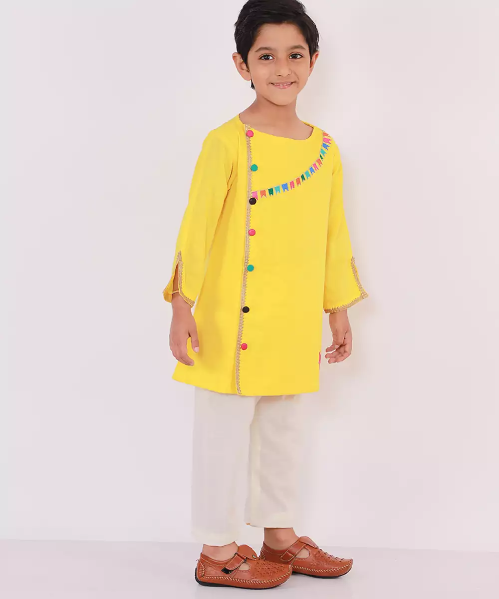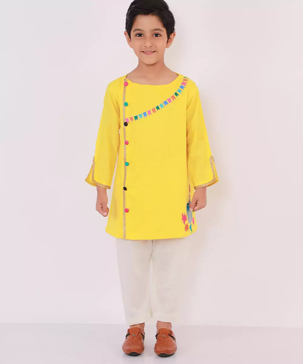Yellow A Line Kurta With Colorful Bucket Embroiered Kurta With Full Sleeves. Kurta With A Line Cut.Kurta With Colorful Button Finishings.. Pyjama With Elasticated Waist.