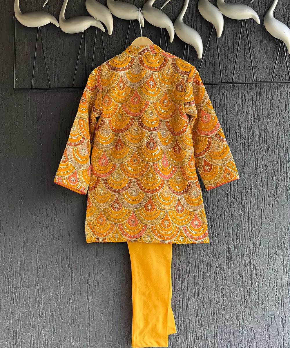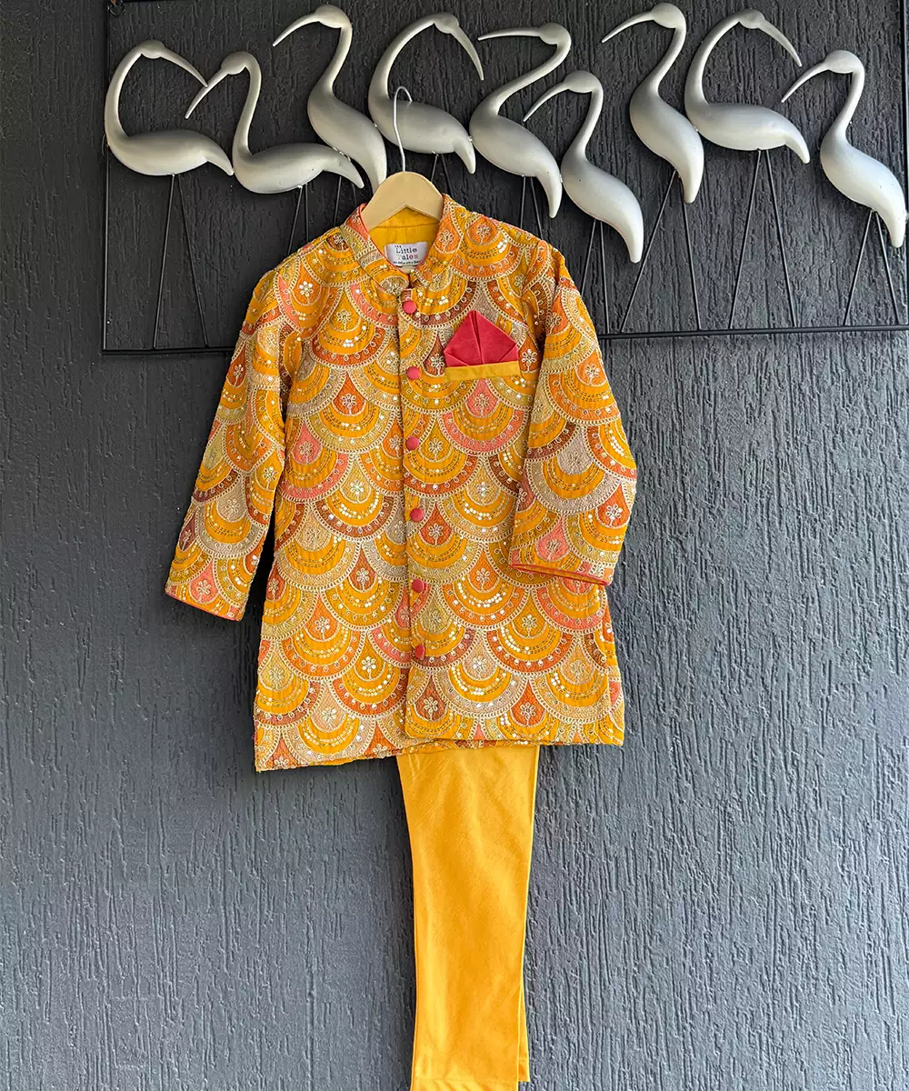 Embroidery Bandhgala With Contrast Dori Pipings And Organza Pocket Square . Top With Front Opening Buttons. Top With Pure Cotton Lining. Bottom With Halfband In The Front And Elasticated Waist At The Back.