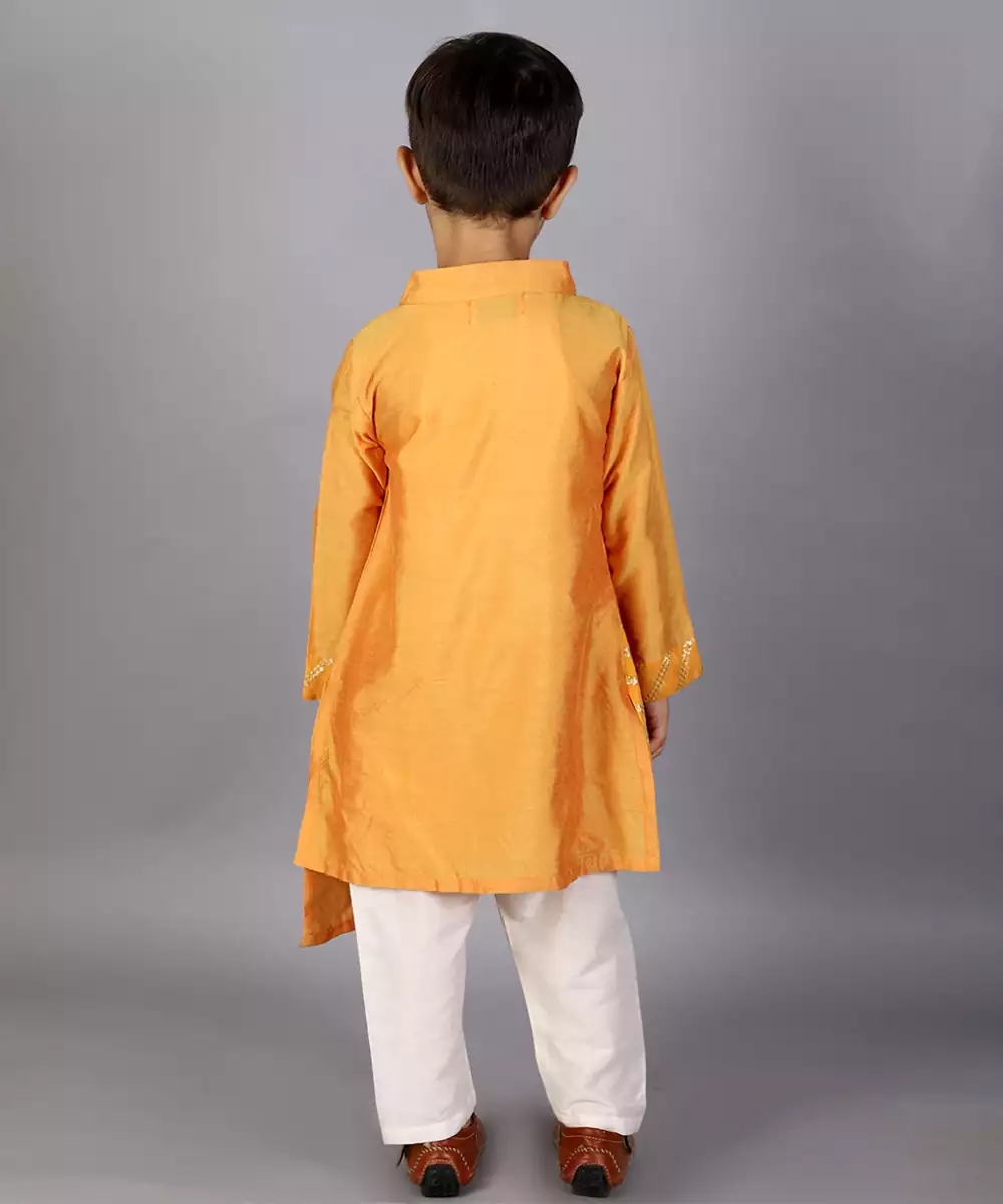 Orange Assymetric Kurta With Zari Attached Jacket On One Side. Kurta With Front Opening .Offwhite Cotton Silk Pyjama . Bottom With Elasticated Waist Colour: Yellow Fabric:Cotton Silk Components: 1 Kurta / 1 Pyjama