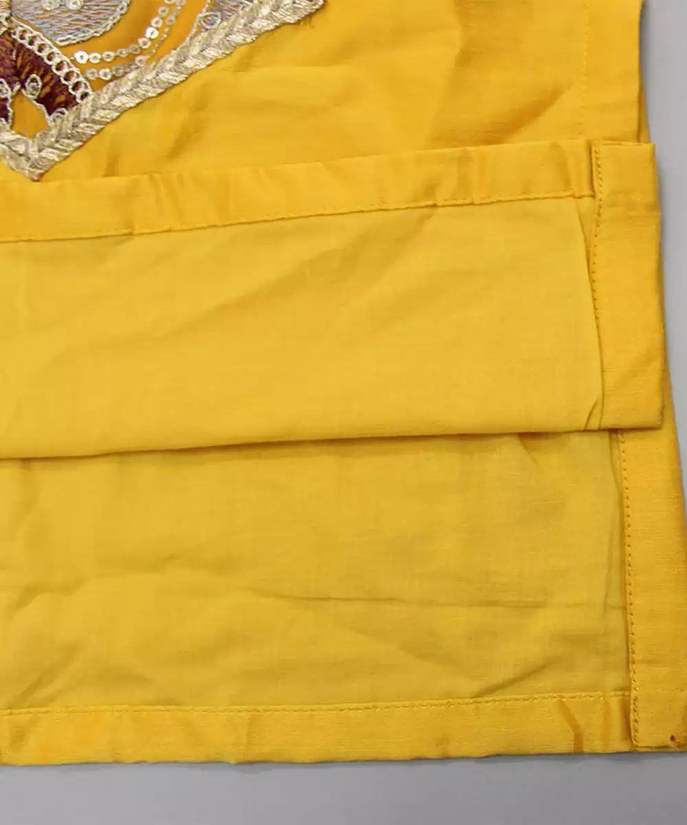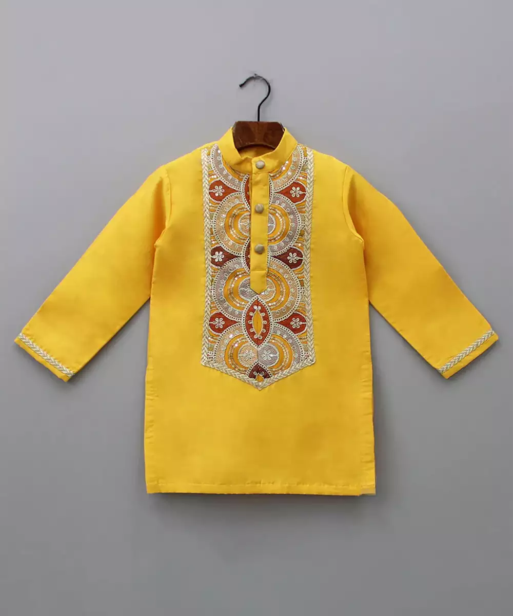 Kurta With Hook Panel At The Front Adorned With Buttons.Embroidered Kurta With Sequins, Thread And Lacework At The Front.Full Sleeves Kurta With Lacework At The Sleeve Hem.Pyjama With An Elasticated Waist.