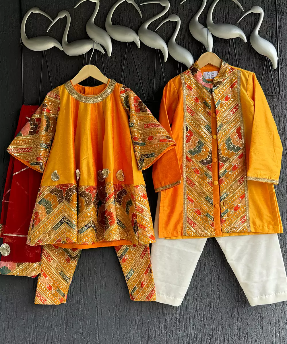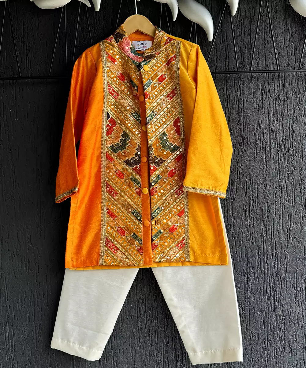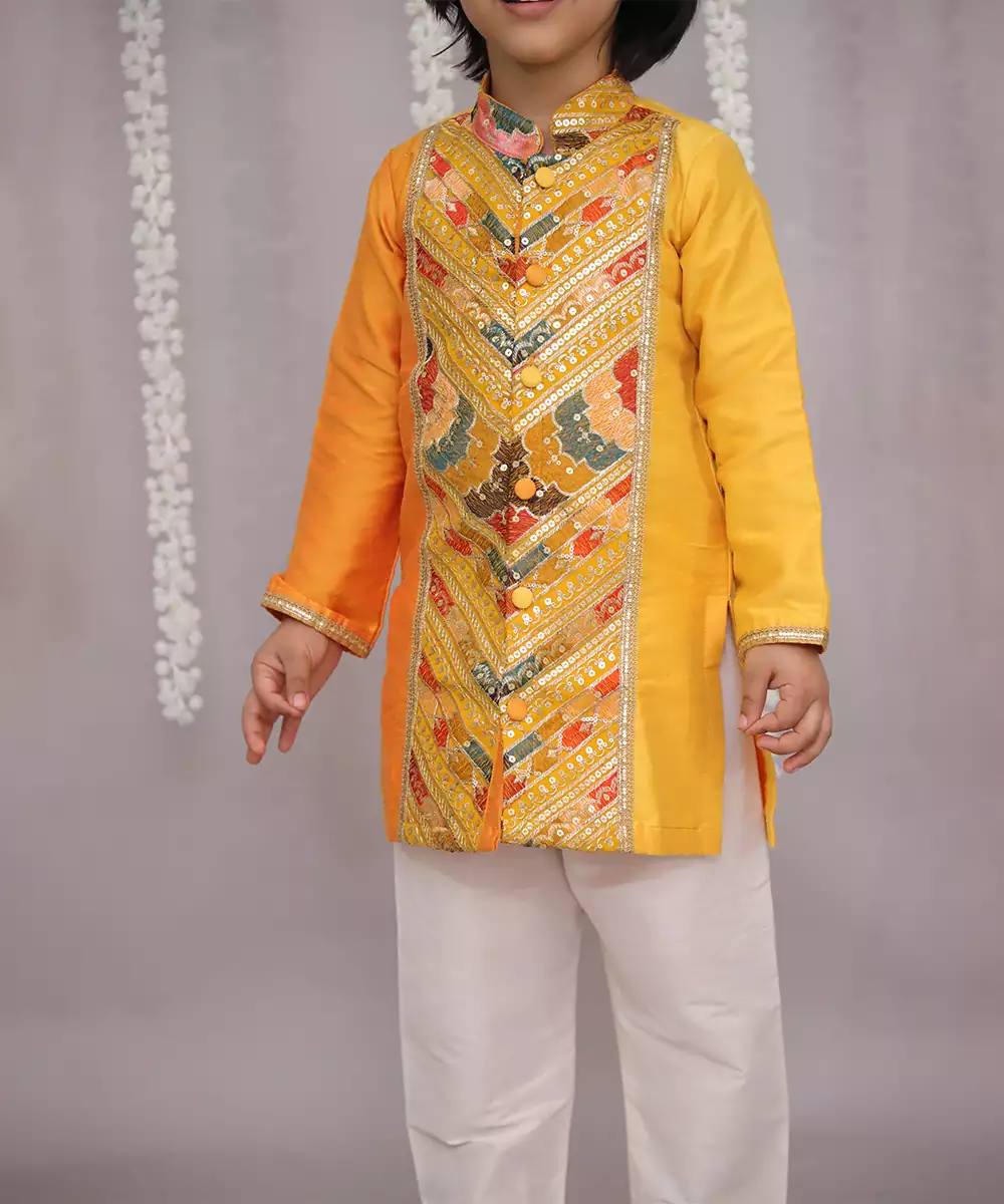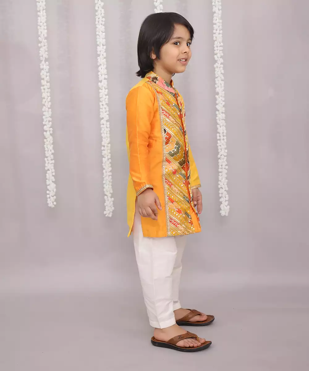 Orange And Yellow Concoction Kurta With Embroiered Panel On The Centre Front Accentuated With Lace .Kurta With Front Opening Enhanced With Fabric Buttons .Bottom With Elasticated Waist