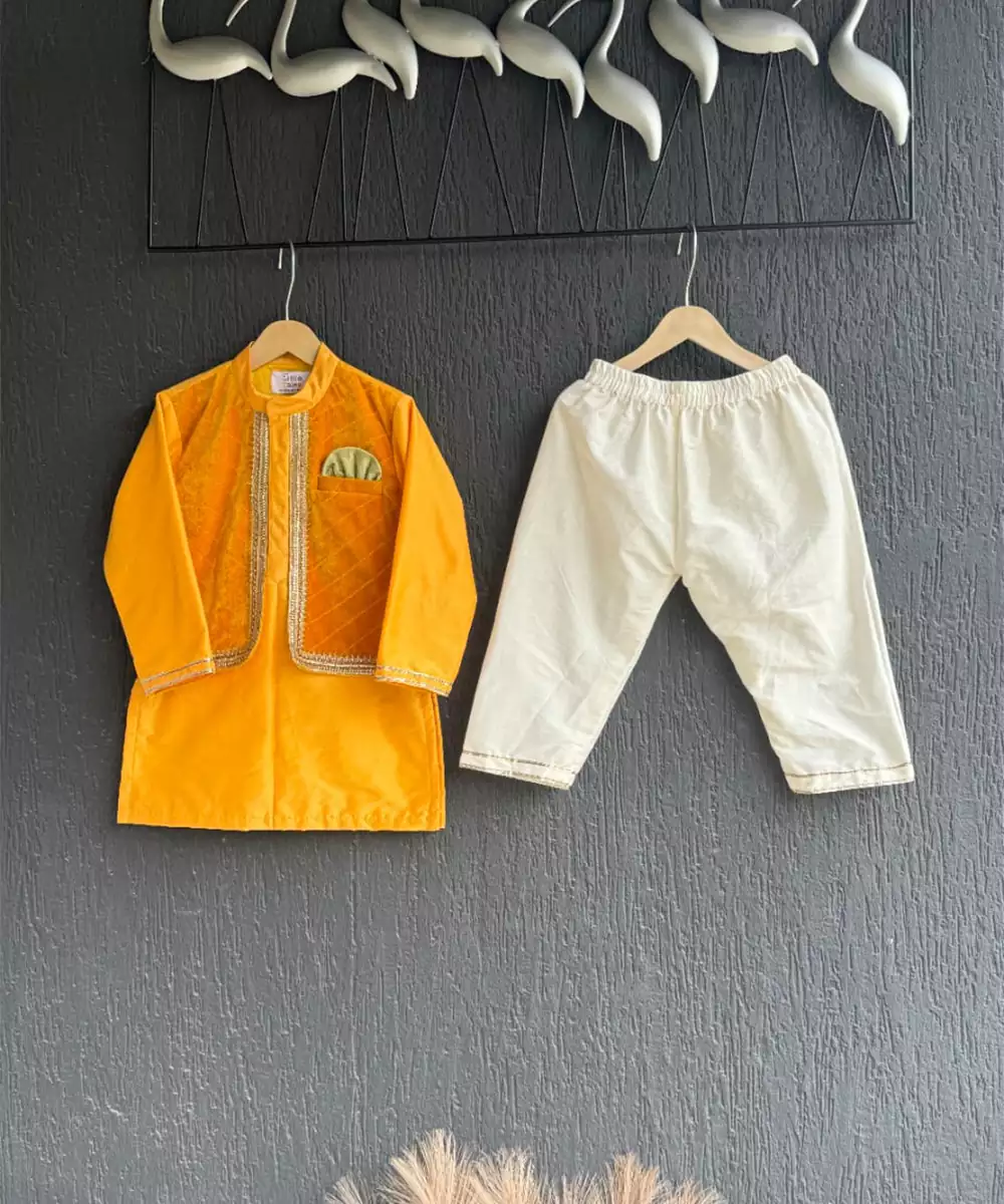 Beautiful Off White Velvet Kurta With Mandarin Collar, Kurta With Side Slits Having Placement Thread Emb On The Right Side Panel.Kurta With Pocket And Pocket Square.Kurta With Fabric Covered Buttons .Pyjama With Half Band And Half Elastic.