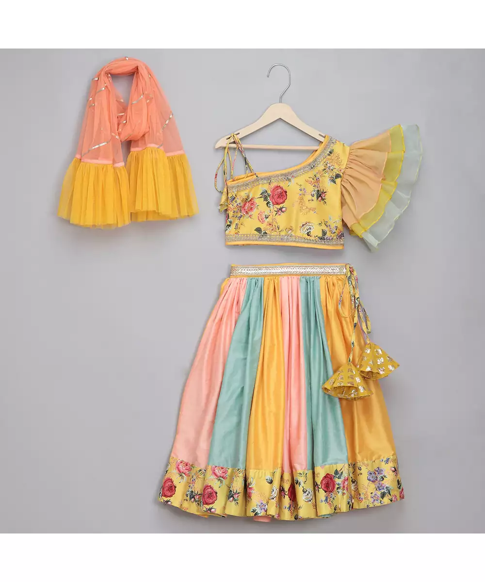 Yellow Digital Floral Printed Blouse And Lace Embellishment With Organza Frill Sleeves. Top With Back Opening. Blouse With Cotton Lining. Digital Prited Lehnga With Printed Border At The Bottom With Embroidered Lace At The Belt. Lehnga With Adjustable Drawstrings For The Waist To Adjust. Lehnga Comes With Beautiful Tassels. Net Frill Dupatta To Compliment The Attire.