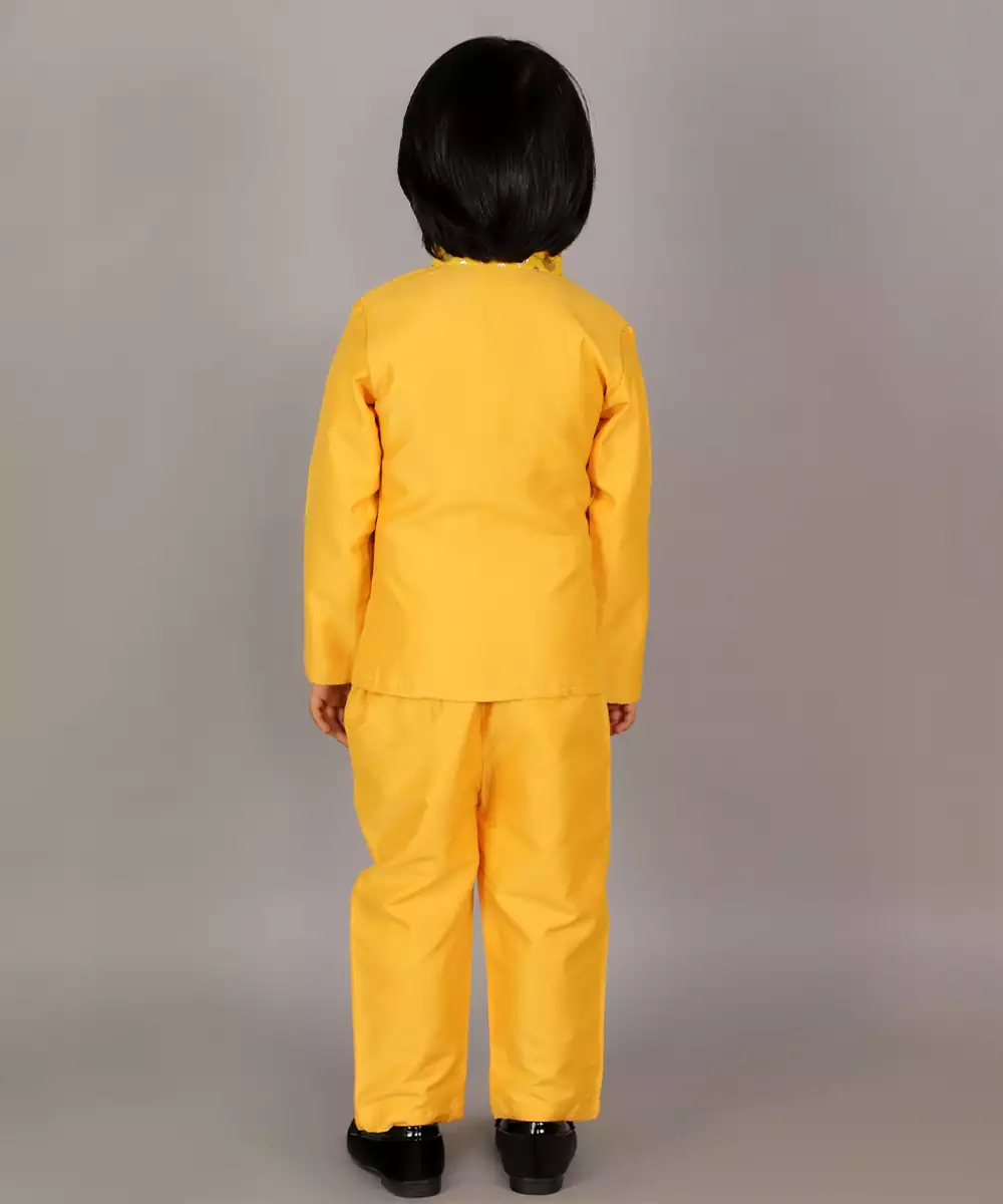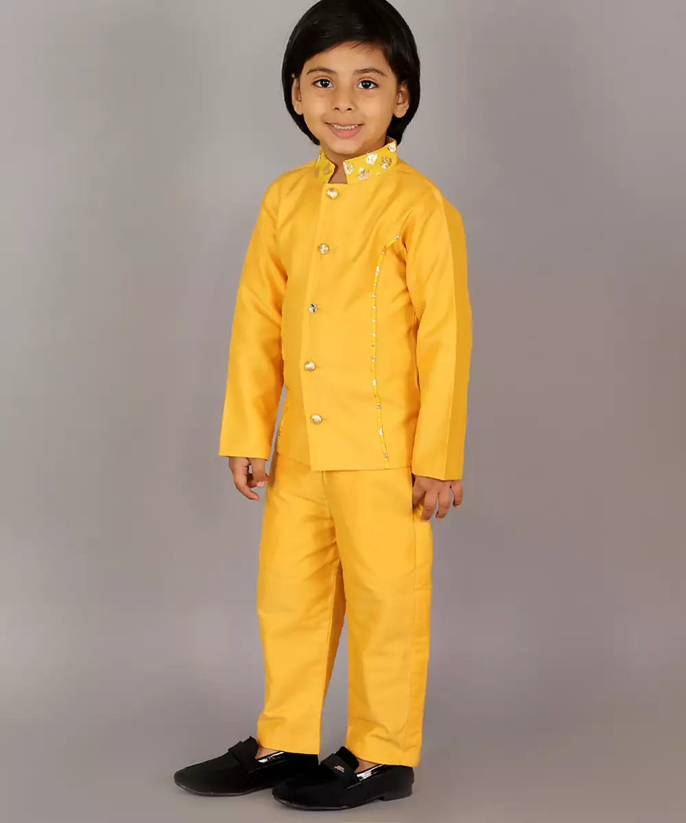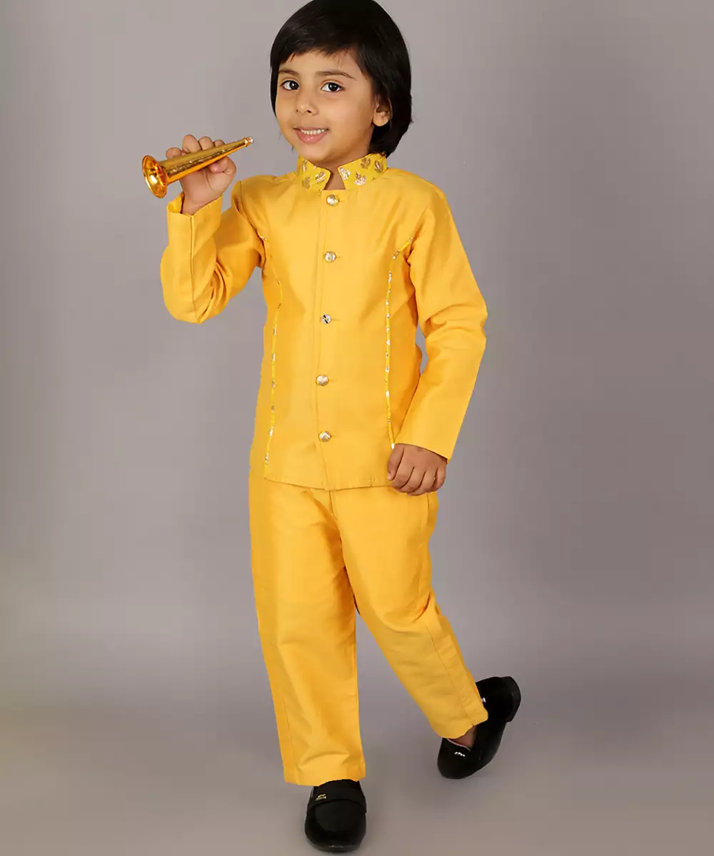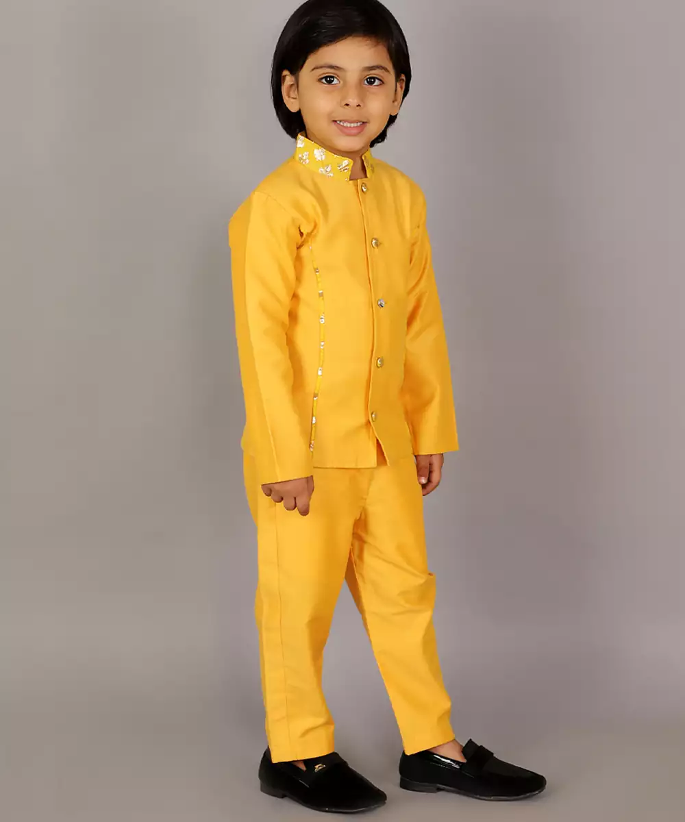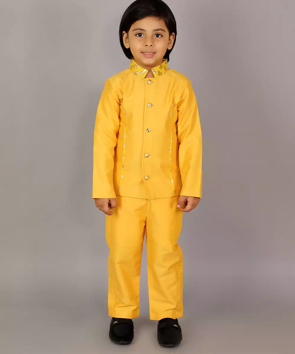 Mustard Yellow Short Bandhgala With Cotton Lining.Bandhgala With Princess Cut And Zari Pipngs And Collar Bandhgala With With Front Opening .Bandhgala With Fabric Buttons.Mustard Yellow Cotton Silk Trousers . Bottom With Elasticated Waist