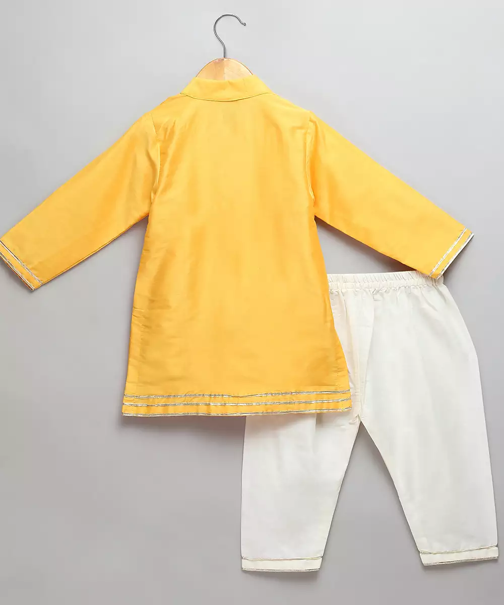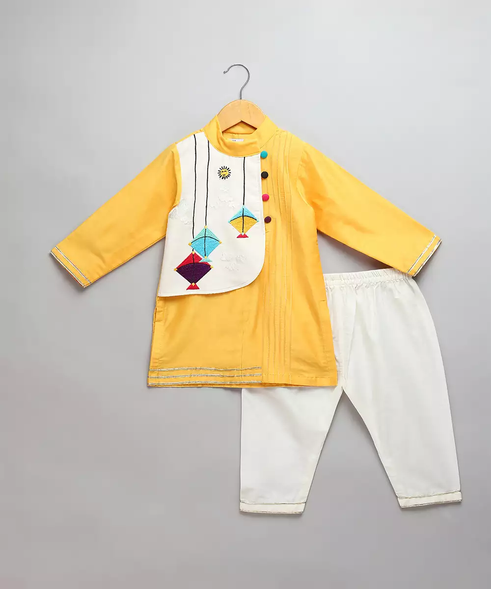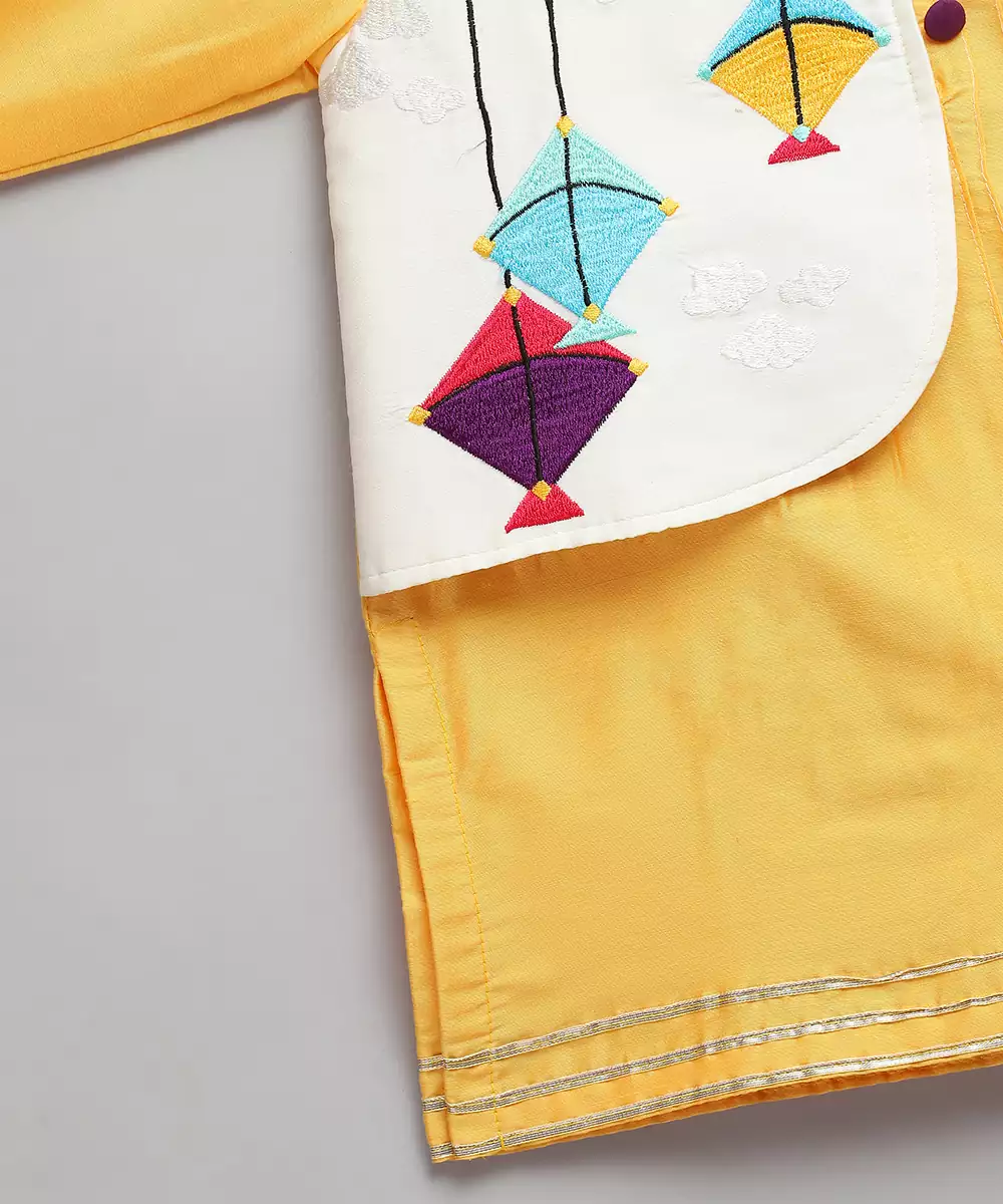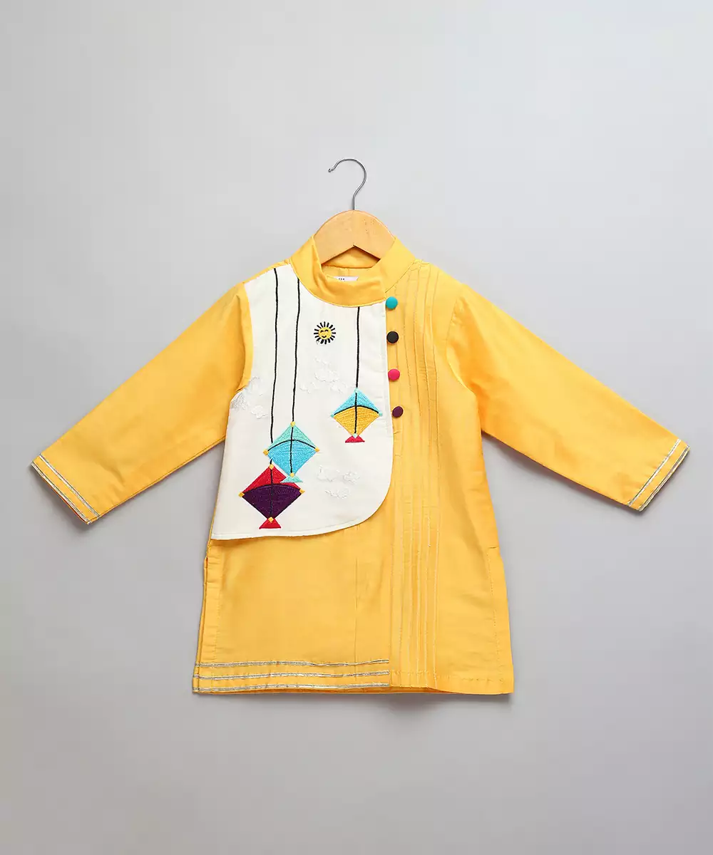 Yellow Cotton Silk Kurta Pyjama Set With Kite Embroidered Palla Over One Side Of The Kurta . Pyjama With Elasticated Waist.