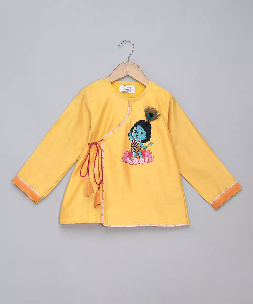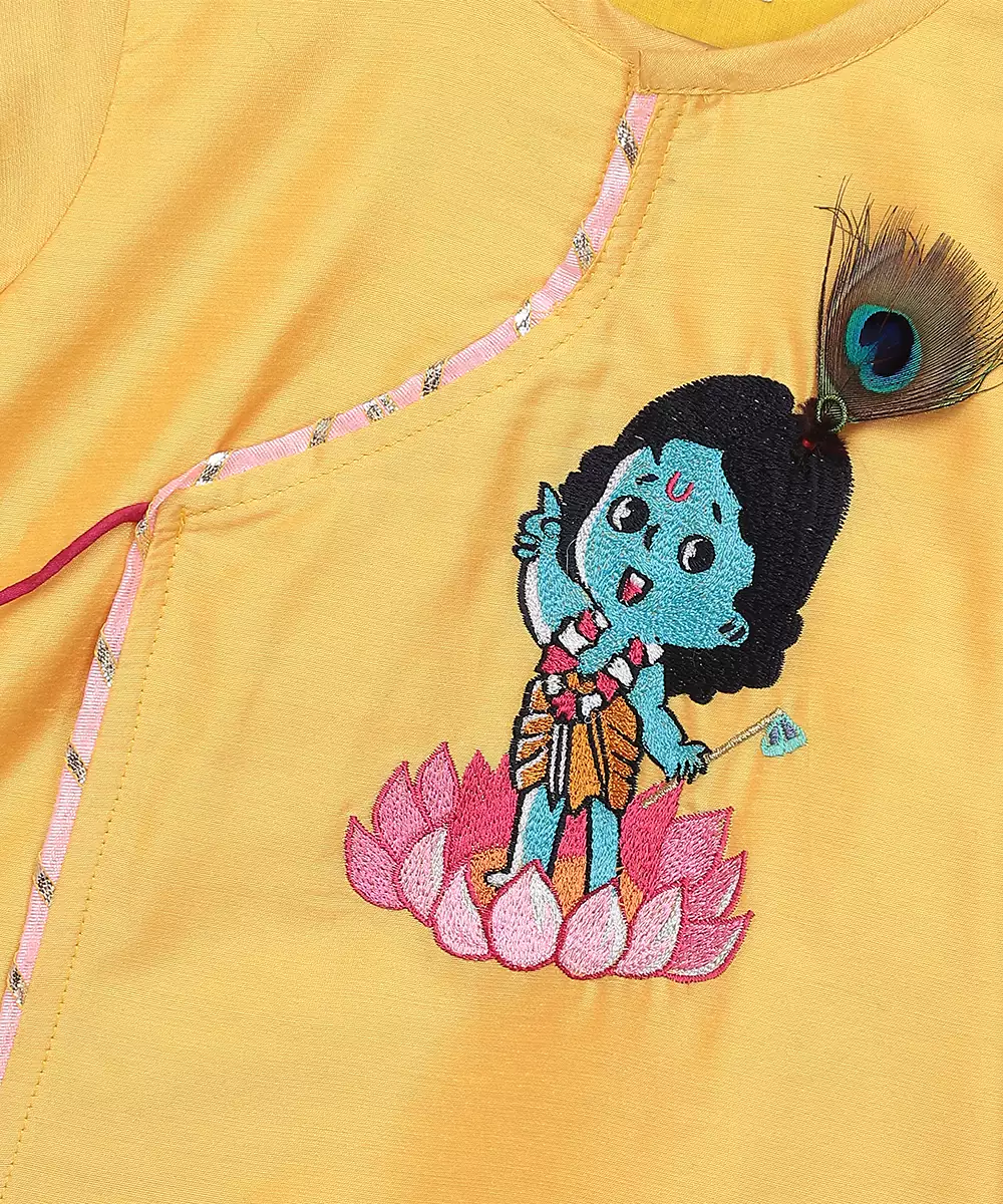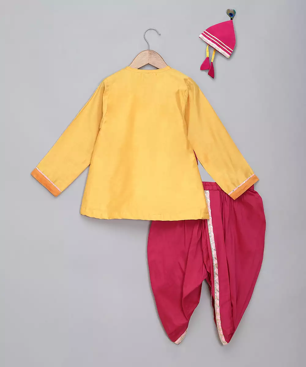Yellow Angrakha Kurta With Krishna Embroidery . Kurta With Lace Finishings.The Set Comes With A Fabric Khadi Printed Mukut . Fuschia Pink Dhoti With Pleating And Contrast Lace Finishings. Bottom With Elasticated Waist