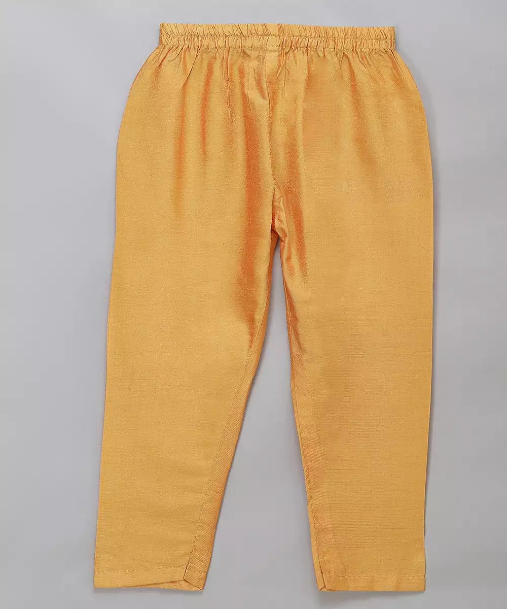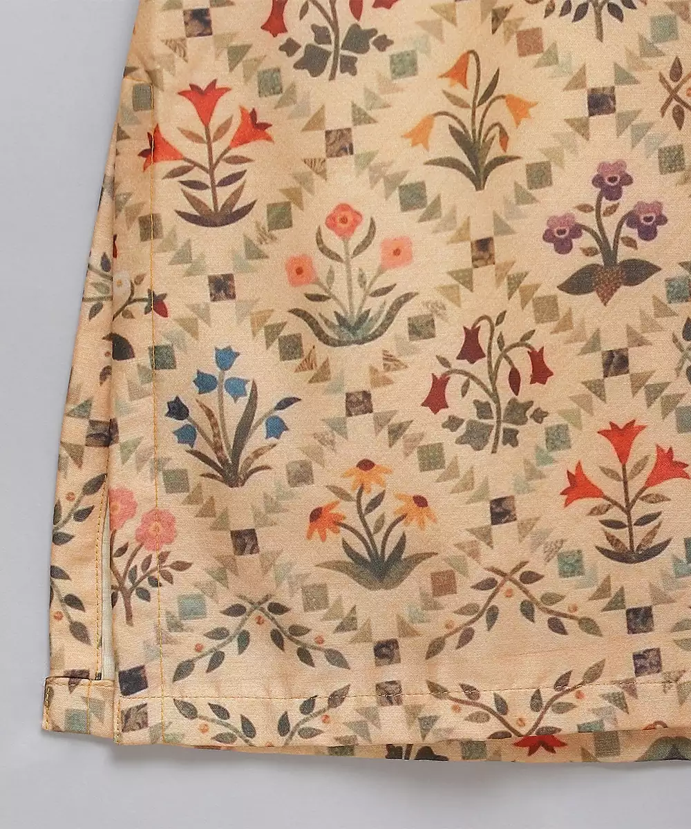 Golden Mughal Printed Front Open Kurta Set With Embroidery On The Pocket. Bottom With Elastic.
