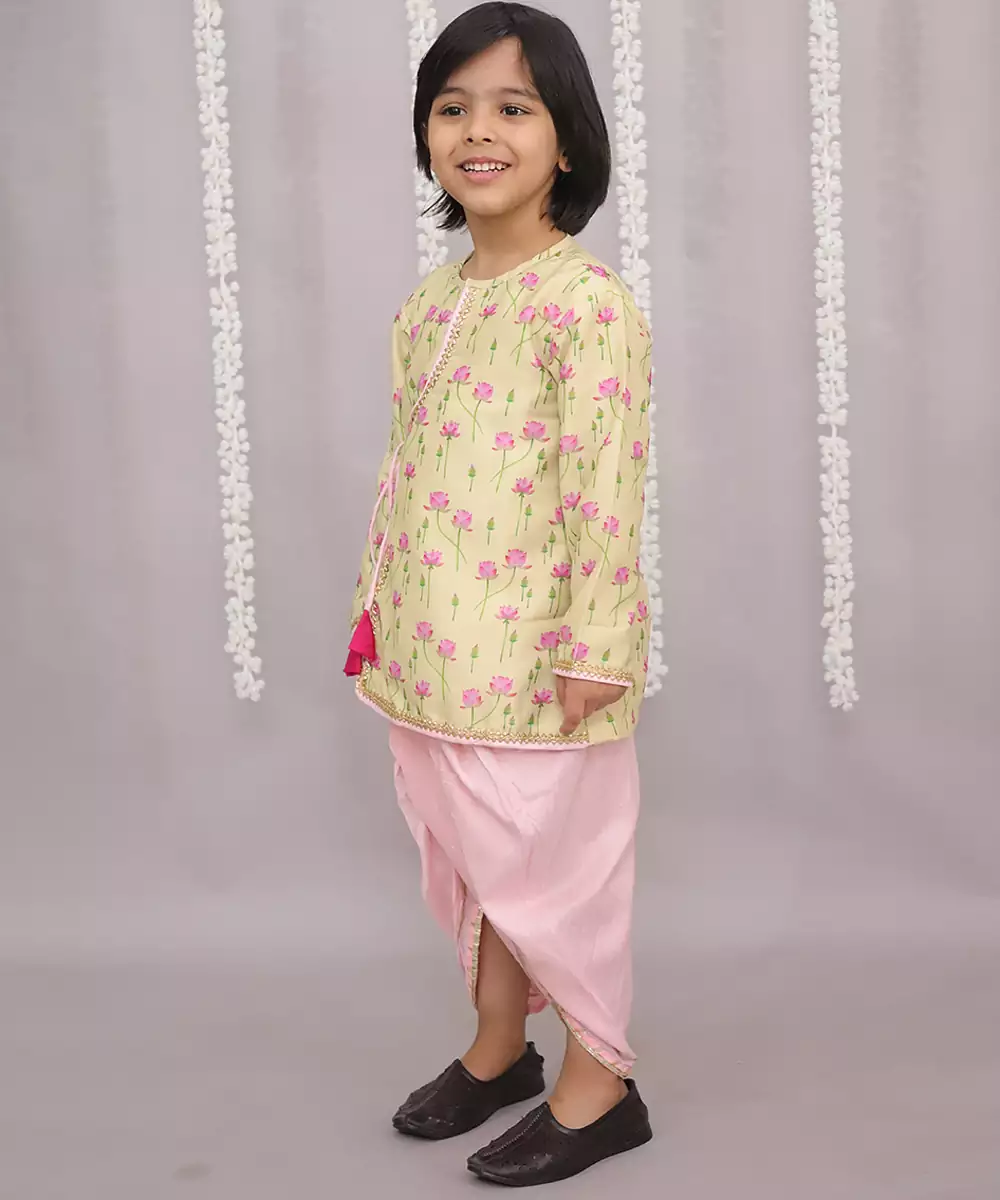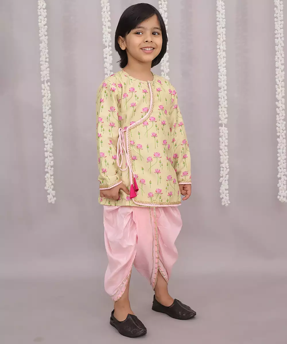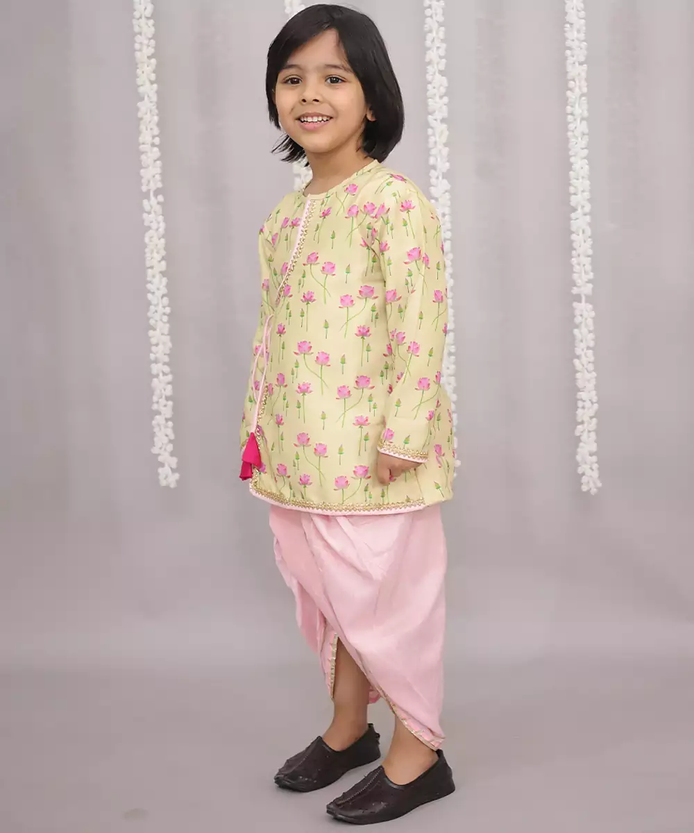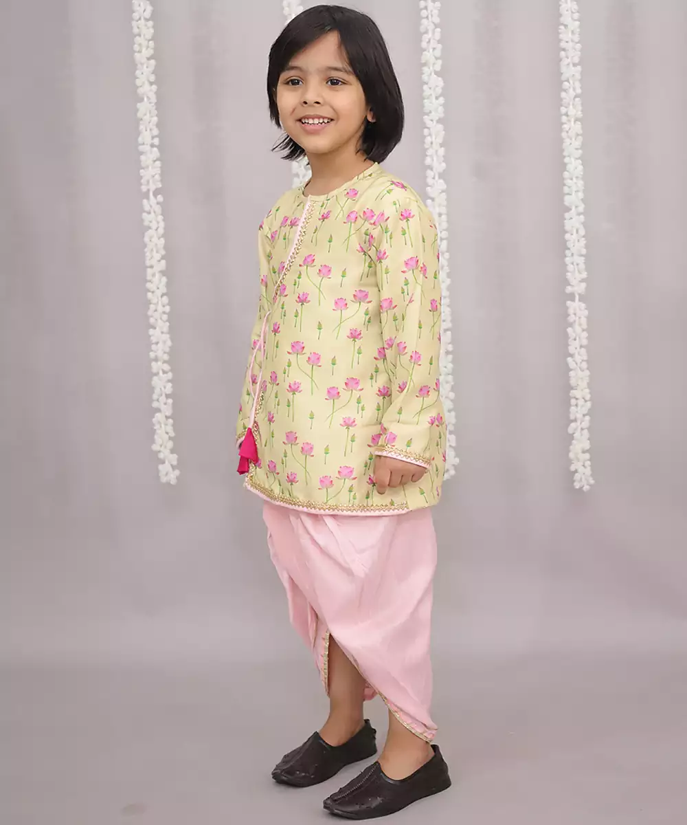 Yellow Lotus Digital Printed Angrakha Kurta With Cotton Lining . Contrast Tassels . Baby Pink Silk Dhoti With Lace Finishings .Bottom With Elastic All Round . Colour: Yellow Fabric:Cotton Silk Components: 1 Kurta / 1 Dhoti