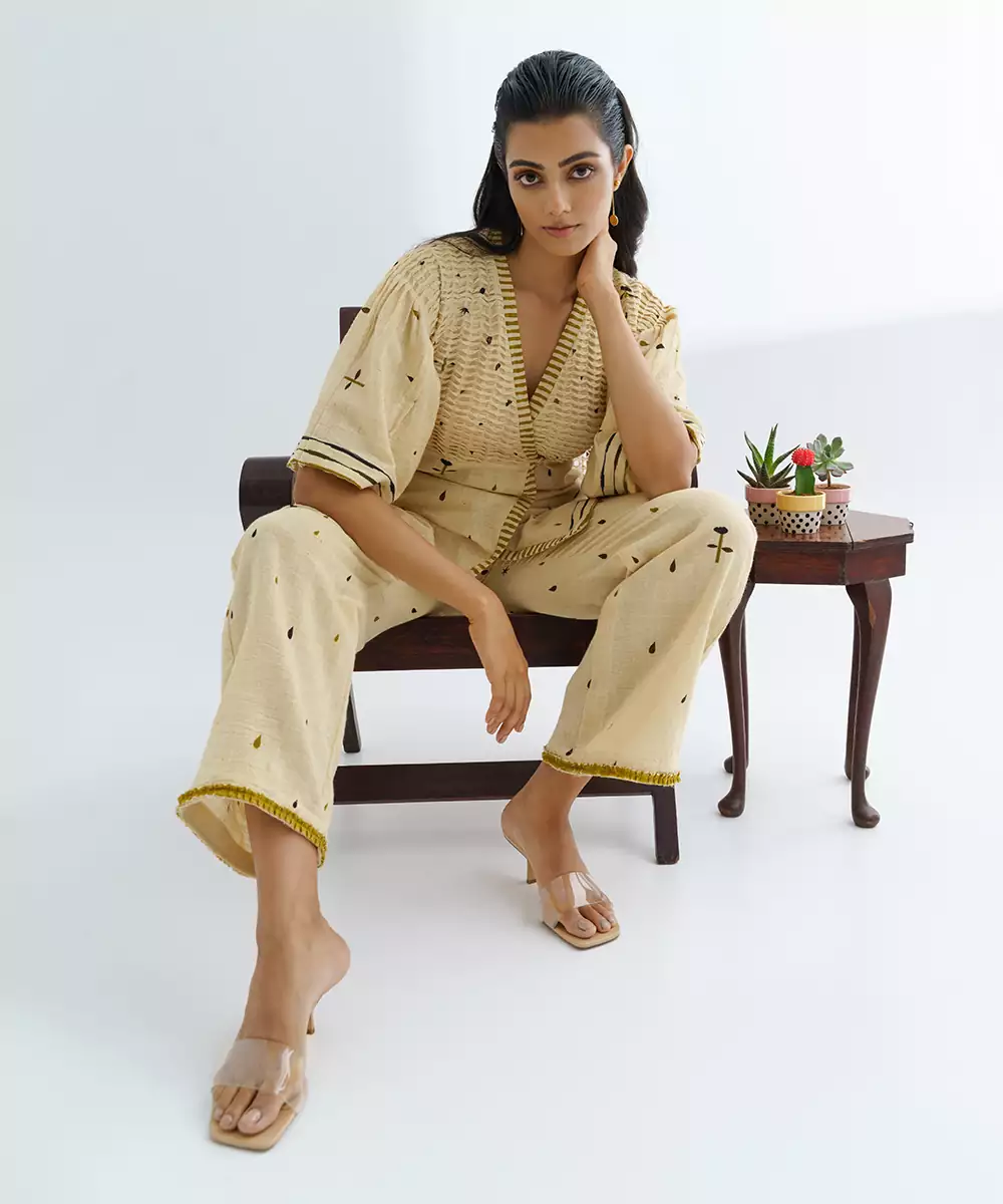 Co Ord Set Are Such A Positive Pattern For Anyone And Everyone With Equal Panache. Keeping The Vibe We Present You A Bell Sleeved Overlayed Top Composed N Hand Screen Printed Khadi With Smoking Details On The Yoke Paired With Matching Trousers.This Co Ord Set Is Sure To Turn Heads Wherever You Go.
