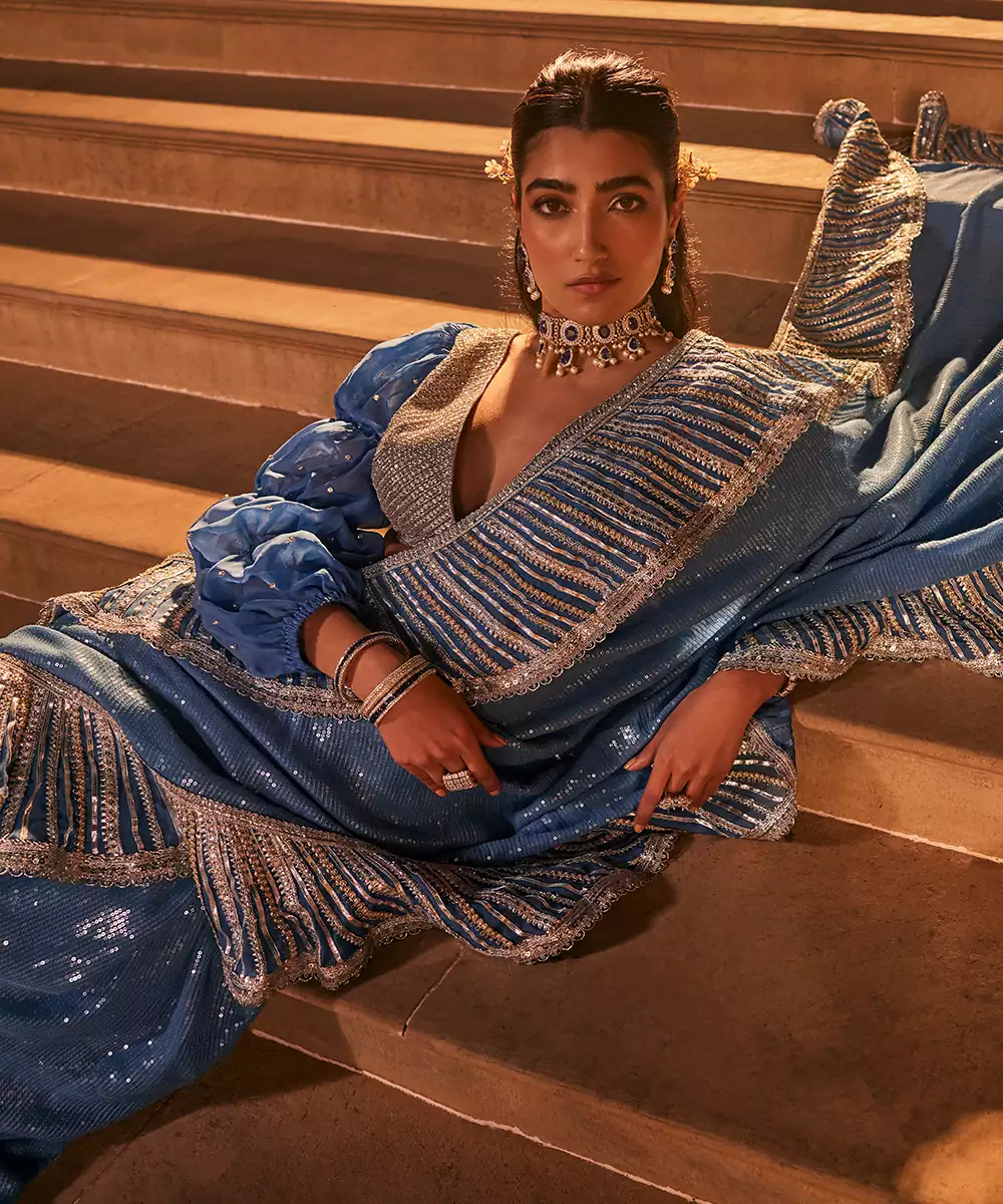 Blue Saree With Sequin Embroidery And A Frilled Border With Gota Patti Lace Detailing. Paired With An Embroidered Padded Blouse With Puffed Sleeves And Pearl Highlights And Petticoat.