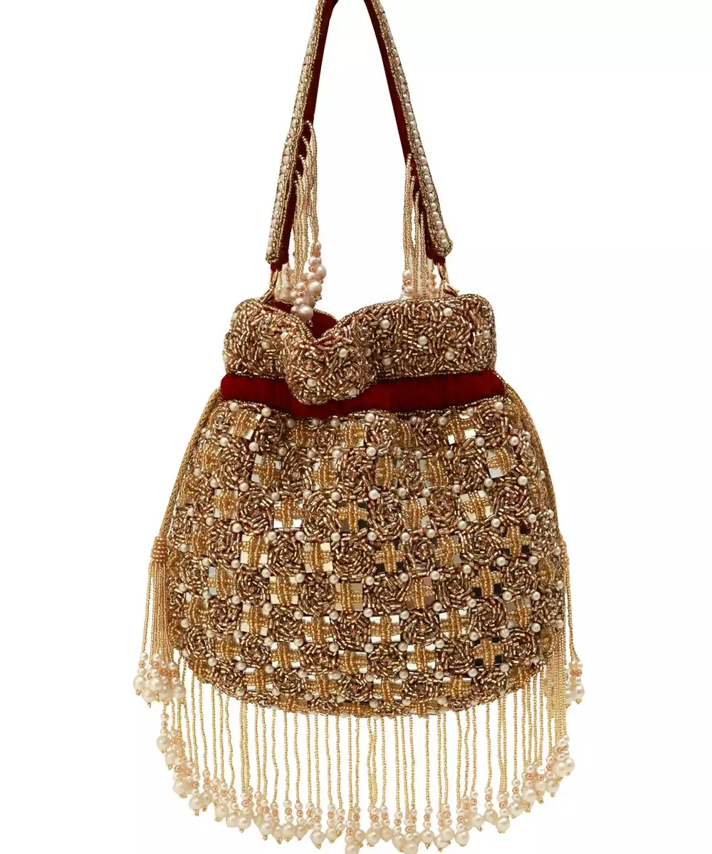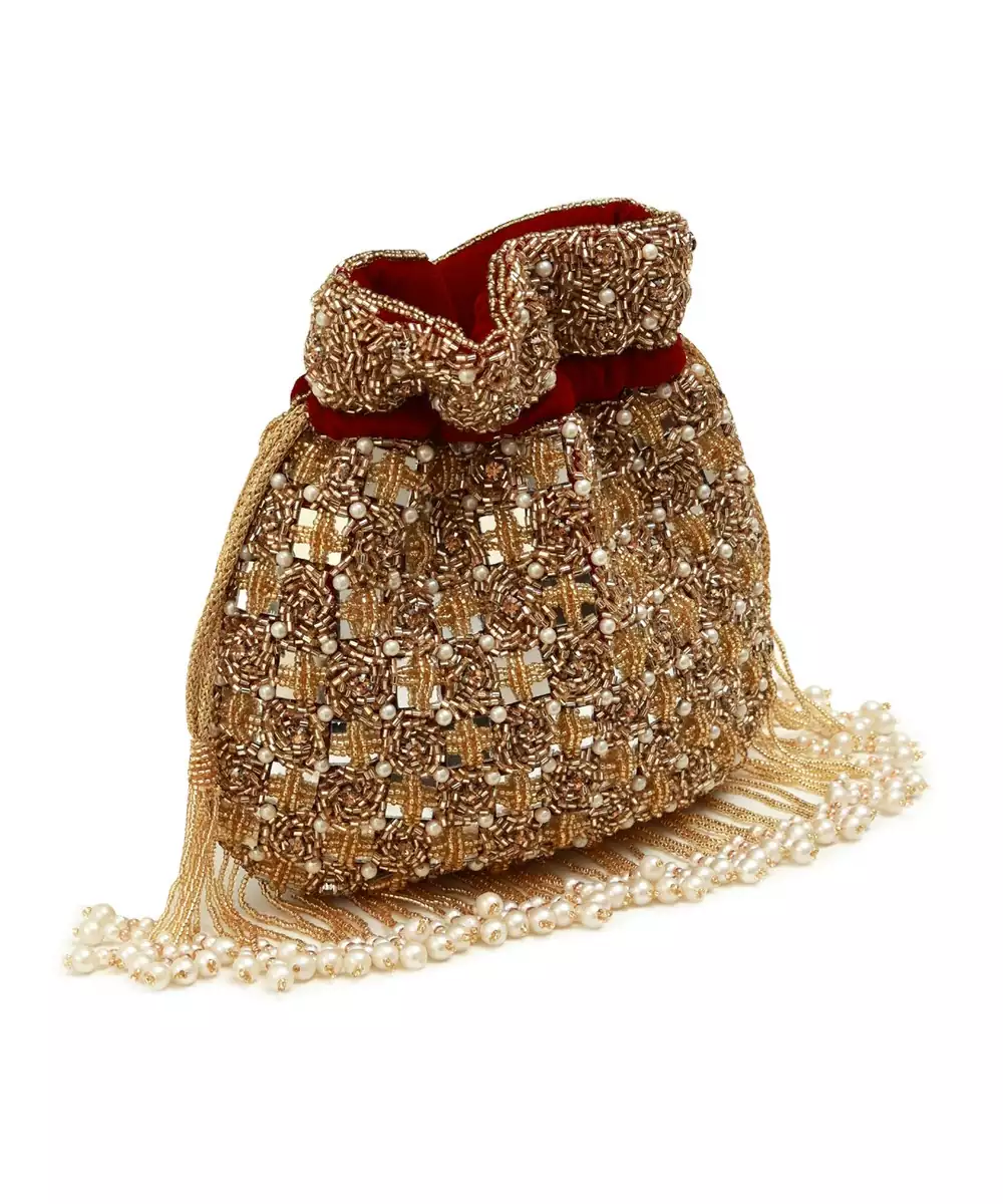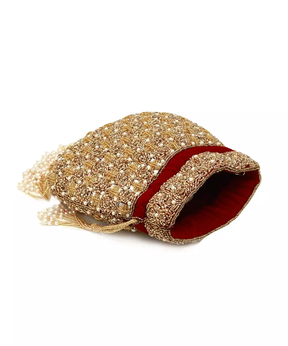 The Sukoon Hand Embroidered Potli With Pearl Handle Is A Beautifully Crafted And Exquisite Accessory That Adds A Touch Of Elegance And Charm To Any Outfit. This Potli Is Meticulously Handcrafted With Attention To Detail, Showcasing The Artistry Of Skilled Artisans.Immerse Yourself In Unparalleled Elegance And Sophistication As You Indulge In This Awe Inspiring Accessory, Meticulously Crafted To Captivate Hearts And Turn Heads.The Outside Of The Potli Is Decorated With Intricate Handwork, Showcasing Delicate Patterns And Designs. The Embroidery Uses High Quality Materials, Giving The Pouch A Rich And Captivating Appearance. The Motifs Can Range From Traditional Symbols Inspired By Indian Culture To Modern Designs, So You Can Choose A Style That Reflects Your Taste.