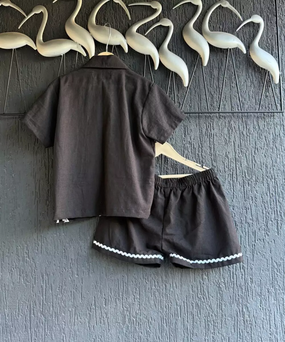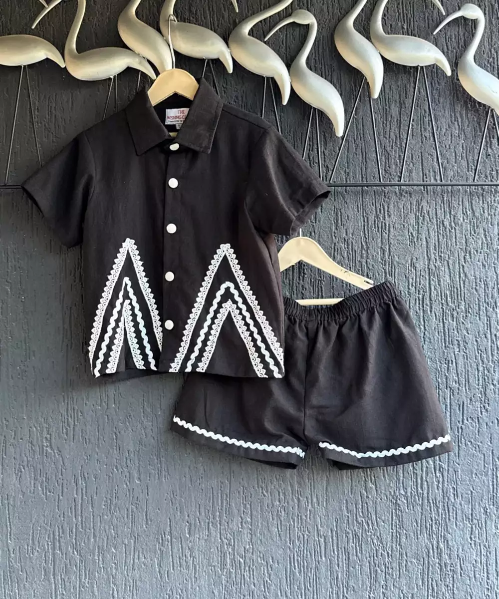 Black Slub Shirt With Crochet Lace Patch With And Front Opening Buttons .Shorts Also In Cotton Slub With A Lace Finishing At The Hem And Elastic All Over Give It A Complete Loom And Makes You Feel Comfortable And Trendy At The Same Time