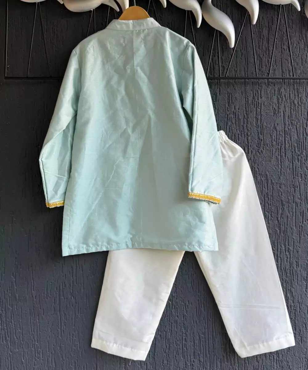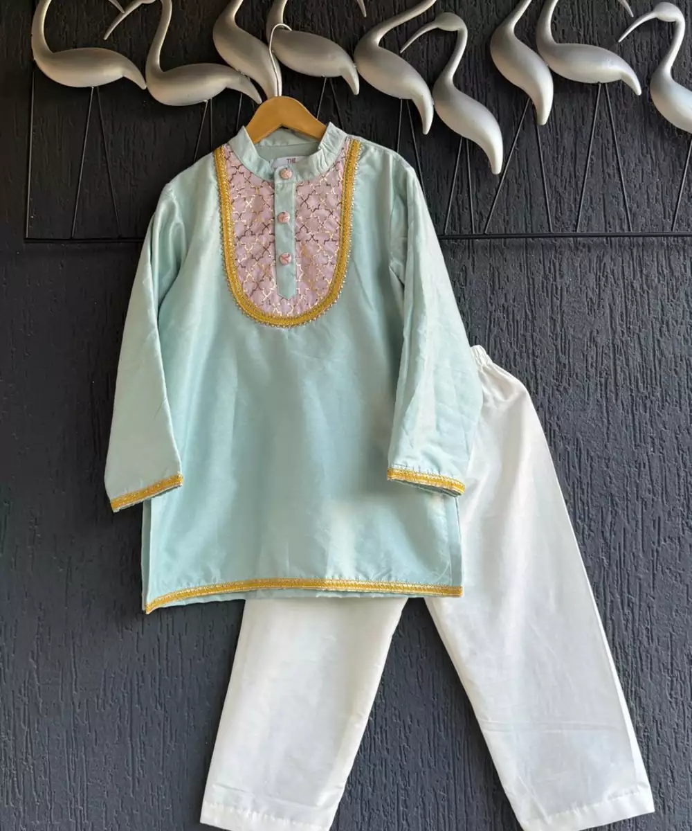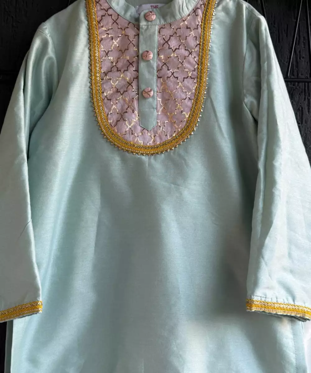 The Kurta Is Crafted From Soft Powder Blue Cotton Silk Fabric, Featuring A Beautifully Chanderi Pink Yoke Adorned With Intricate Gold Thread Work That Adds A Regal Touch. Accentuated With Matching Decorative Buttons And Delicate Gold Trim On The Cuffs And Hemline, This Kurta Combines Comfort With Festive Style. Paired With Crisp White Pajamas