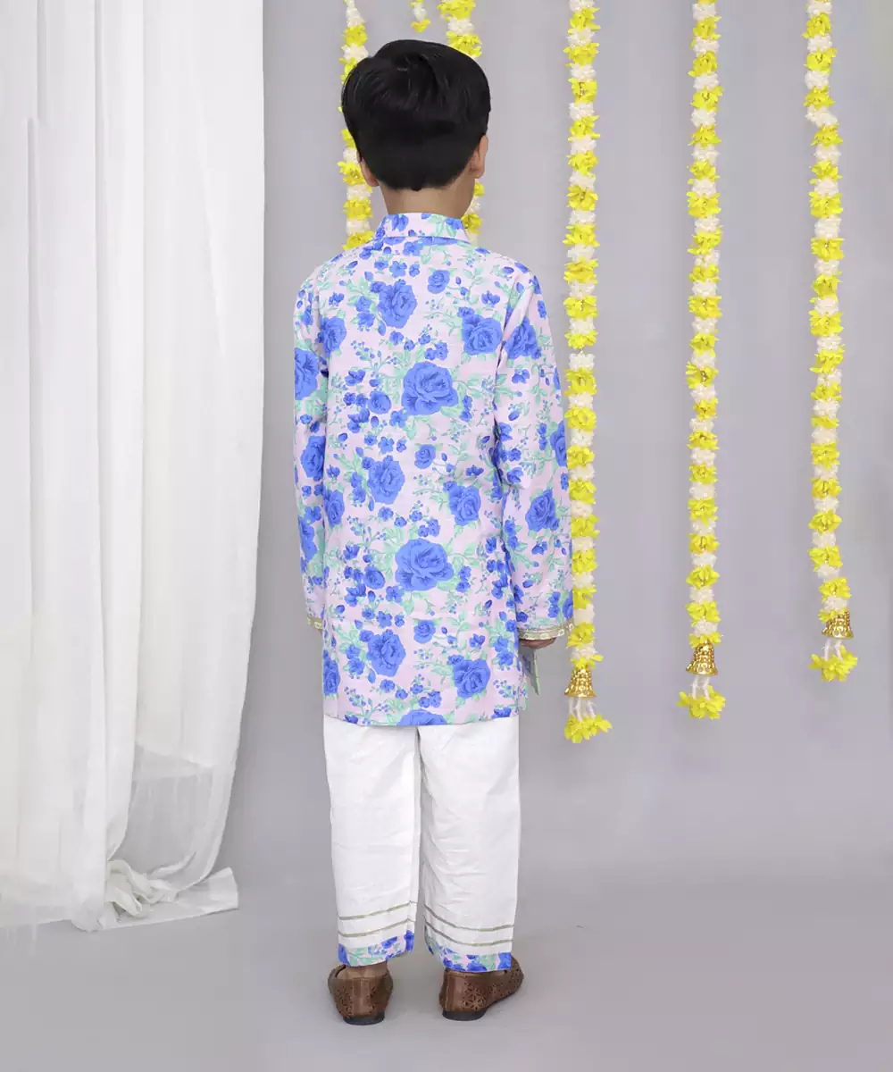 Blue Green Floral Vibrant Cotton Kurta With Front Placket Accentuated With A Beautiful Lace Around It .Kurta Comes With Full Sleeves. Kurta Comes With Contrasting Color Hem With Gota Work On It .White Cotton Bottom With Elasticated Waist And Printed Hems Gives It A Complete Look For Your Perfect Occasion