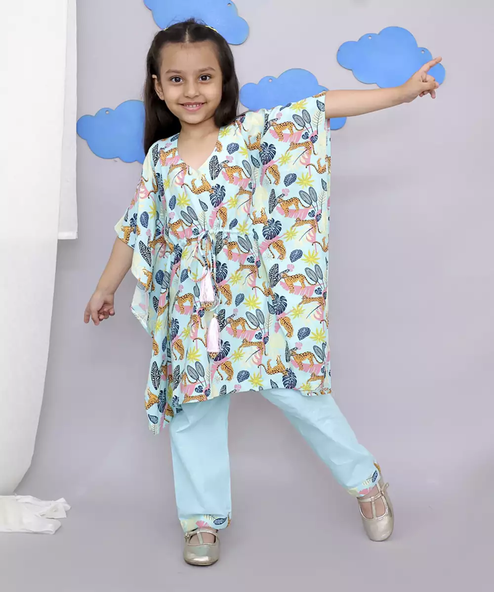 Blue Tiger Print Vibrant Cotton Kaftan With Front Adjustable Tie Ups Around The Waist , Comes With A Beautiful Resham Tassels. Blue Cotton Bottom With Elastic Waist And Printed Hems Gives It A Complete Look For Summers