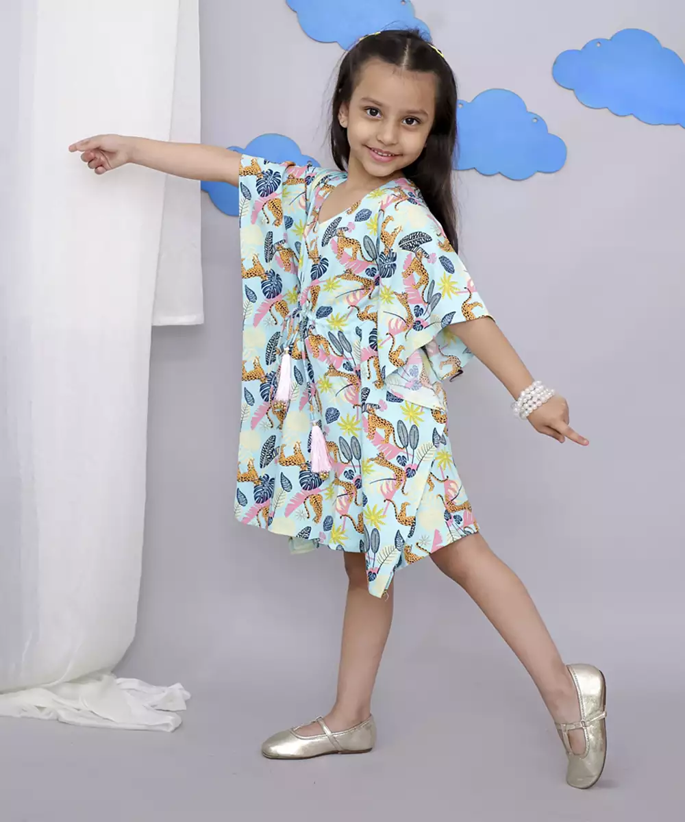 Blue Tiger Print Vibrant Cotton Kaftan With Front Adjustable Tie Ups Around The Waist , Comes With A Beautiful Resham Tassels.Perfect For Beach Wear And Hot Summers