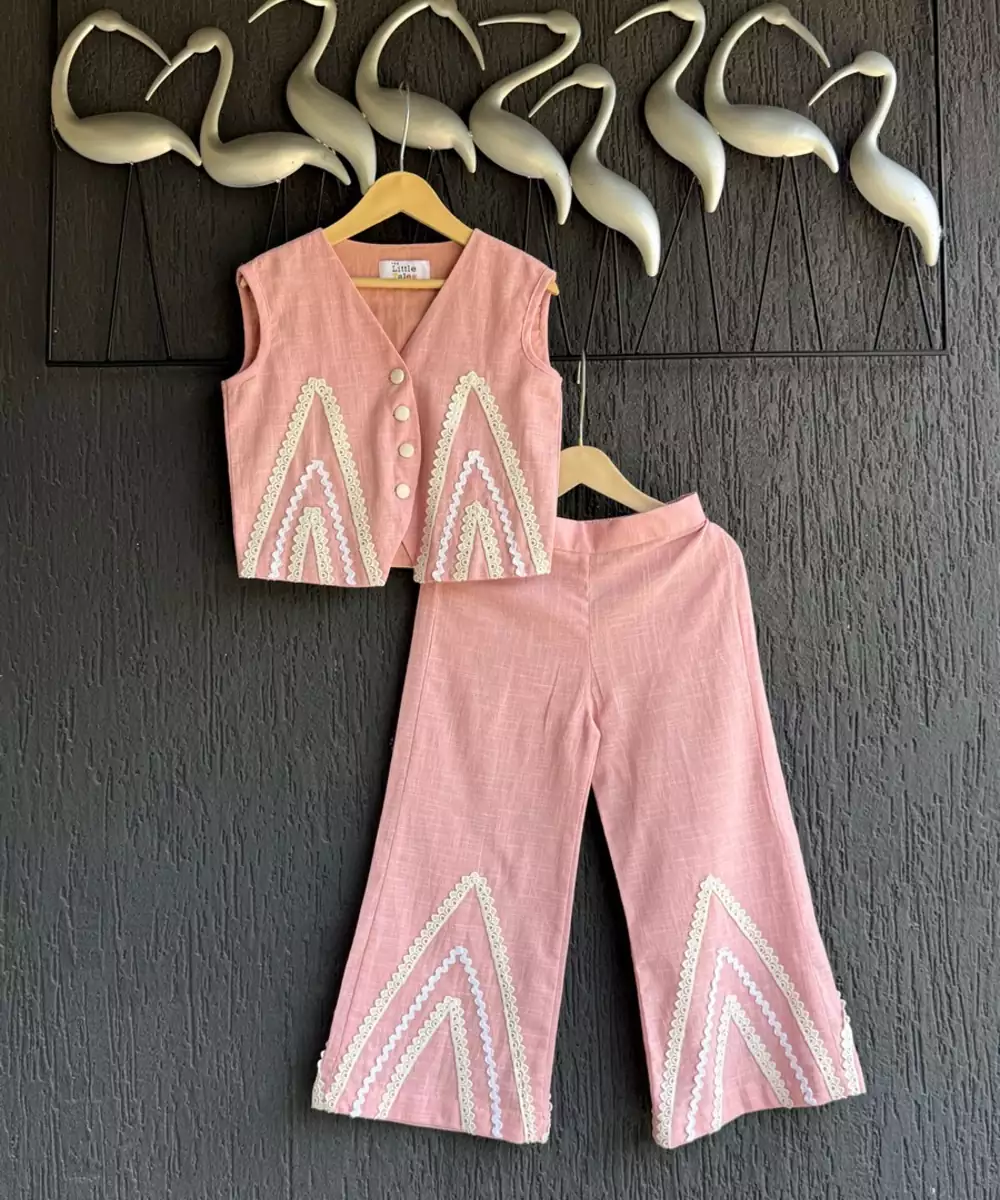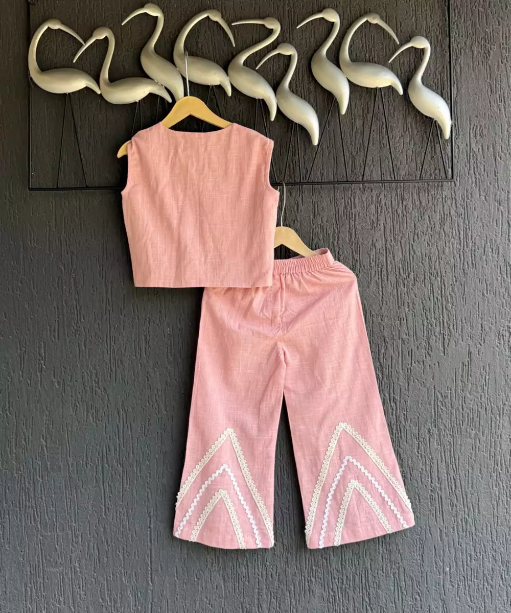 Pink Slub Co Ord Set For Girl Is A Perfect Blend Of Indo Western Cut Where The Girls Will Look Trendy Yet Comfortable .. The Crochet Lace Patch Work On The Top And Bottom Makes It Look More Appealing . Front Opening Top. Elastic And Belt At The Bottom