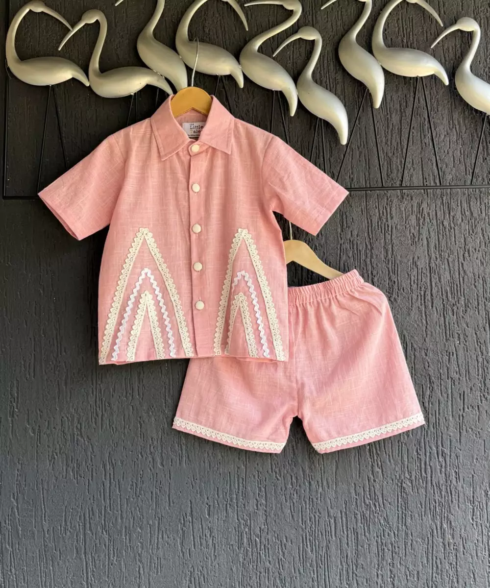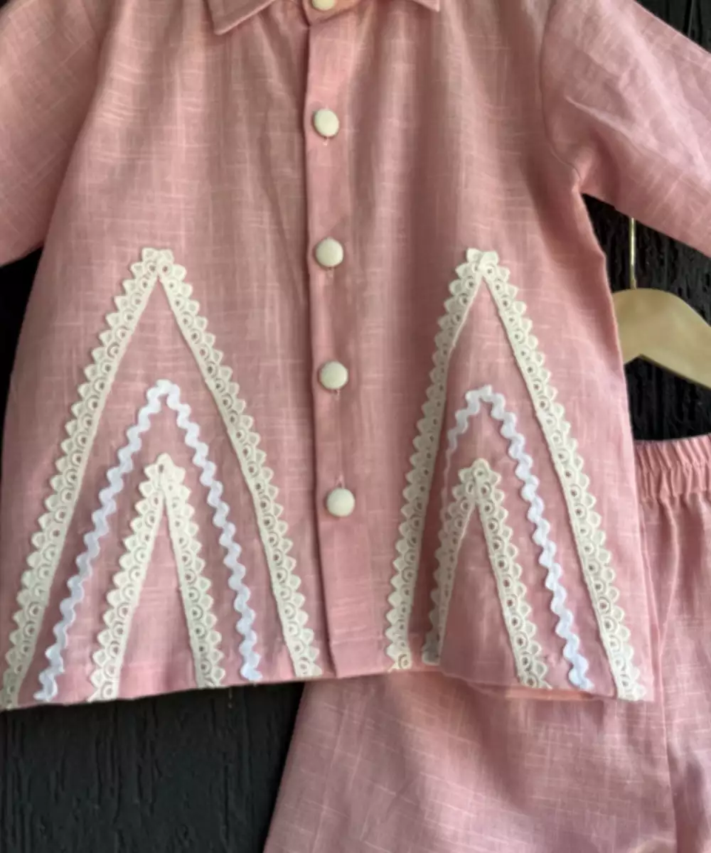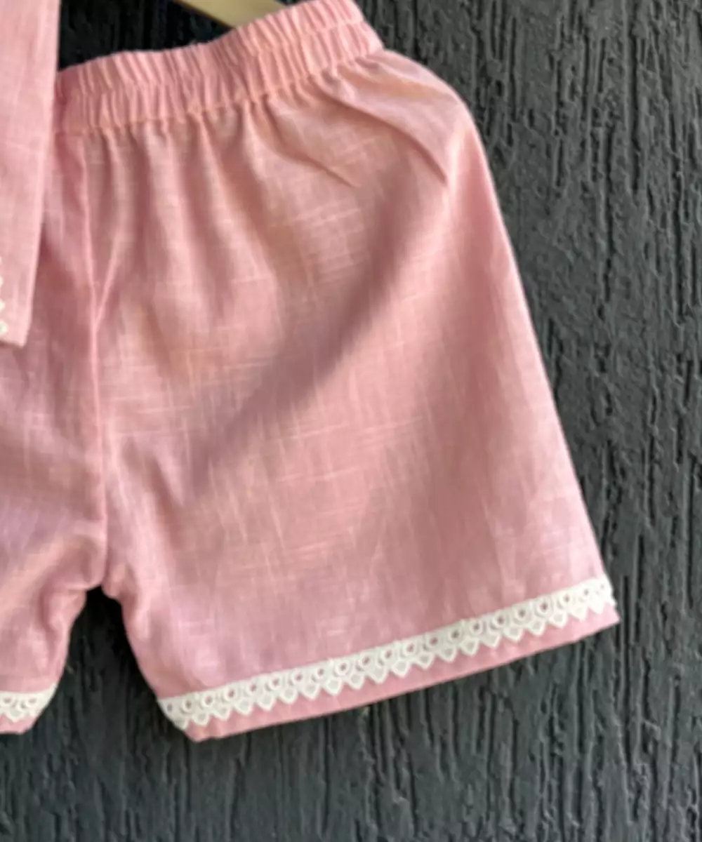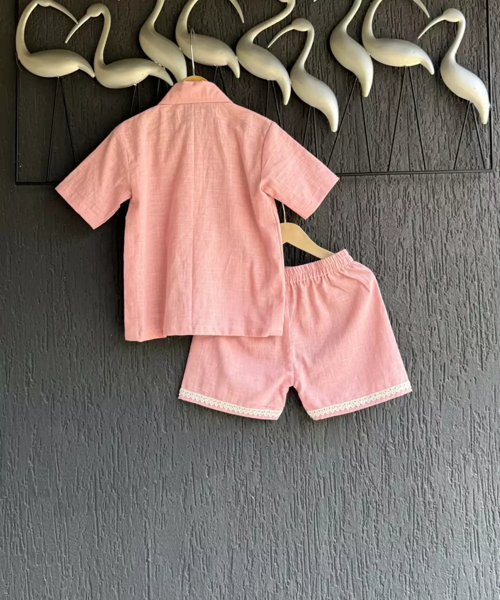 Pink Slub Shirt With Crochet Lace Patch With And Front Opening Buttons .. Shorts Also In Cotton Slub With A Lace Finishing At The Hem And Elastic All Over Give It A Complete Loom And Makes You Feel Comfortable And Trendy At The Same Time