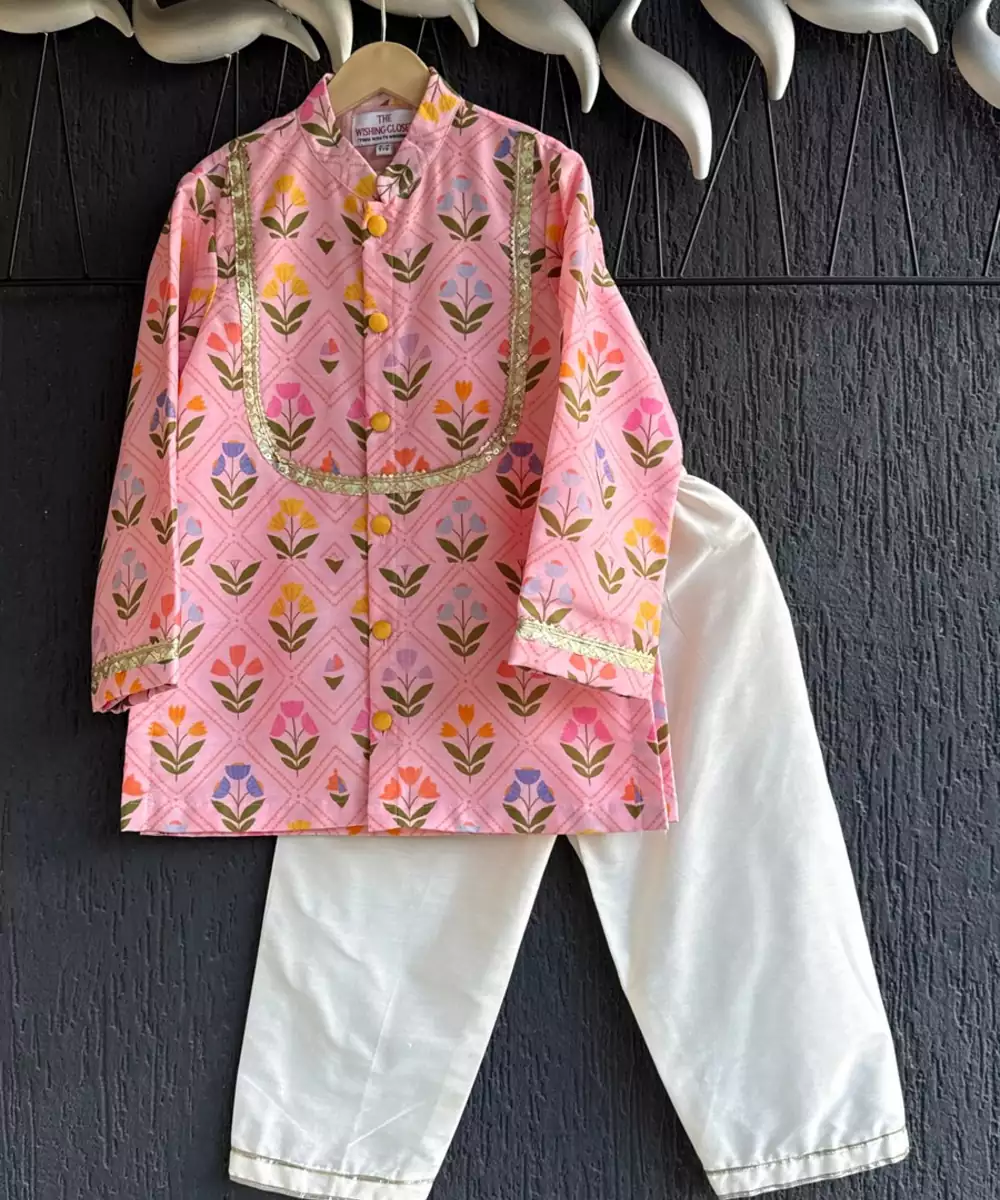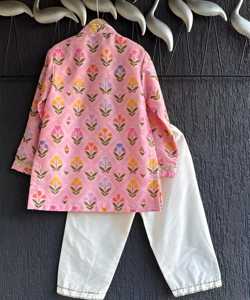 Pink Geometric Flower Print Kurta Set With Lace Finishings . Kurta With Full Sleeves.Kurta With Full Front Opening .Kurta With Cotton Lining. Off White Cotton Silk Pyjama With Lace Finishings . Bottom With Elasticated Waist