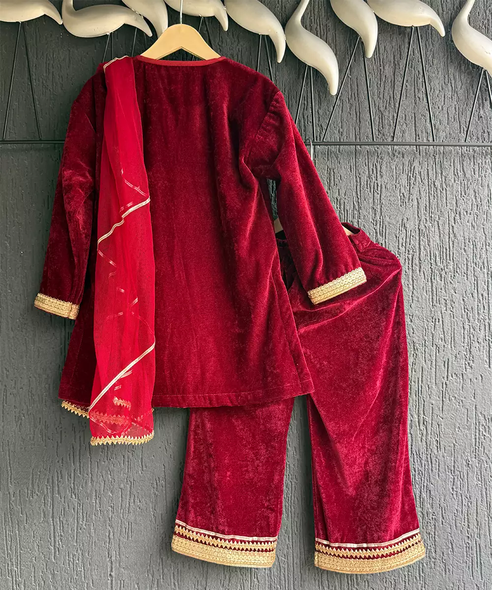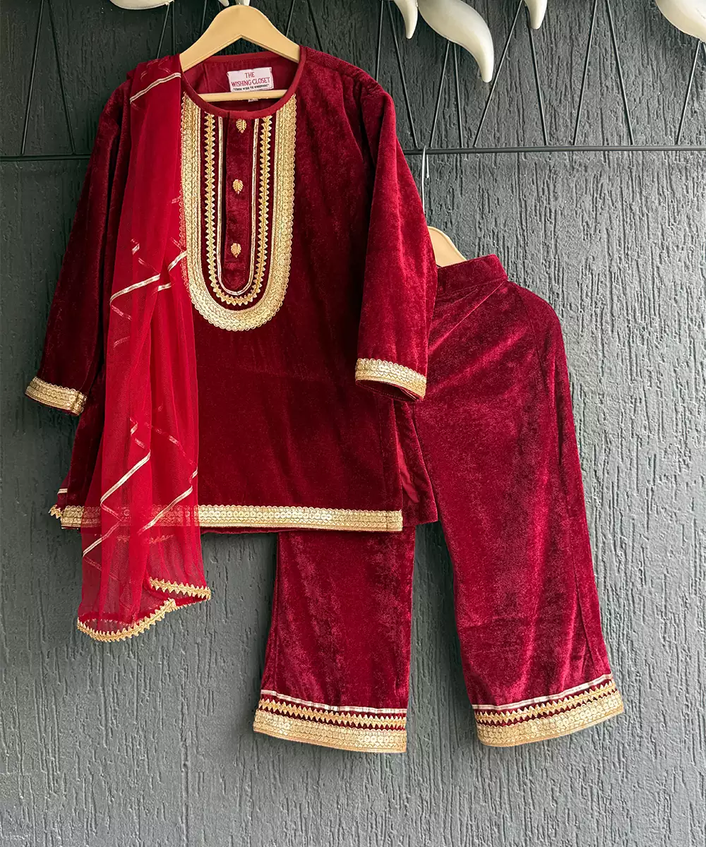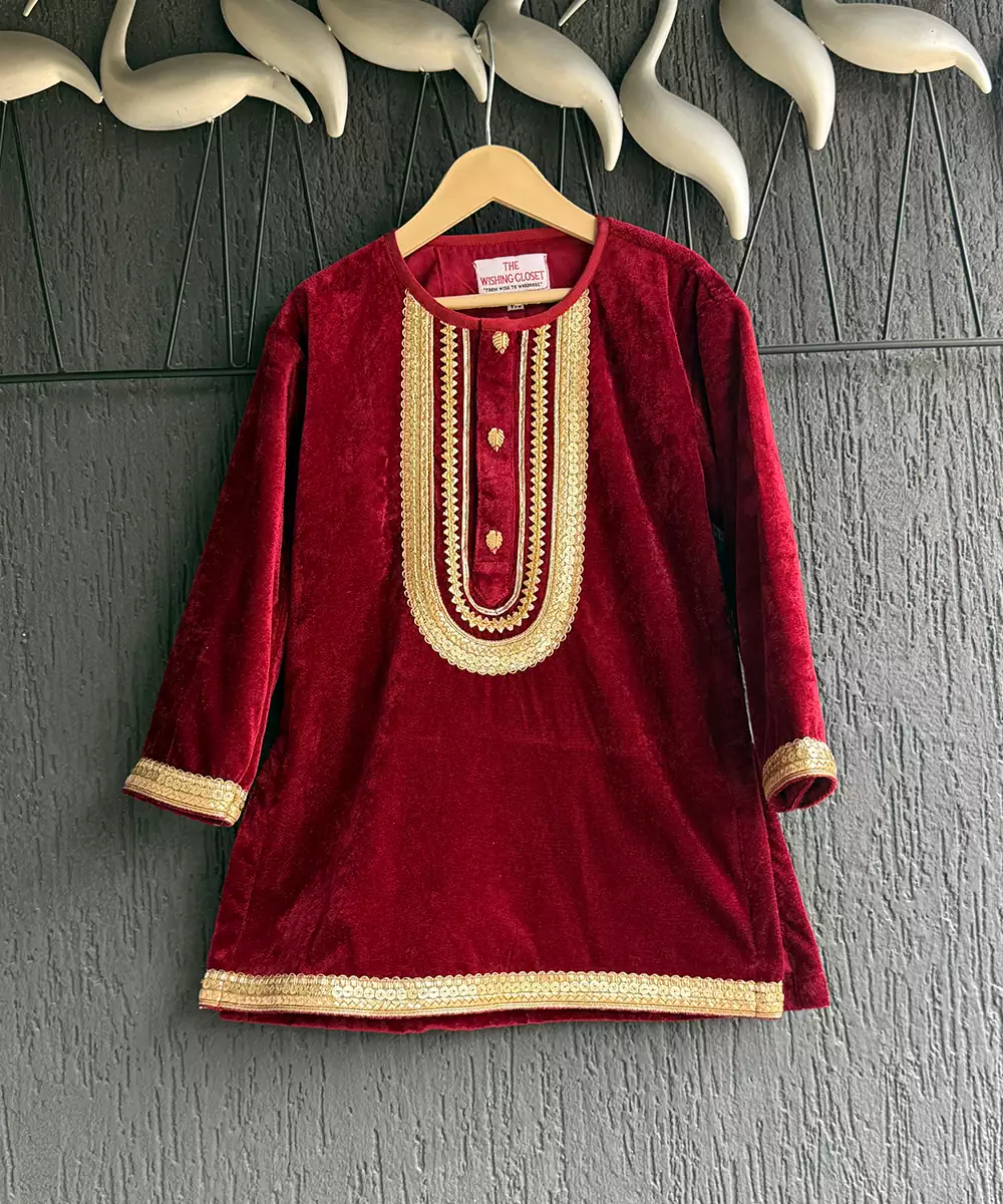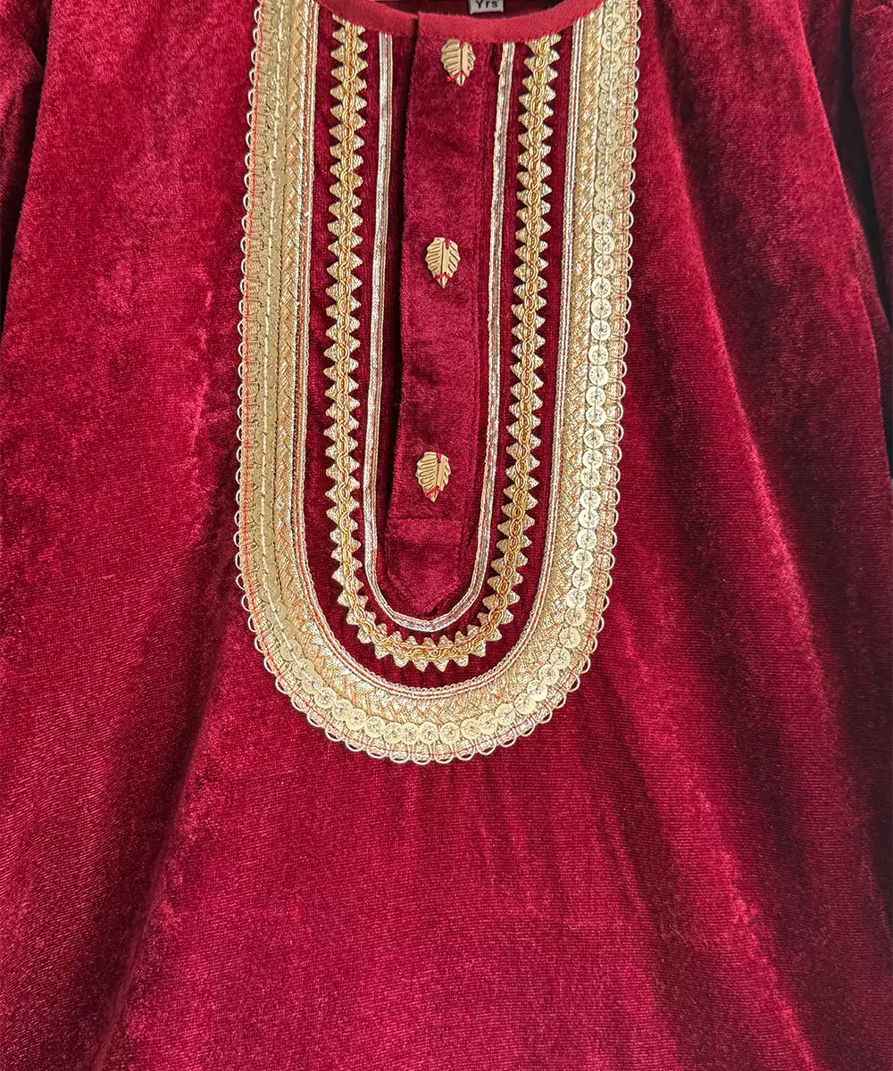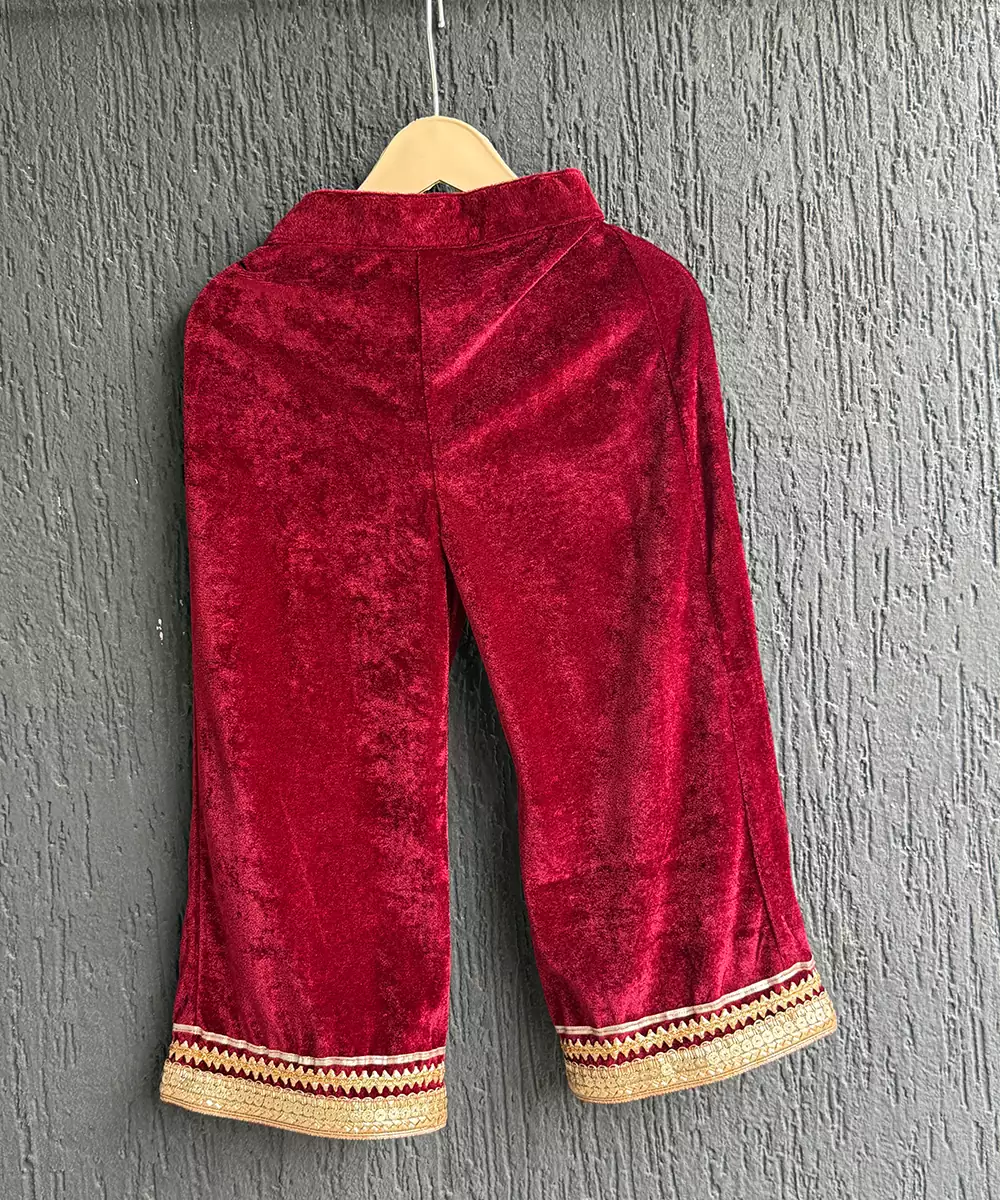 This Red Embroidered Velvet Kurta Set Exudes Regal Elegance And Festive Grandeur. Crafted From Rich, Plush Velvet, It Features Intricate Embroidery That Enhances Its Luxurious Appeal. The Tailored Kurta Paired With Coordinated Bottoms Creates A Sophisticated Silhouette, Making It Perfect For Weddings, Celebrations, Or Special Festive Occasions With Timeless Charm.