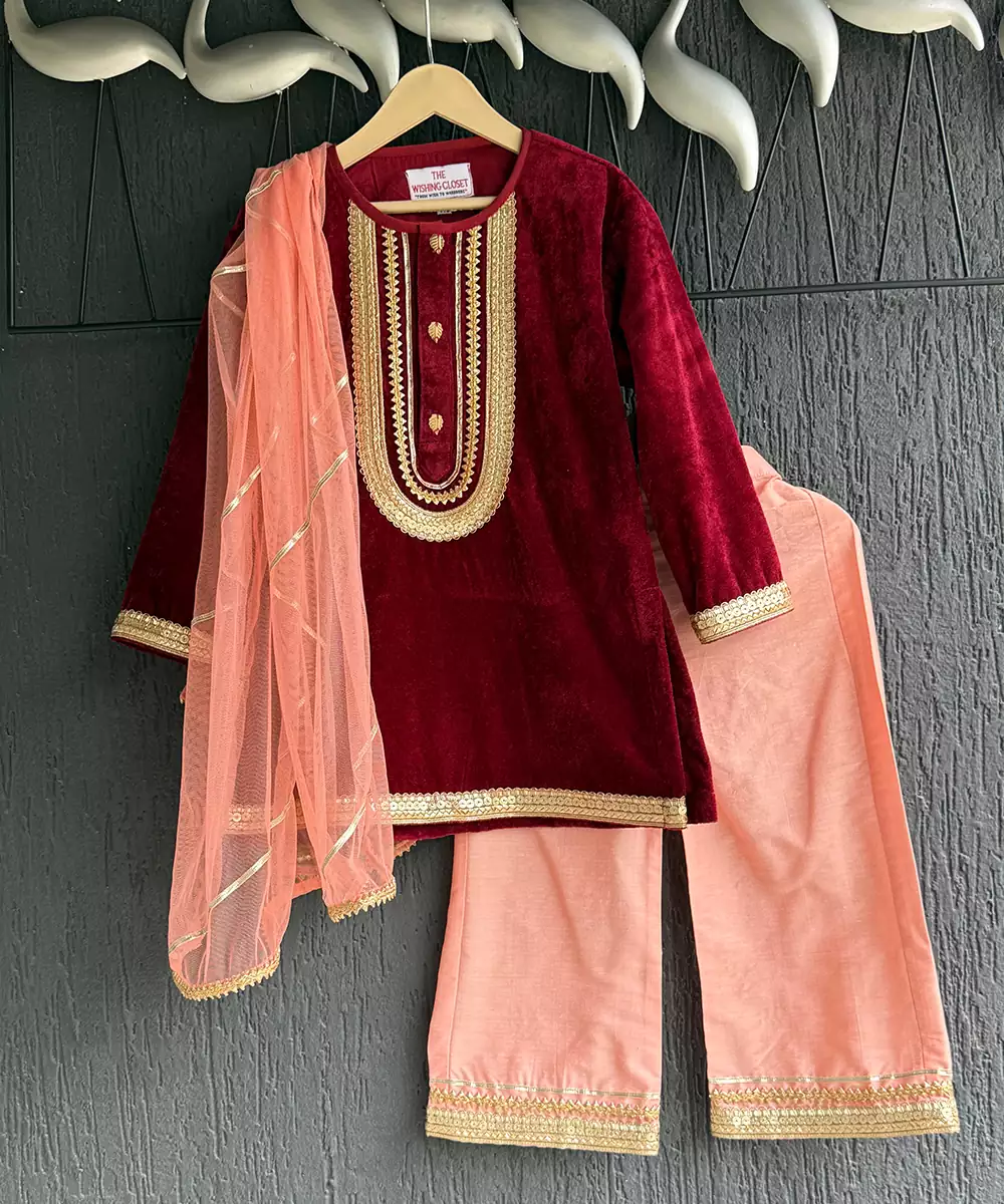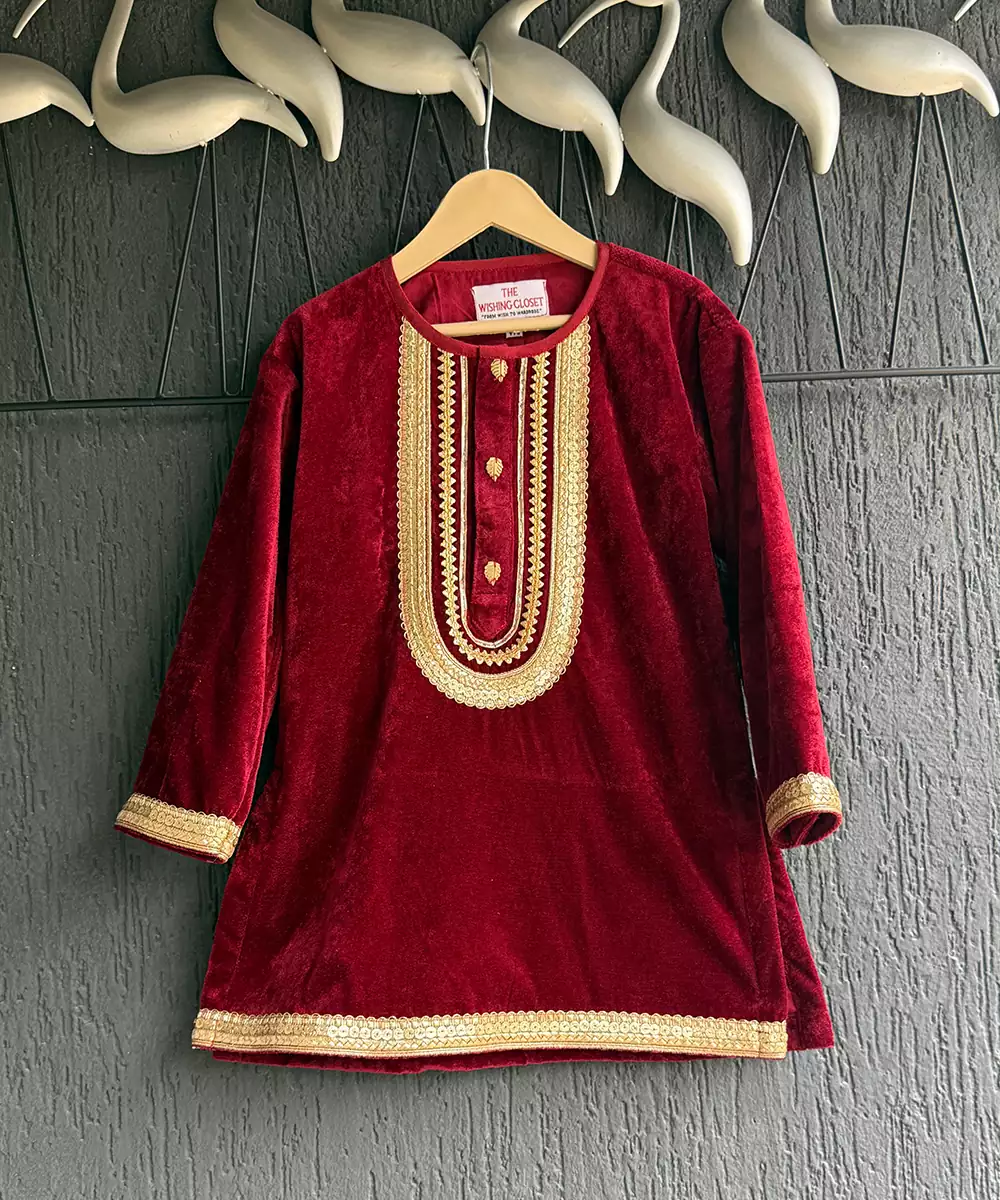 This Red Embroidered Velvet Kurta Set Exudes Regal Elegance And Festive Grandeur. Crafted From Rich, Plush Velvet, It Features Intricate Embroidery That Enhances Its Luxurious Appeal. The Tailored Kurta Paired With Coordinated Bottoms Creates A Sophisticated Silhouette, Making It Perfect For Weddings, Celebrations, Or Special Festive Occasions With Timeless Charm.
