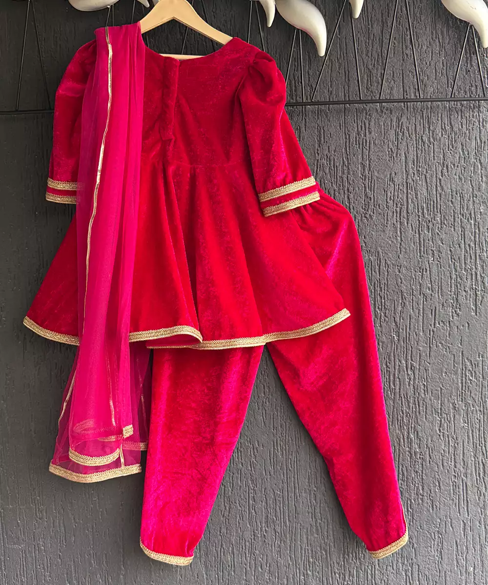 This Red Embroidered Velvet Kurta Set Exudes Regal Elegance And Festive Grandeur. Crafted From Rich, Plush Velvet, It Features Intricate Embroidery That Enhances Its Luxurious Appeal. The Tailored Kurta Paired With Coordinated Bottoms Creates A Sophisticated Silhouette, Making It Perfect For Weddings, Celebrations, Or Special Festive Occasions With Timeless Charm.