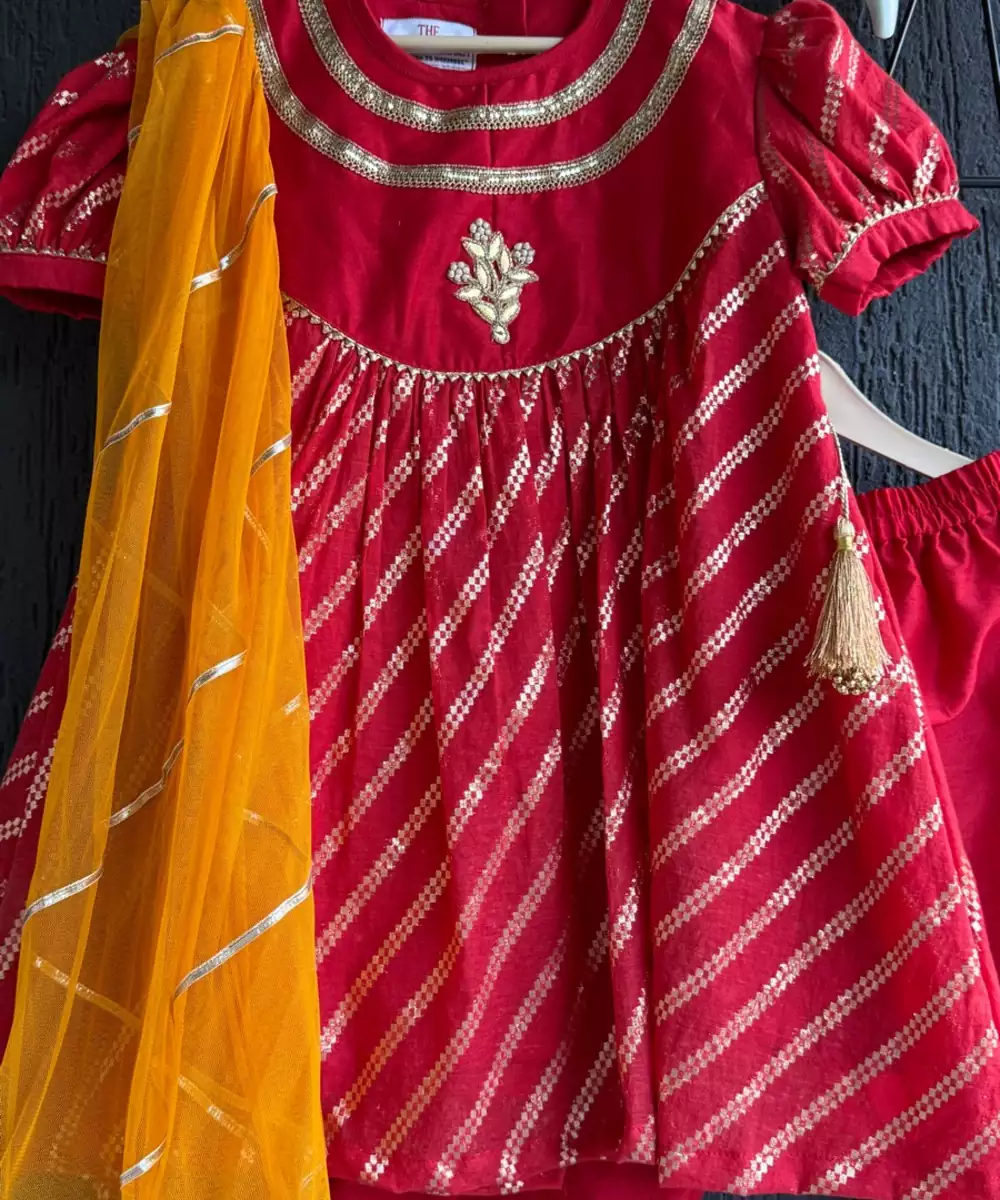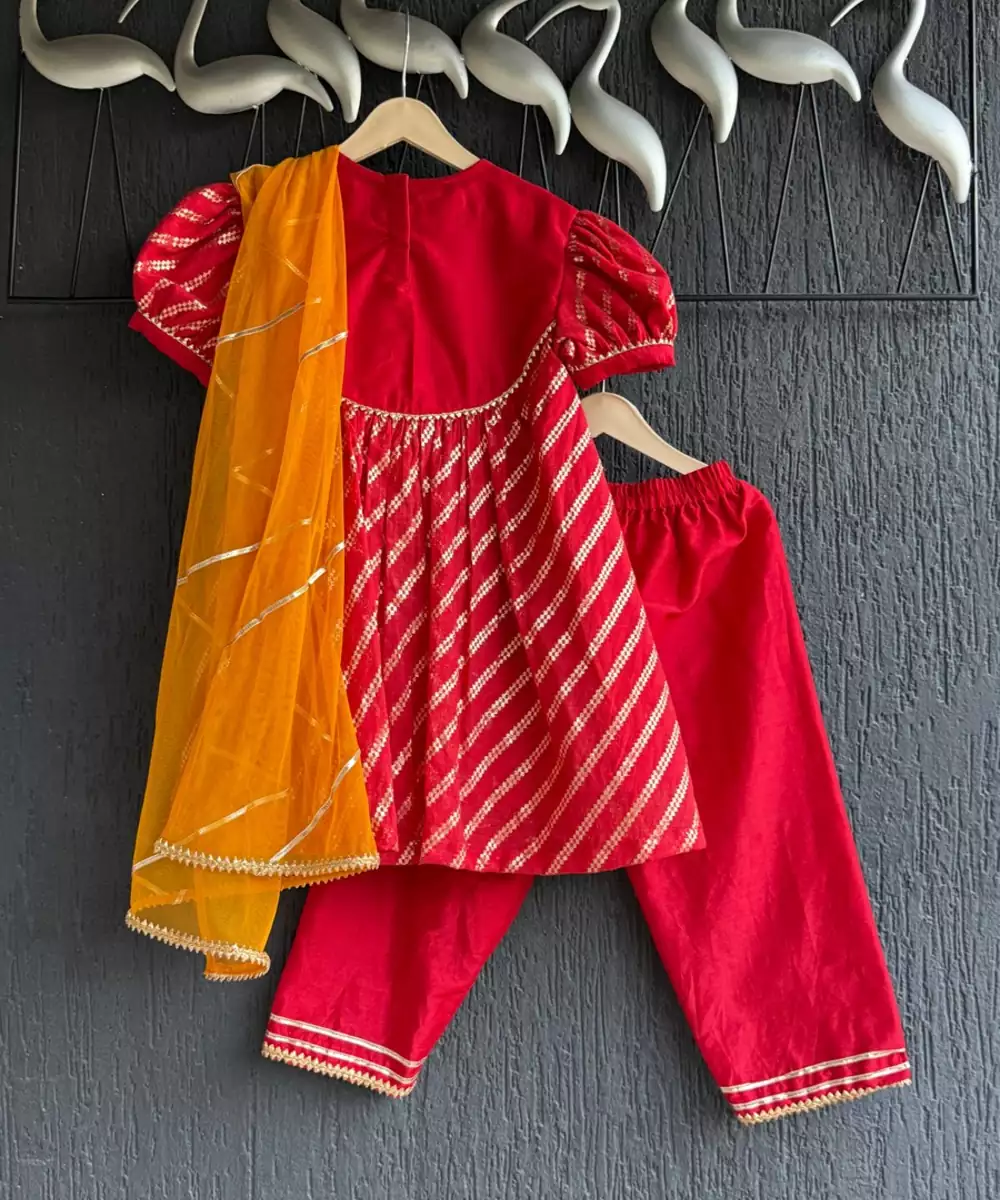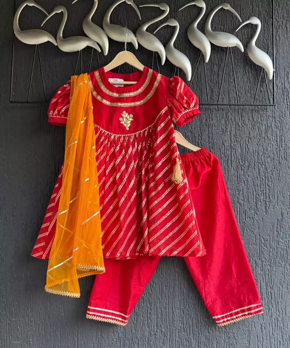 This Vibrant Girls' Ethnic Set Features A Red Kurta With Gold Diagonal Stripes, Intricate Embroidery On The Yoke, And Puffed Sleeves With Cotton Lining. It Comes With Matching Red Pants Accented With Gold Lace At The Hem And A Bright Orange Net Dupatta Finished With Gold Gota Detailing