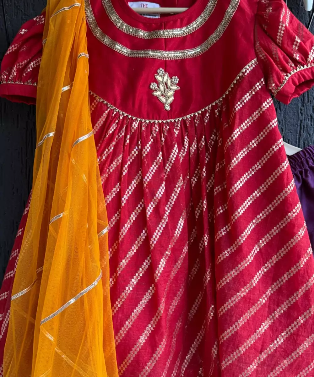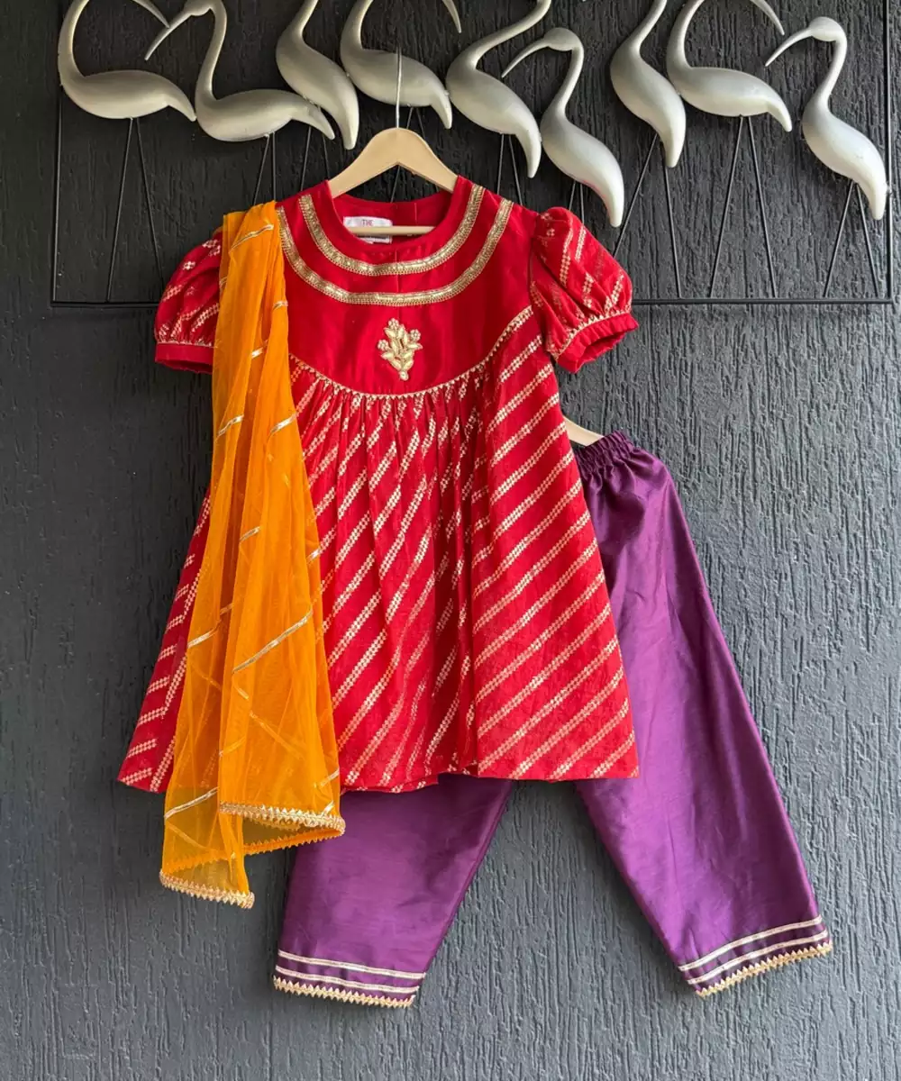 This Festive Girls' Outfit Features A Red Kurta With Golden Diagonal Stripes, Puff Sleeves, And A Delicate Embroidered Motif On The Front And Cotton Lining. The Neckline Is Highlighted With Layered Gold Gota Detailing For Added Elegance. It Is Paired With Contrasting Purple Pants Trimmed With Gold Lace At The Hem And A Vibrant Orange Net Dupatta Finished With Gota Borders