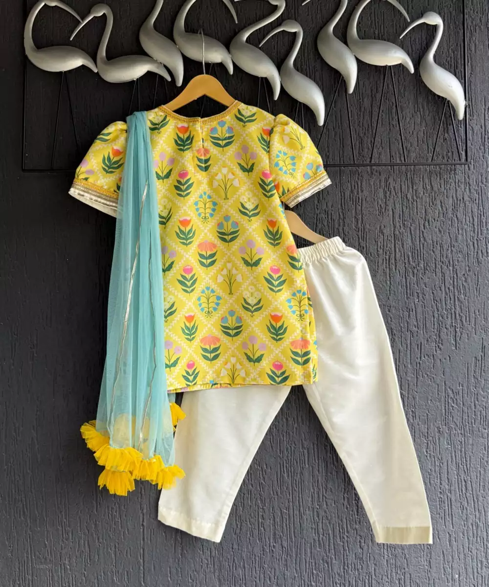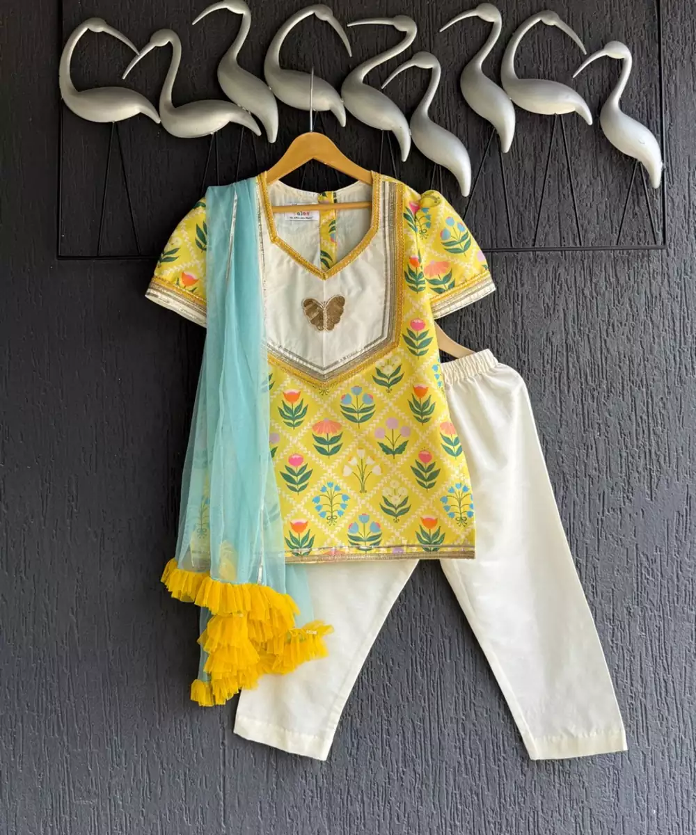 Yellow Multi Flower Print Front Opened Kurta With Lace Finishings And Butterfly Patch . Kurta With Half Sleeves.Kurta With Front Opening .Kurta With Cotton Lining. Off White Pyjama With Lace Finishings . Bottom With Elasticated Waist. Blue Colour Net Chunni To Make It A Complete Festive Look