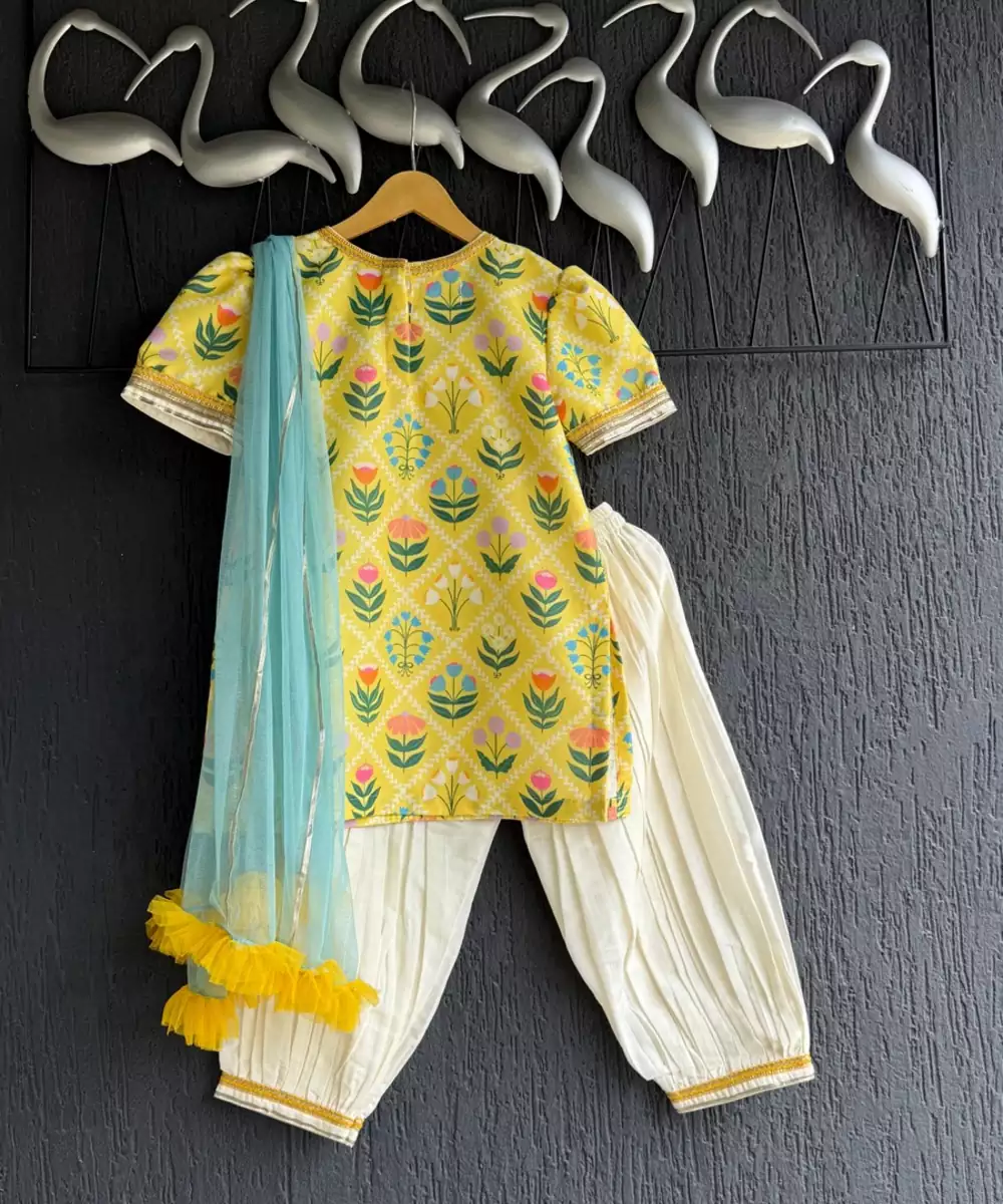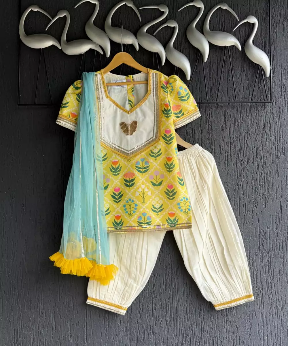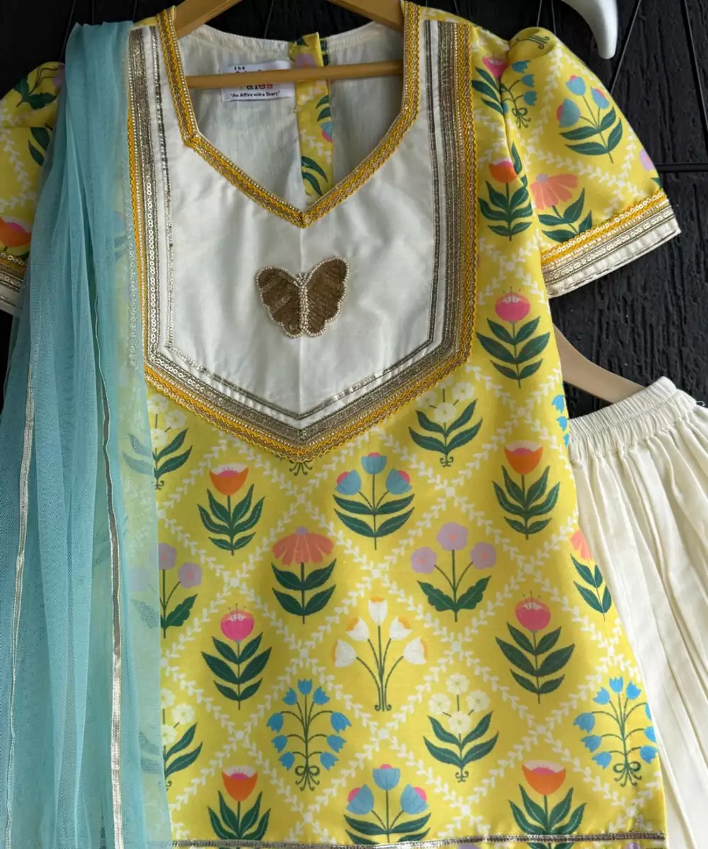 Yellow Multi Flower Print Front Opened Kurta With Lace Finishings And Butterfly Patch . Kurta With Half Sleeves.Kurta With Front Opening .Kurta With Cotton Lining. Off White Salwar With Lace Finishings . Bottom With Elasticated Waist. Blue Colour Net Chunni To Make It A Complete Festive Look