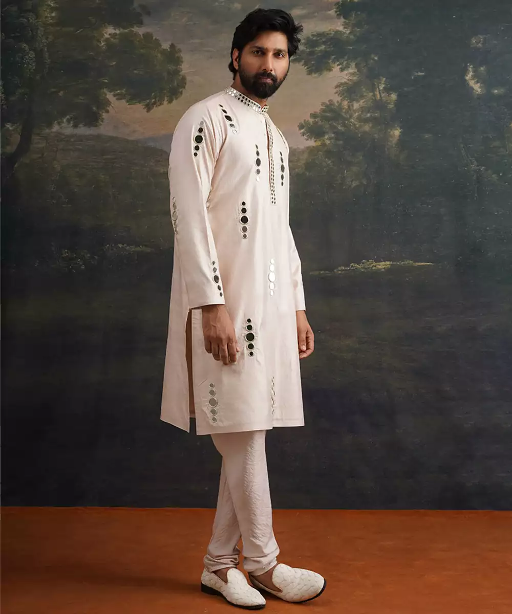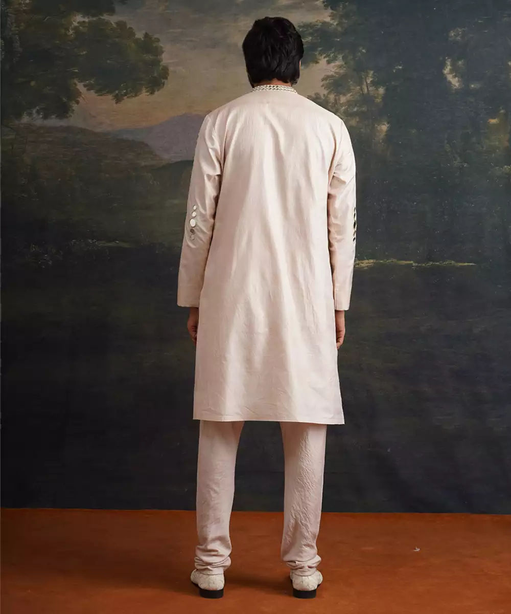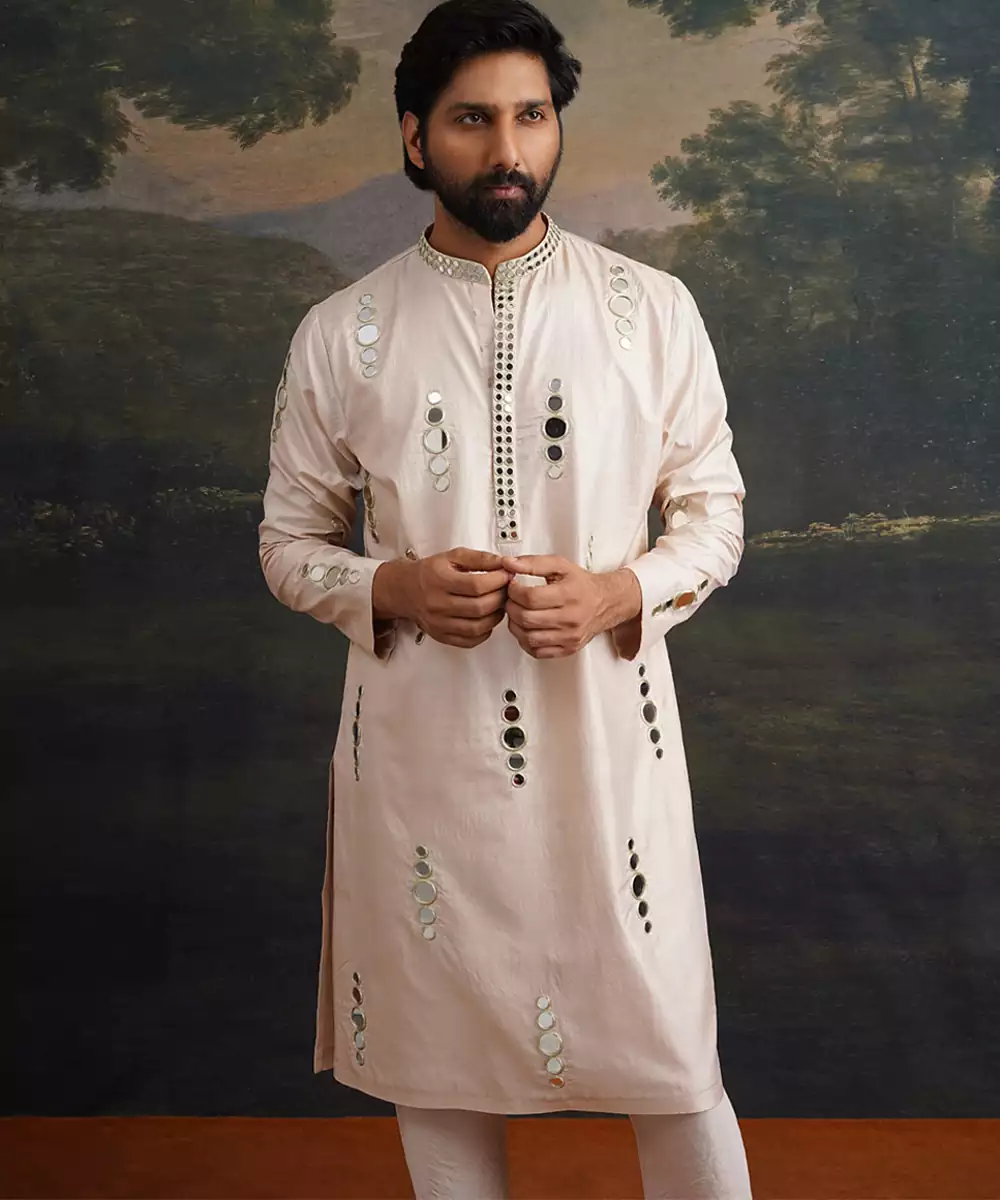 A Beautifully Crafted Ensemble That Combines Elegance With Artisanal Detailing. This Beige Kurta Set Is Made From Premium Fabric And Features Exquisite Embellishments With Mirror Work, Adding A Subtle Sparkle And Graceful Texture. Perfect For Festive Occasions, Celebrations, Or Elegant Gatherings, This Set Offers Timeless Charm With Contemporary Sophistication.