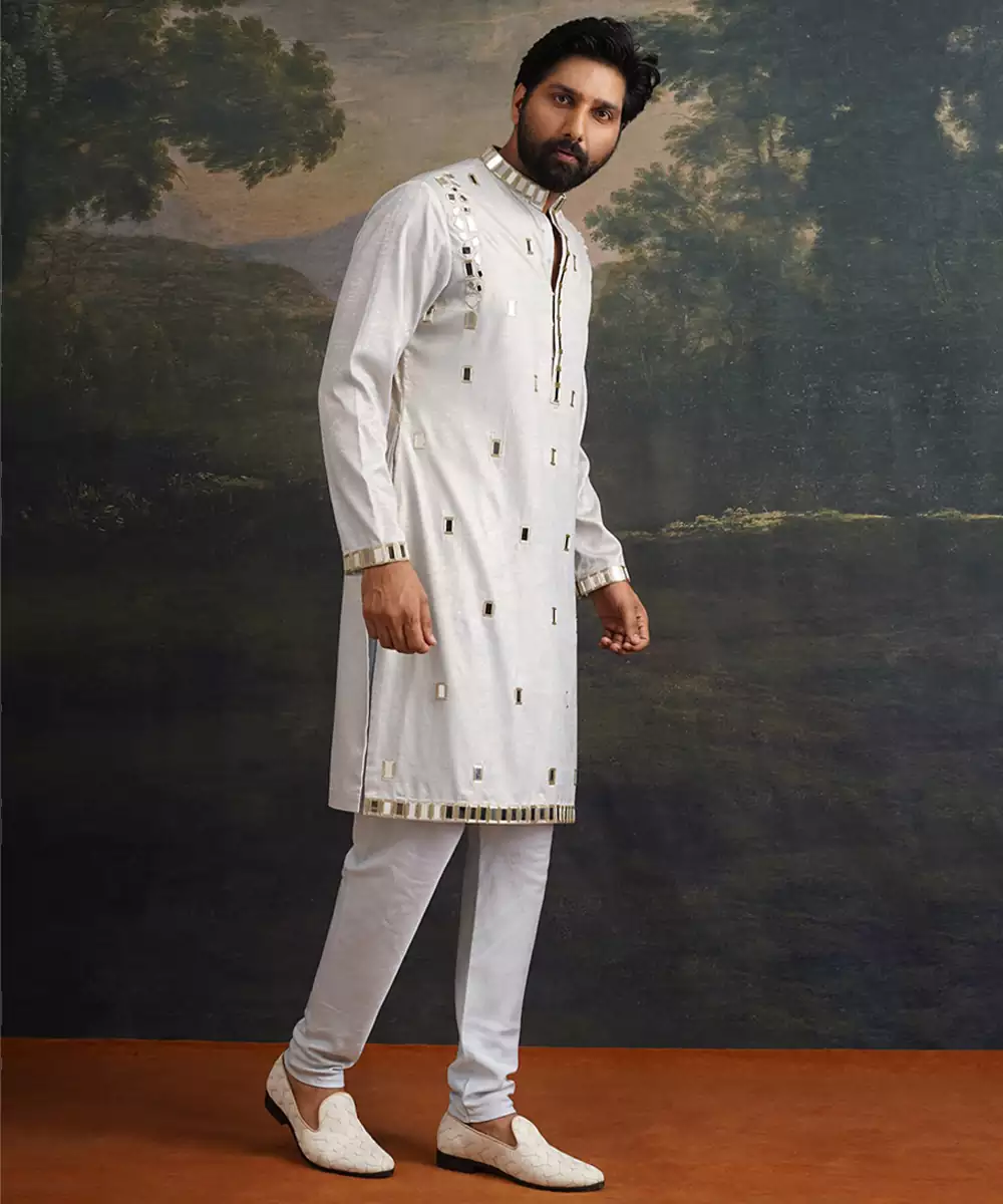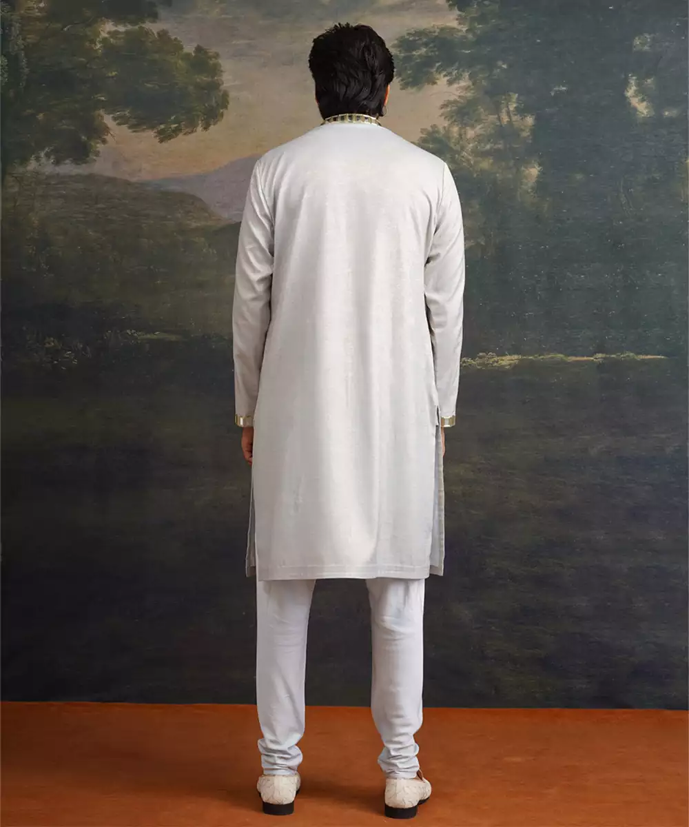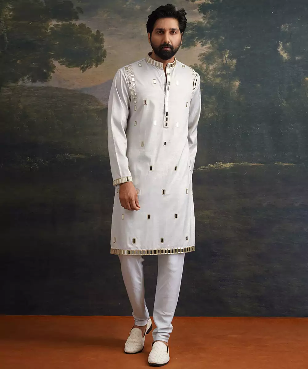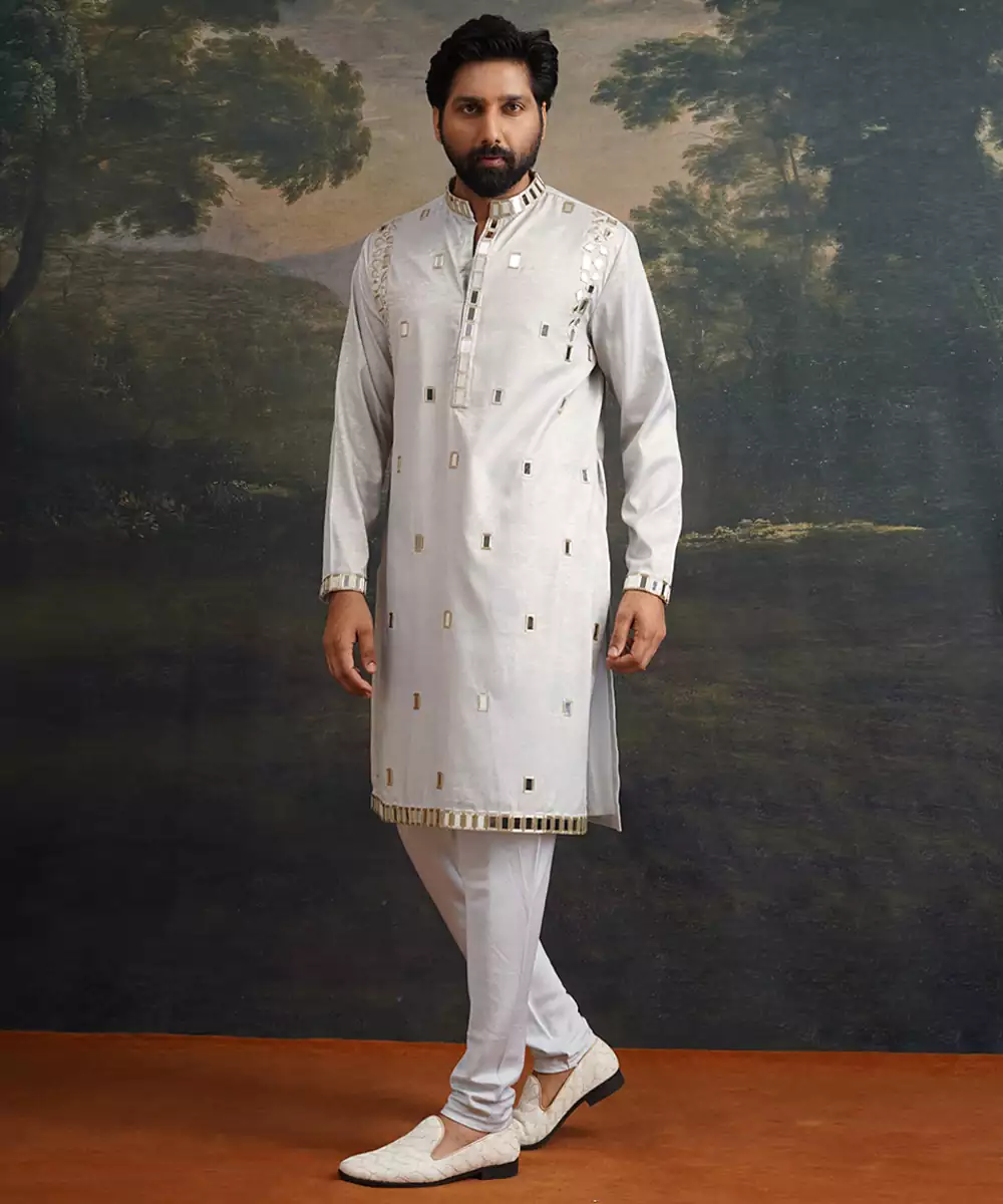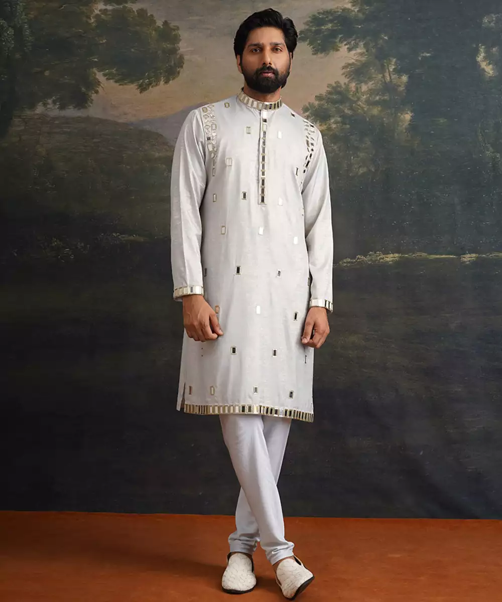 A Graceful Ensemble That Balances Subtle Tones With Intricate Craftsmanship. This Ice Grey Kurta Set Is Beautifully Crafted From Premium Fabric And Adorned With Full Hand Embroidery And Mirror Work In Gold Accents, Creating A Sophisticated And Radiant Look. Perfect For Festive Occasions, Receptions, Or Elegant Gatherings, This Set Brings Refined Artistry And Contemporary Style Together In Effortless Harmony.
