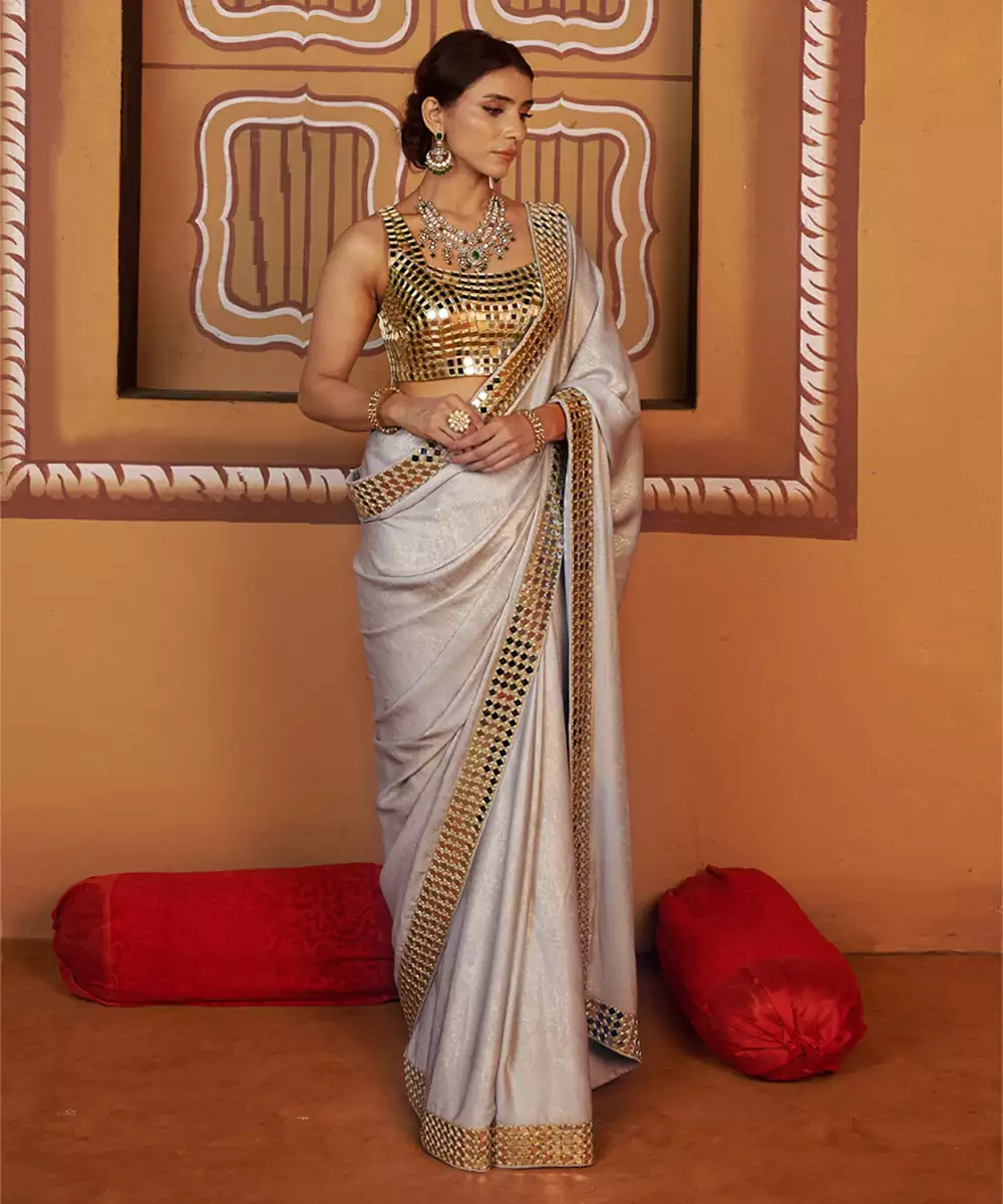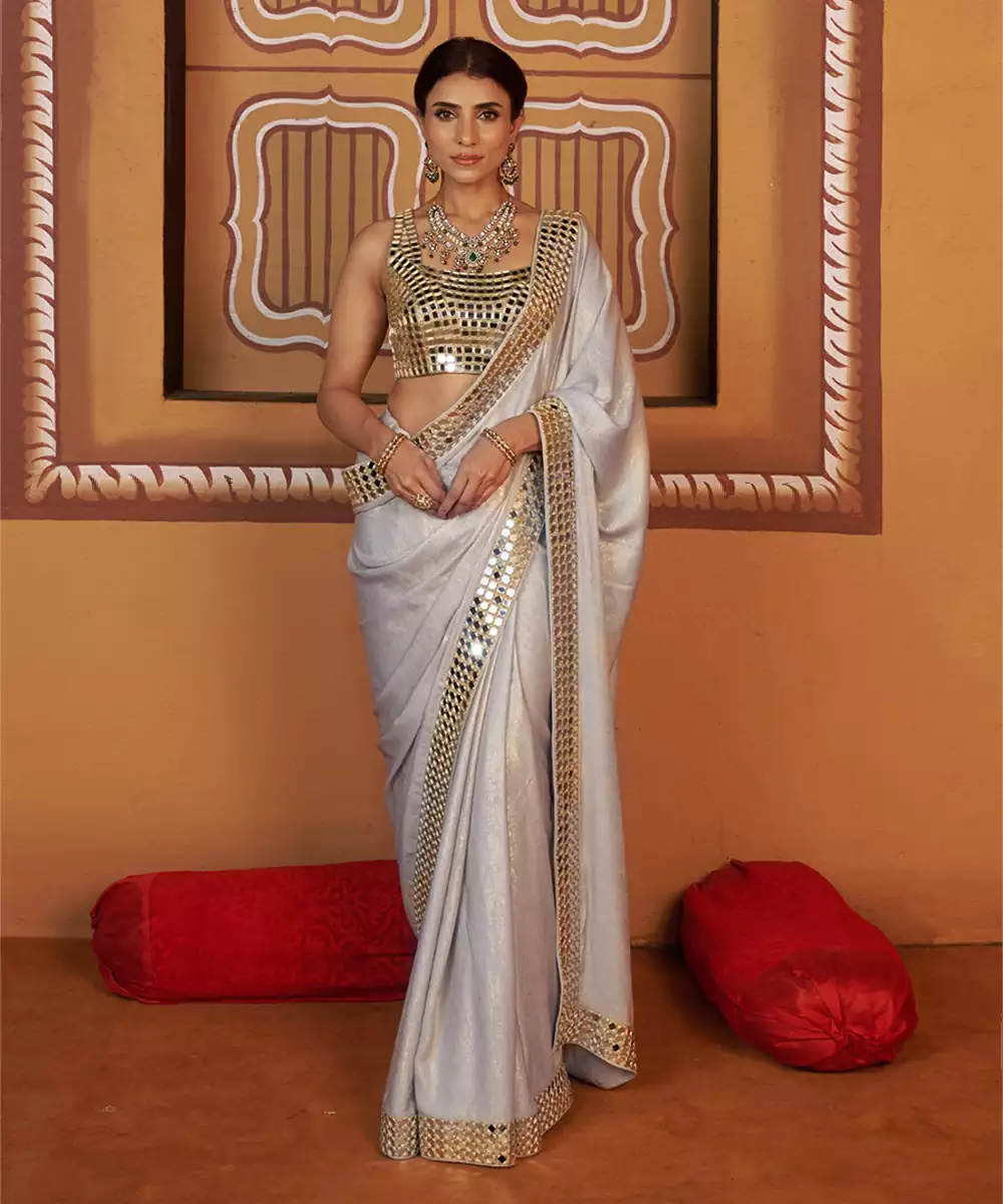 A Timeless Ensemble That Exudes Elegance And Artistry. This Fully Hand Embroidered Mirror Work Blouse In Soft Antique Gold Paired With A Blue Shimmer Saree, Creating A Perfect Fusion Of Tradition And Modern Sophistication. Crafted From Luxurious Imported Fabric, This Set Offers A Luxurious Sheen With All Day Comfort — Ideal For Festive Occasions, Weddings, And Grand Celebrations.