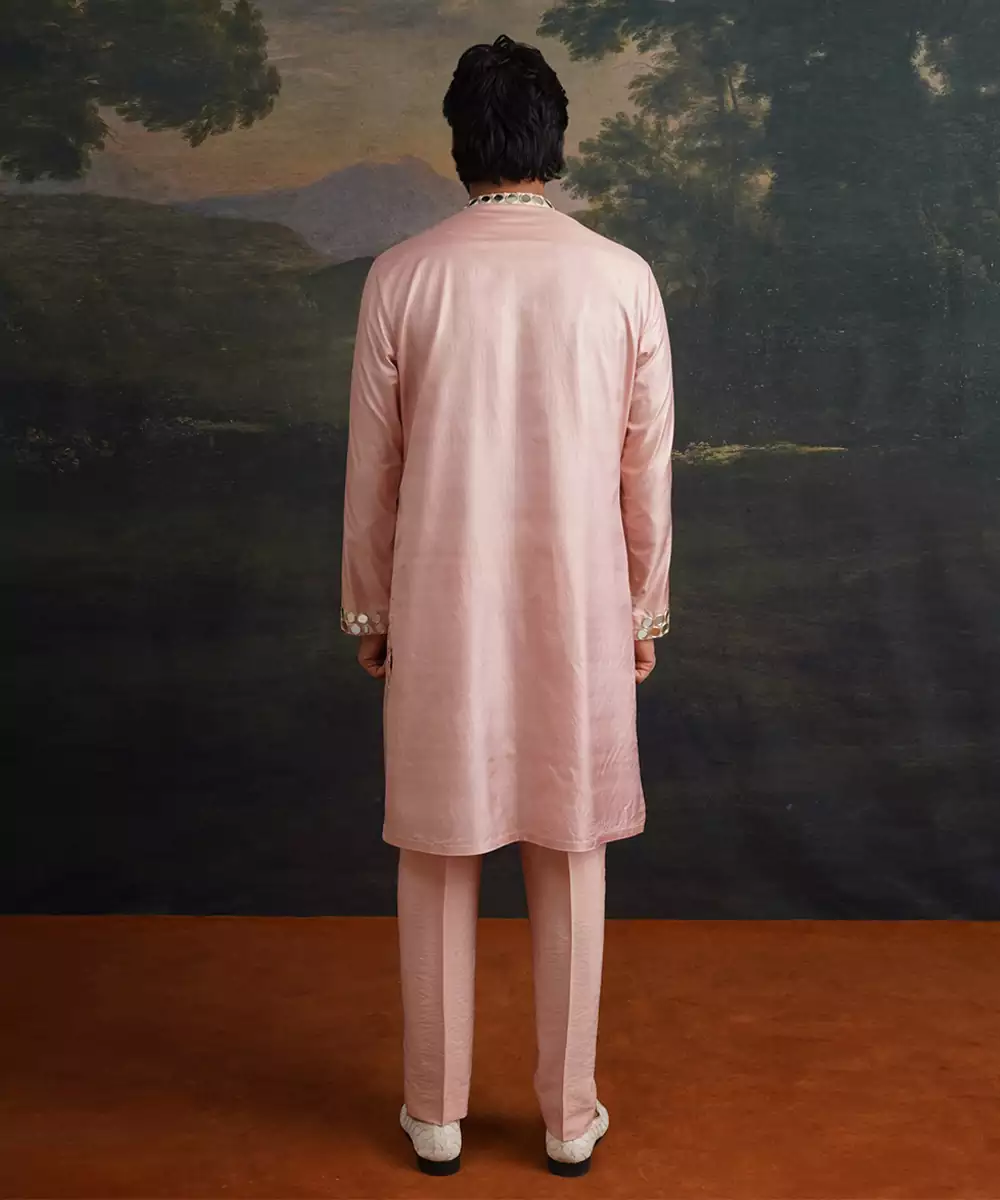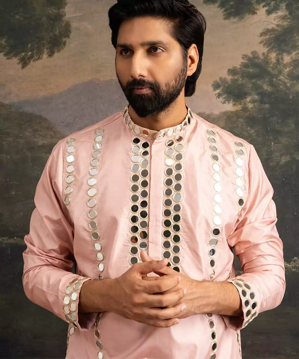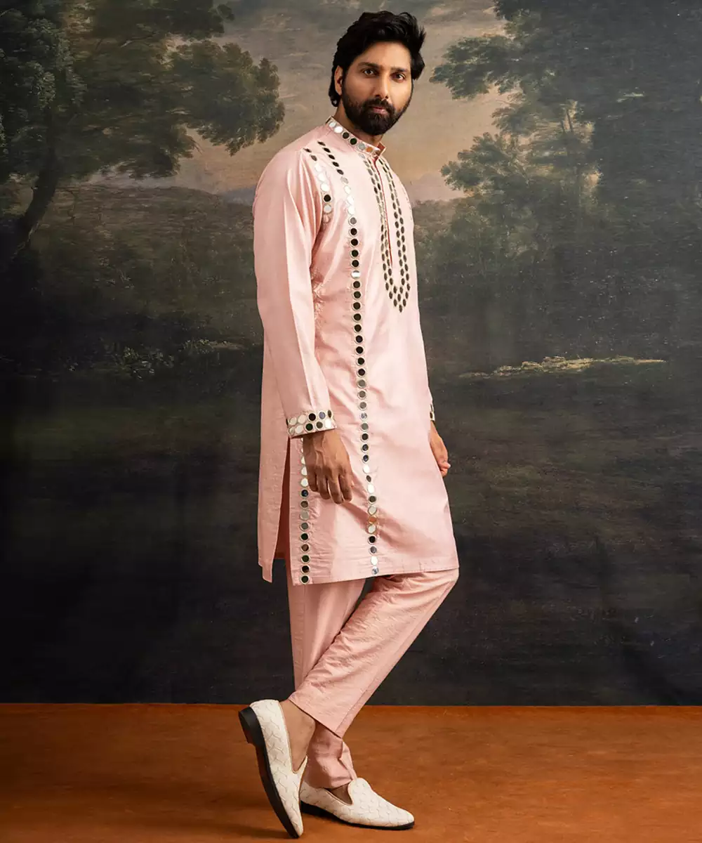 A Stunning Ensemble Designed For Those Who Appreciate Craftsmanship And Elegance. This Dusky Pink Kurta Set Is Crafted From Rich Silk And Fully Adorned With Intricate Hand Embroidery And Mirror Work, Giving It A Radiant And Festive Appeal. Perfect For Weddings, Celebrations, Or Special Occasions, This Set Brings Together Traditional Artistry And Modern Grace For An Effortlessly Sophisticated Look.