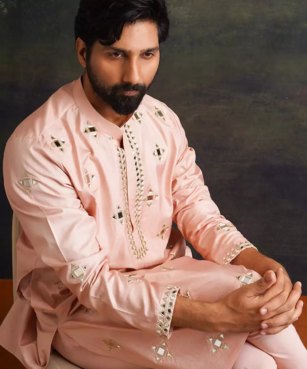 A Timeless Ensemble Crafted For Those Who Cherish Subtle Elegance With Artisanal Detailing. This Dusty Pink Kurta Set Features An Overall Hand Embroidered Design With Mirror Work That Adds A Soft Shimmer, Creating A Refined And Graceful Look. The Luxurious Silk Fabric Combined With Intricate Handiwork Makes It Ideal For Festive Gatherings, Celebrations, Or Elegant Daytime Events Where Sophistication Meets Tradition.