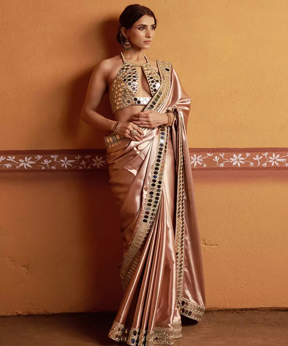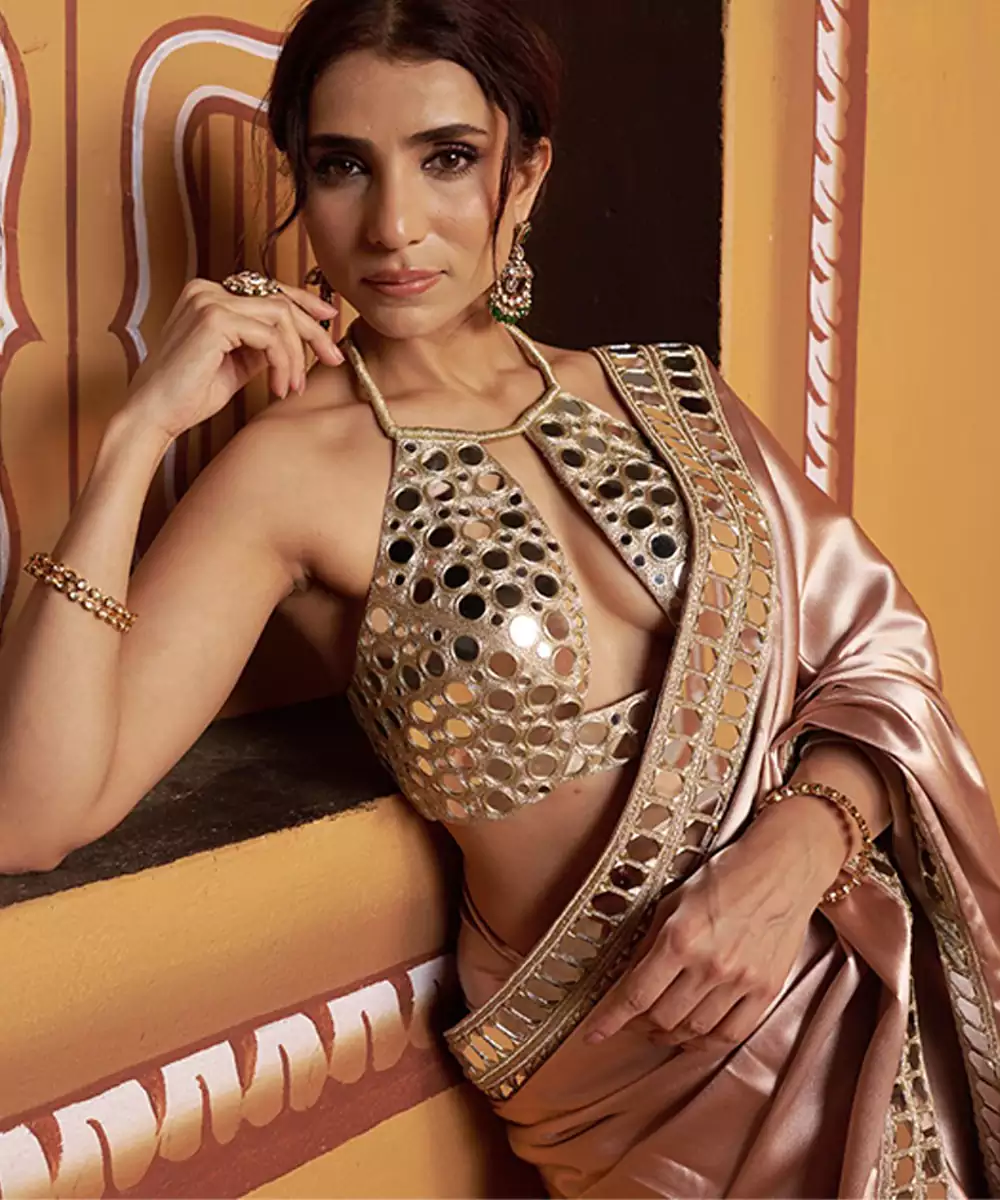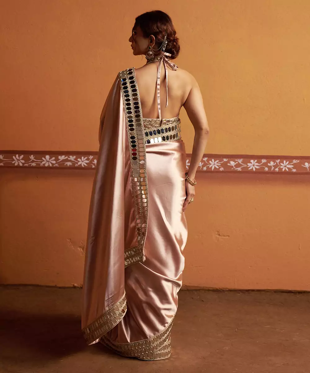 A Timeless Ensemble That Exudes Elegance And Artistry. This Fully Hand Embroidered Mirror Work Blouse In Gold Paired With A Clay Tone Saree With Mirror Work Border, Creating A Perfect Fusion Of Tradition And Modern Sophistication. Crafted From Luxurious Imported Fabric, This Set Offers A Luxurious Sheen With All Day Comfort — Ideal For Festive Occasions, Weddings, And Grand Celebrations.