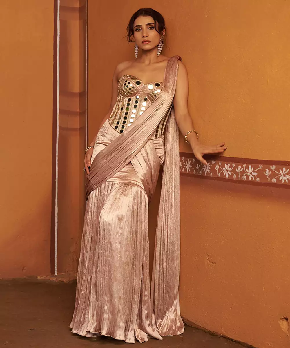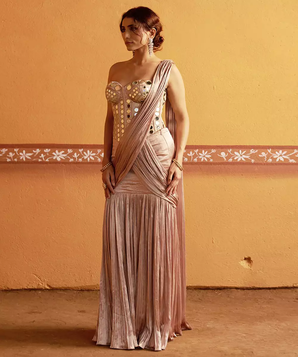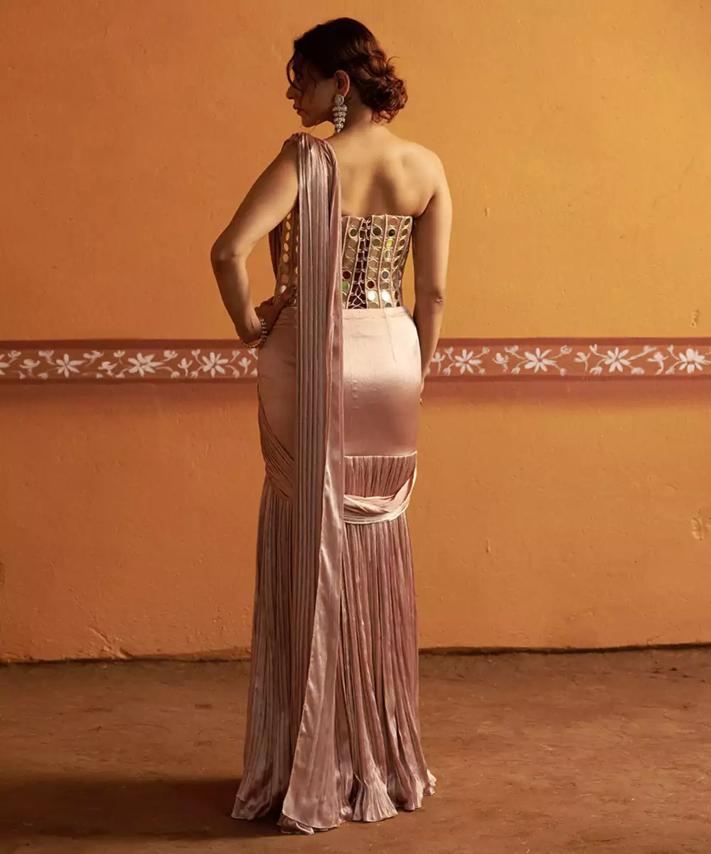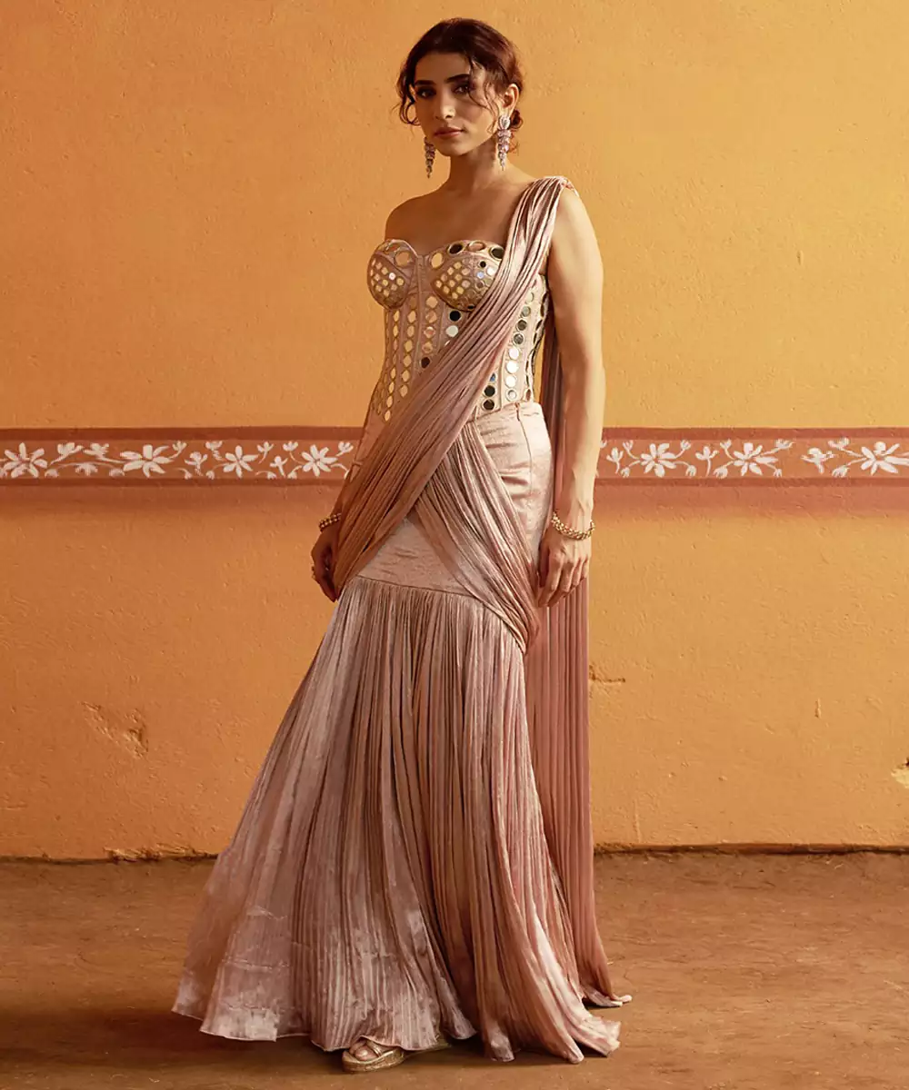 Contemporary Twist On Traditional Elegance — This Fully Hand Embroidered Mirror Work Corset Blouse Is Paired With A Blush Pink Lehenga Pleated Saree, Creating A Statement Look That’s Both Regal And Modern. The Intricate Mirror Detailing Reflects Fine Craftsmanship, While The Fluid Drape Of The Saree Adds Effortless Grace. Perfect For Weddings, Festive Occasions, And Grand Celebrations.