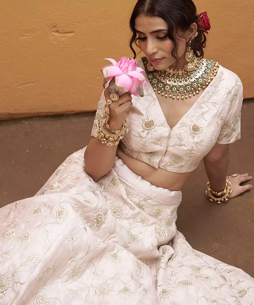 The Stitched Silk Blouse Blends Seamlessly With The Lehenga, Offering A Clean And Tailored Fit. Its Embroidery Detailing Feels Thoughtfully Placed, Enhancing The Outfit Without Making It Heavy. Paired With This Is A Sheer Organza Dupatta, Which Adds Lightness And Flow, Softly Completing The Look With A Graceful Drape.