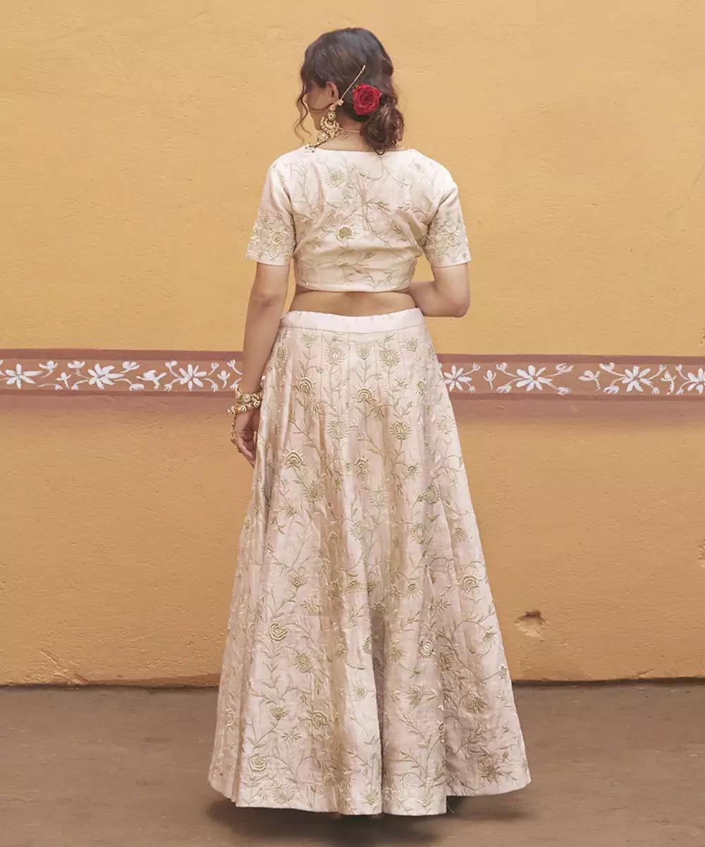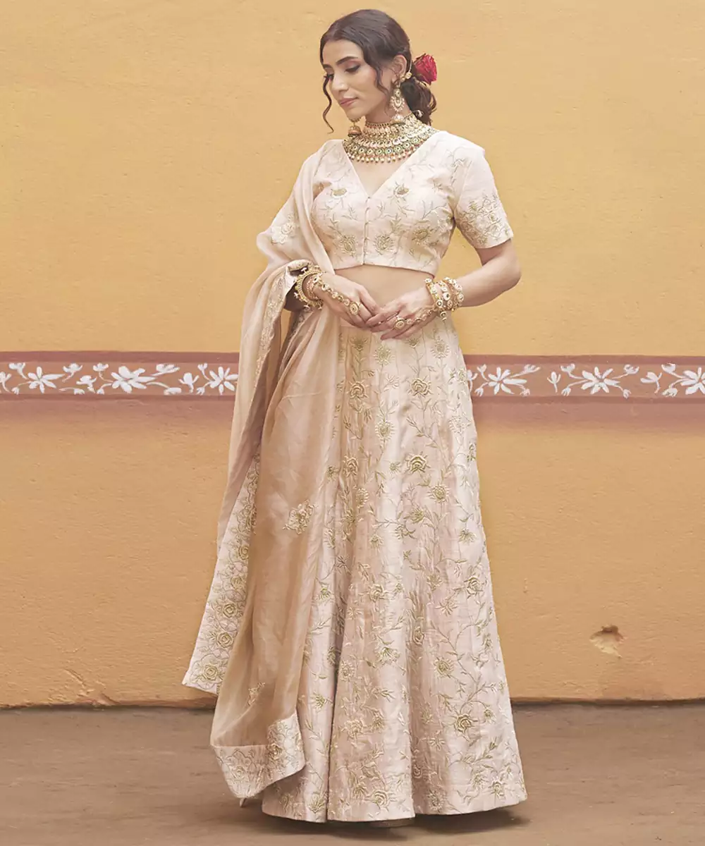 The A Line Silk Lehenga Falls Naturally And Comfortably, Giving You Ease Of Movement While Maintaining A Structured, Elegant Shape. Delicate Gold Thread Embroidery Spreads Evenly Across The Fabric, Adding Subtle Shine That Looks Rich Yet Understated—Especially In Natural Light.