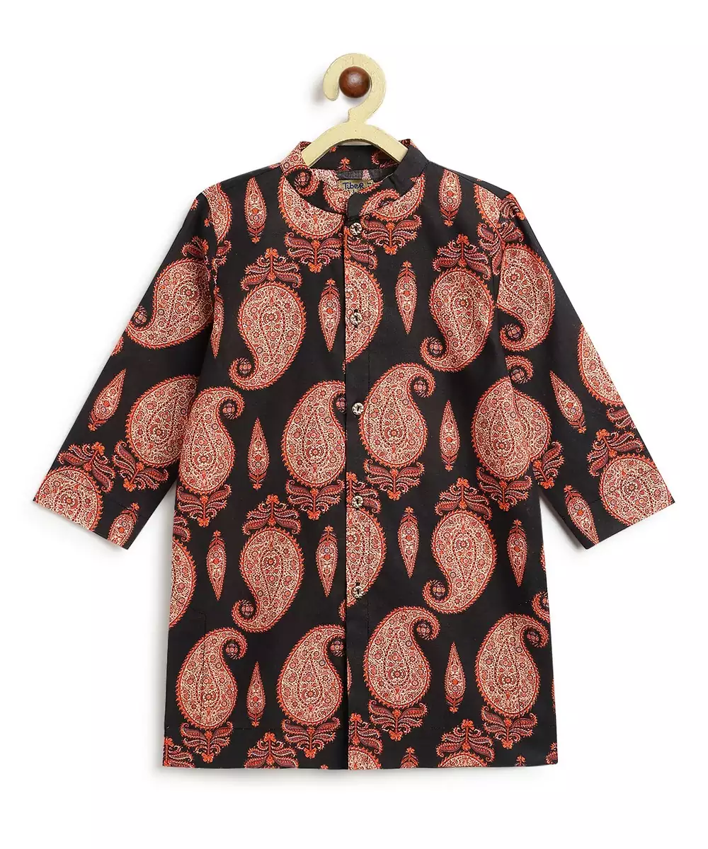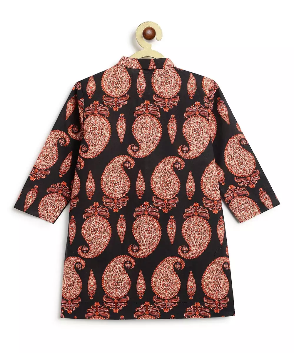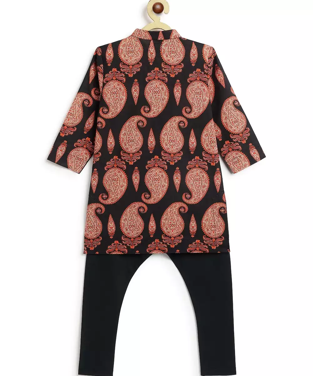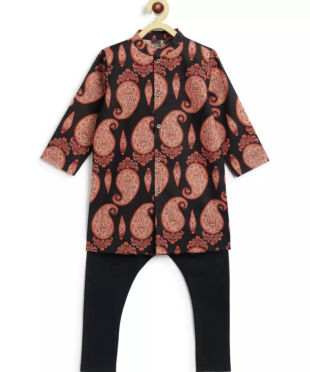 Elevate Your Little One’s Festive Style With This Elegant Black Kurta Set Featuring A Timeless Paisley Print. Crafted From 100% Pure Cotton, This Outfit Is As Breathable As It Is Stylish, Perfect For Long Celebrations. The Intricate Paisley Motif Adds A Touch Of Heritage Charm, While The Classic Silhouette Keeps It Versatile For Both Traditional Functions And Family Gatherings.