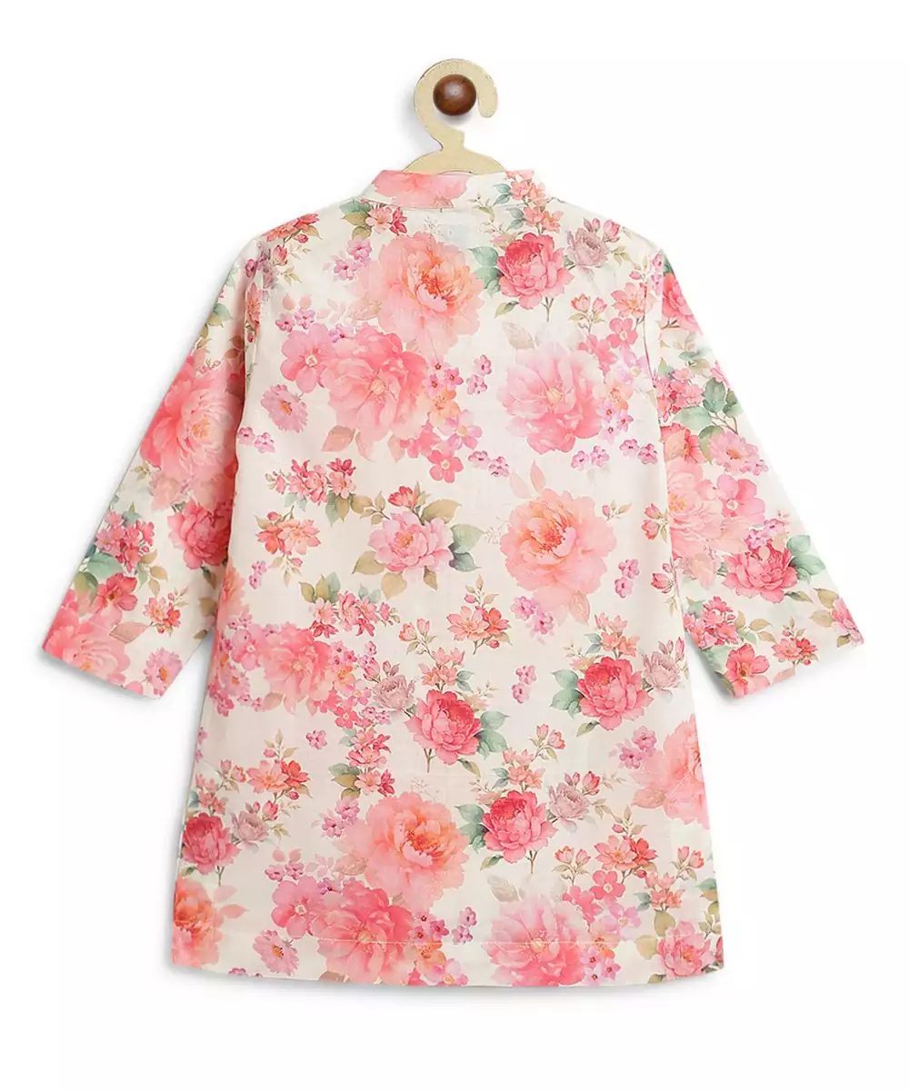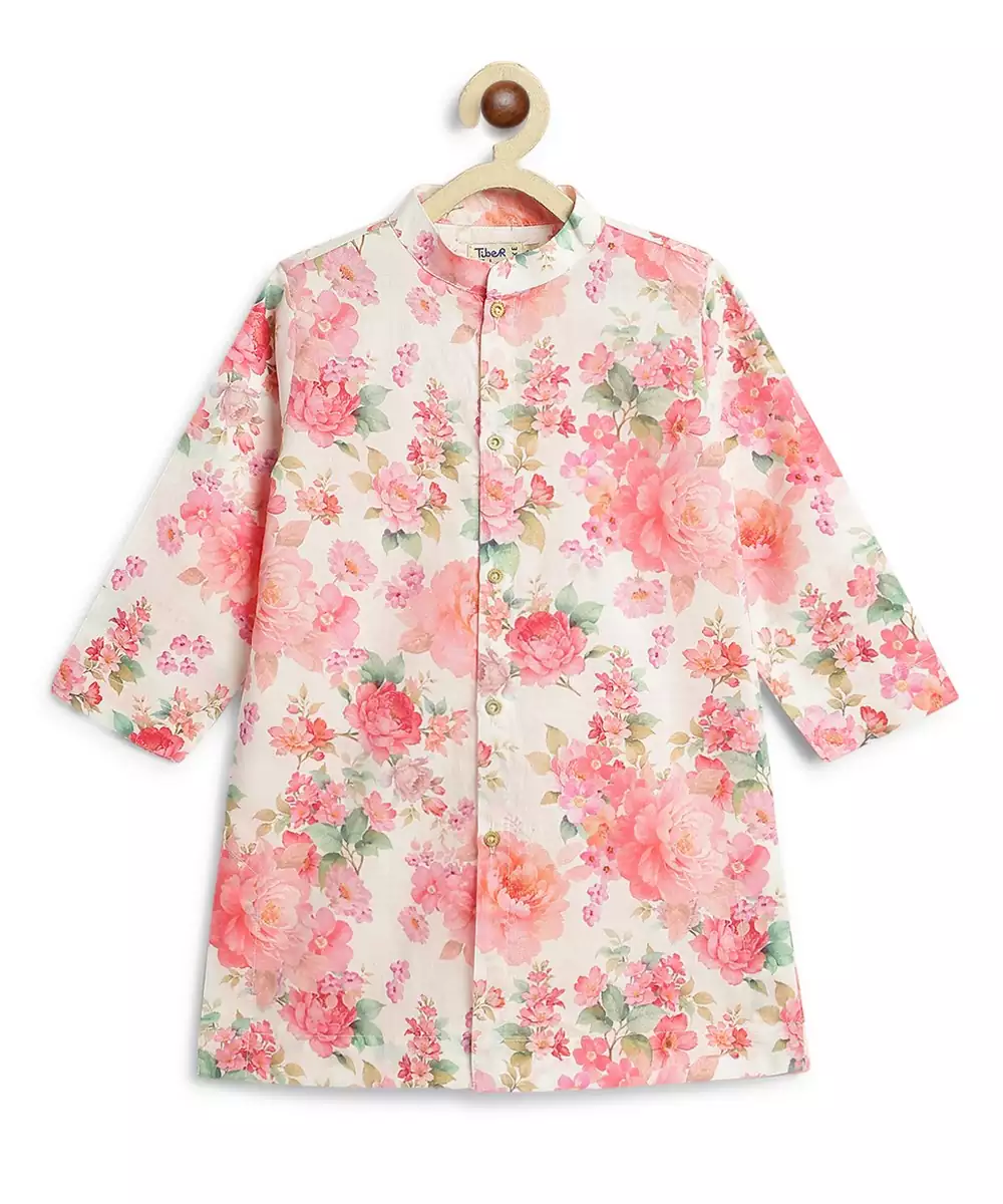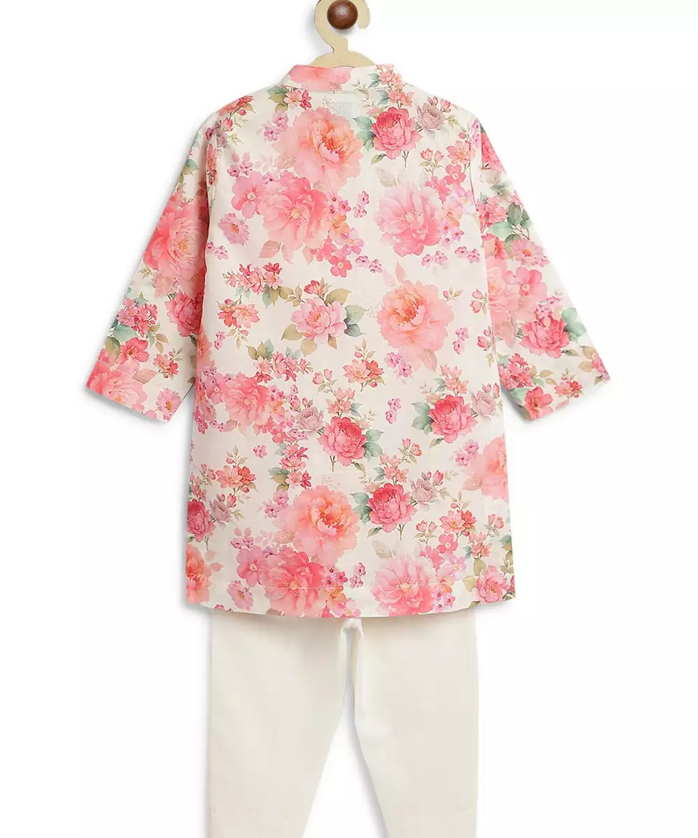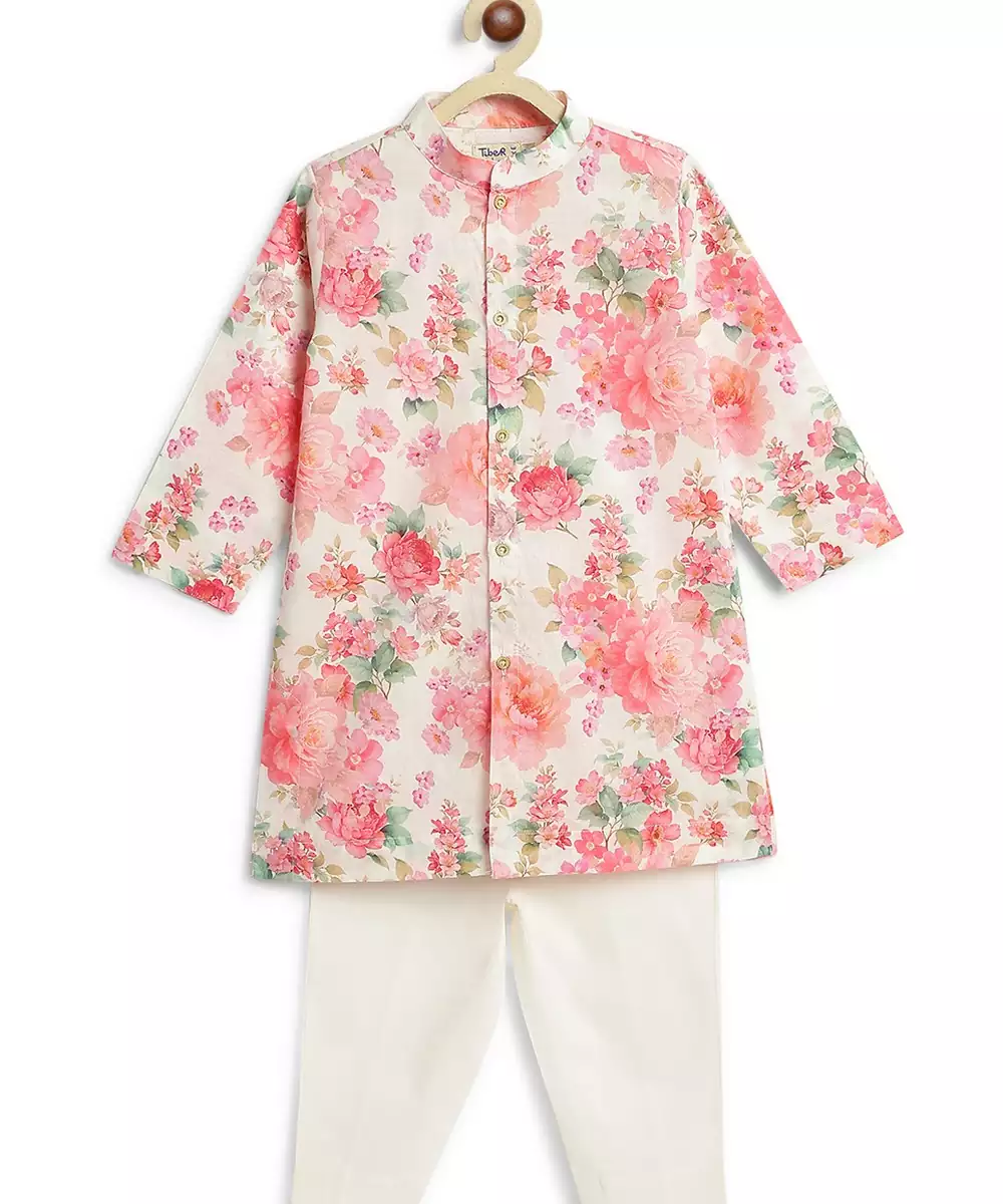 Effortlessly Festive And Undeniably Cute, This Floral Kurta Set Will Surely Fetch Your Little One A Lot Of Compliments. Crafted In Breathable Cotton, The Kurta Features An All Over Print Featuring Big, Bright Roses. Comes With A Full Front Opening For Fuss Free Dressing. Paired With Comfortable Cotton Pants, It's An Ideal Choice For Summer Celebrations, At Home Festivities, Or Weddings.