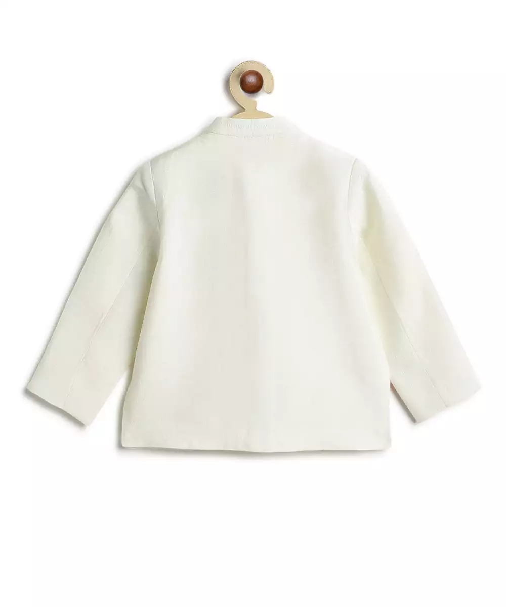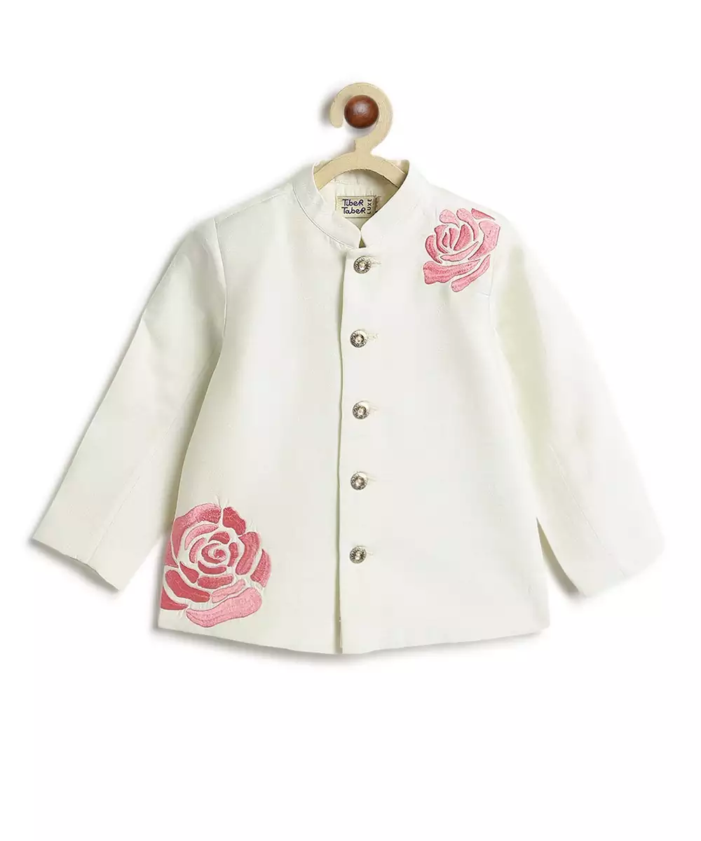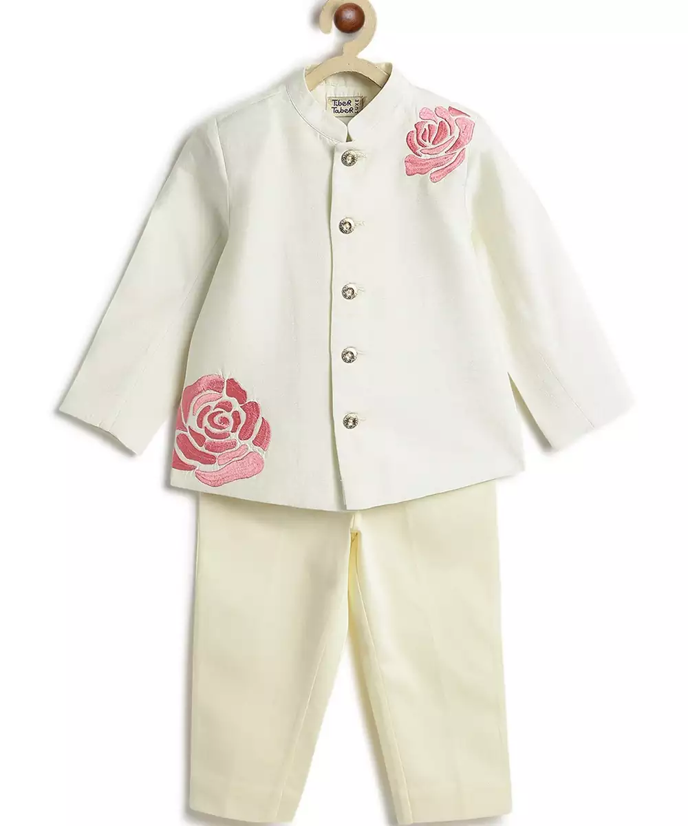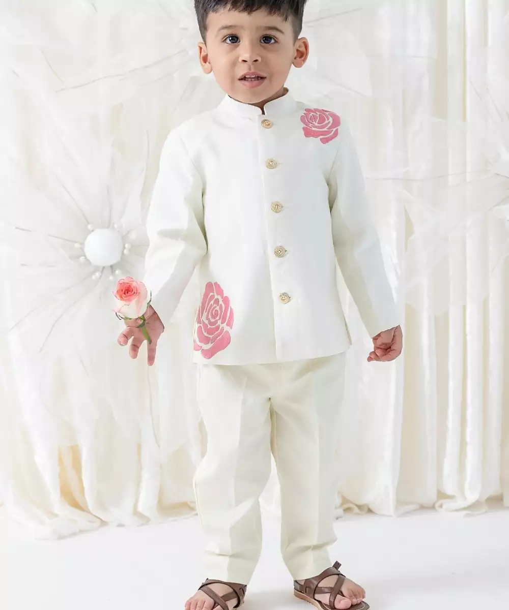 Transform Your Little Boy Into A Dapper Gentleman With This Elegant Set. Designed With Delicate Pink Rose Embroidery On A Soft Viscose Base, The Bandhgala Is The Perfect Formal Outfit For Big Days. Paired With Relaxed Cotton Pants, This Set Is Both Luxurious And Comfortable And Works Well For Weddings, Ceremonies, And Family Gatherings. Thoughtfully Tailored For Babies And Little Boys For Unrestricted Movement.