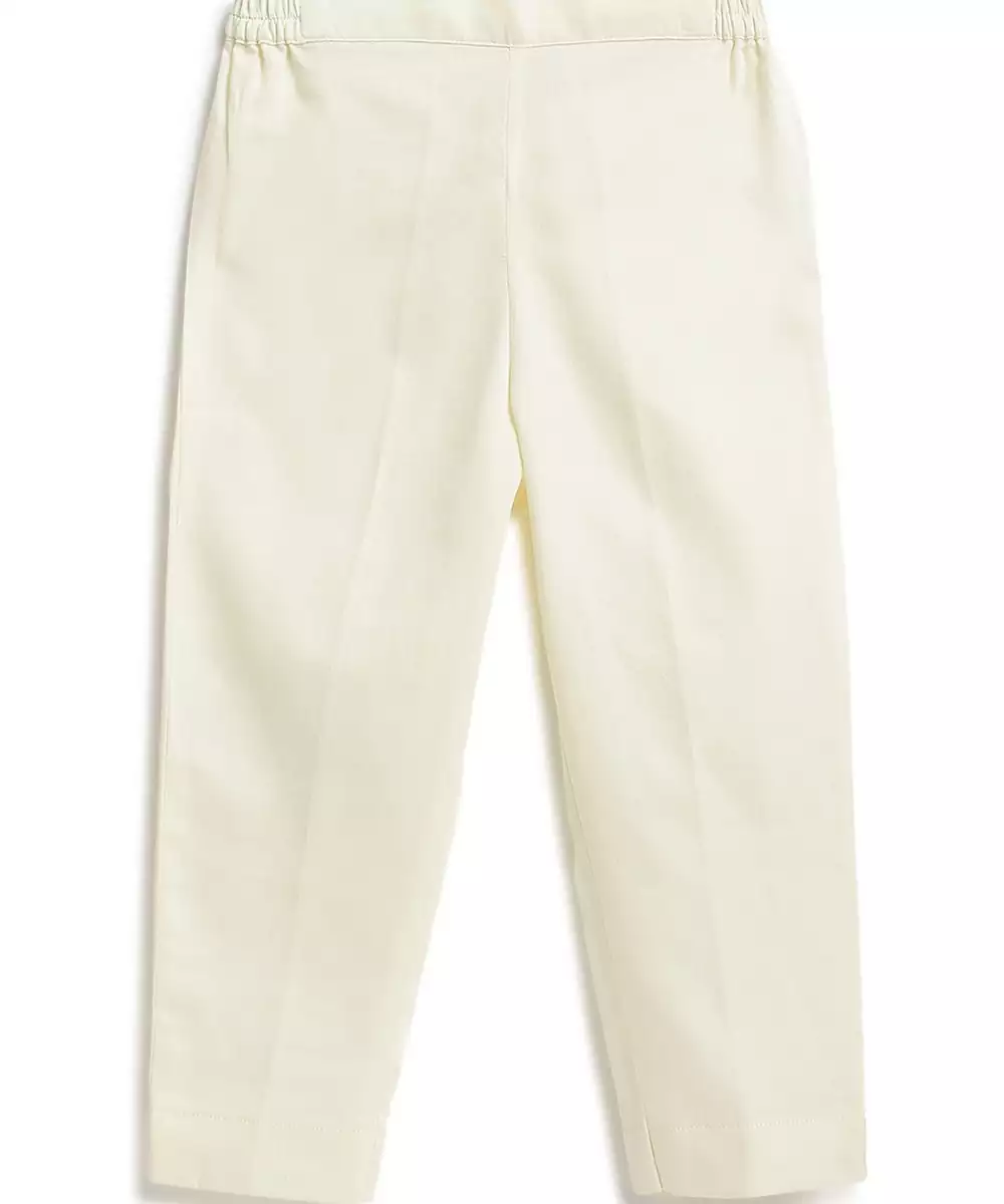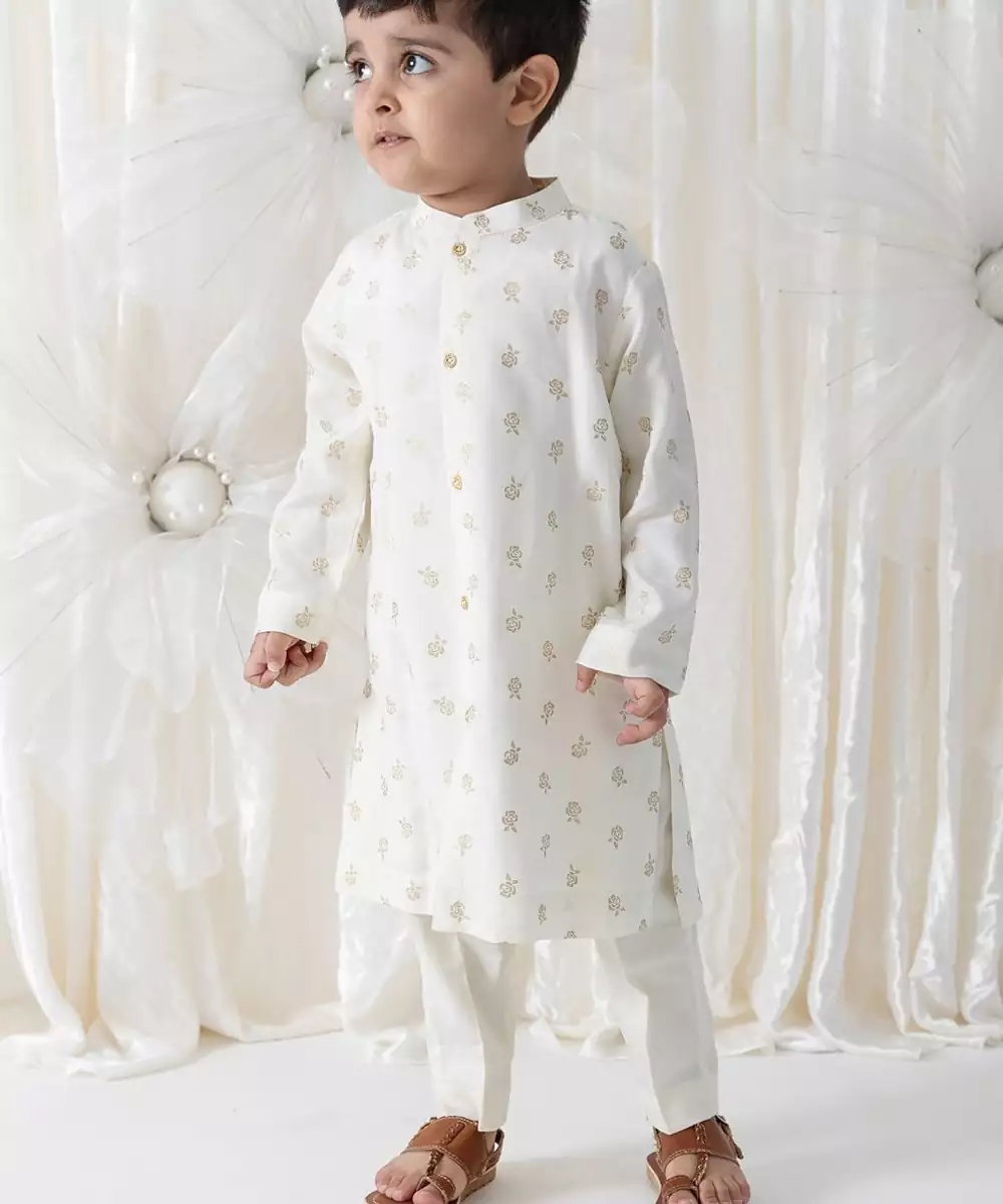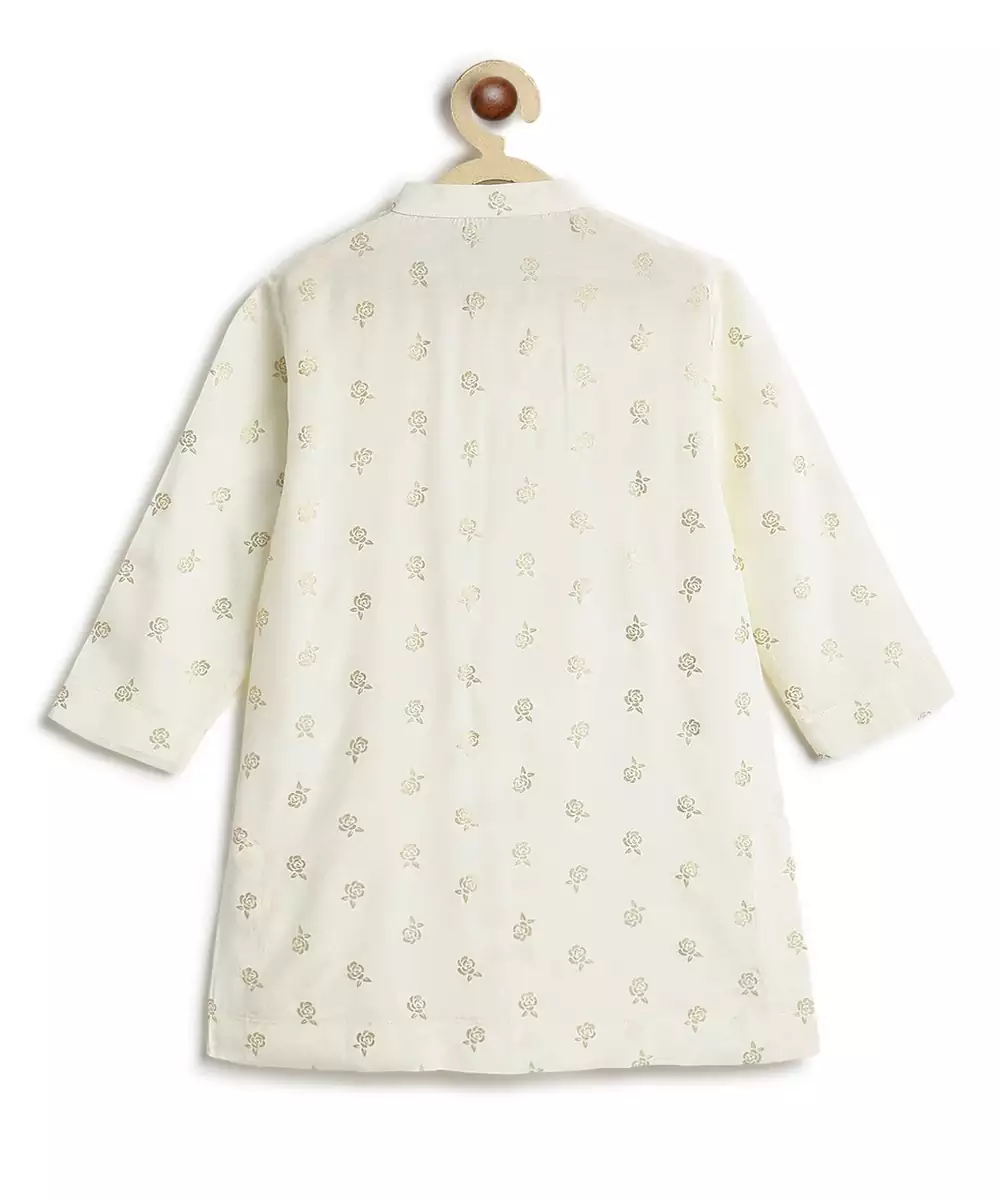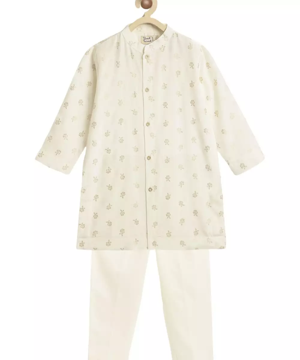 A Timeless Festive Pick, This Cream Kurta Set Is Designed For Dapper Camera Moments. The Kurta, Crafted In Soft Viscose, Features Rose Motif Foil Print And A Band Collar For A Formal Look. Paired With Classic Cotton Trousers, The Outfit Is Perfect For Poojas, Festivals, Or Family Celebrations. Brings Together Comfort And Charm.