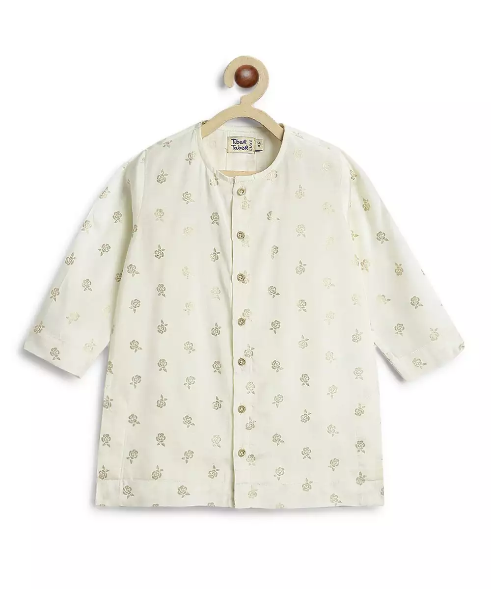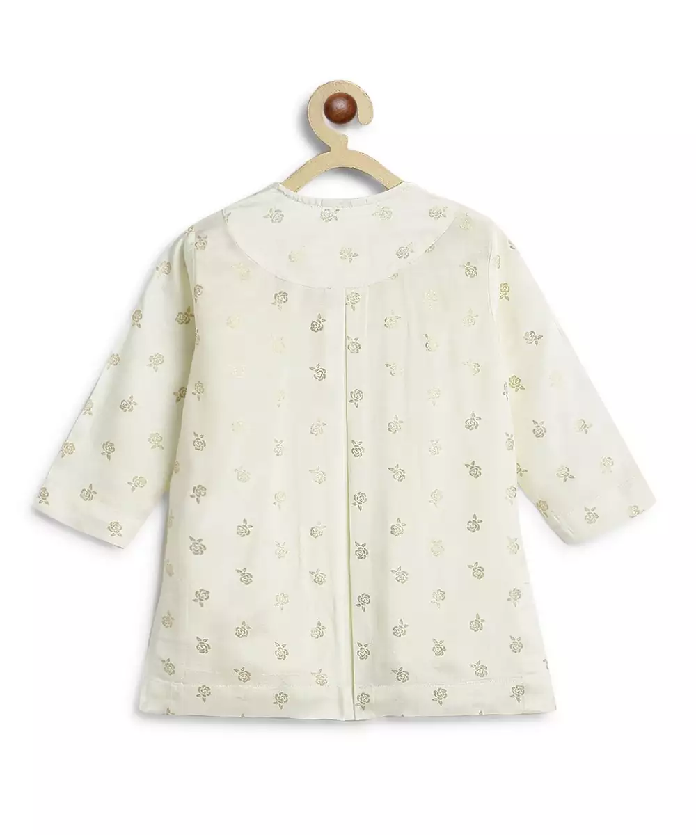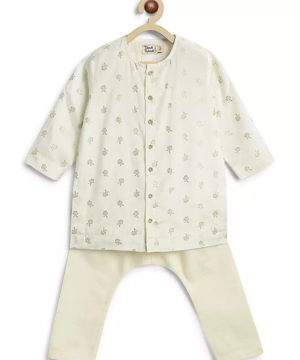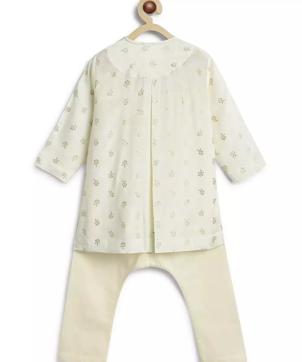 Celebrate Your Baby Boy’s Special Moments In This Elegant Cream Kurta Set With Delicate Rose Motif Foil Print. Made In Soft Viscose, It Features A Round Neck And A Relaxed Fit. The Cotton Pyjama Is Tailored To Comfortably Accommodate Diapers, Making It Perfect For Newborn Festivities. Lightweight And Gentle, This Set Brings Together Festive Charm And Everyday Ease.
