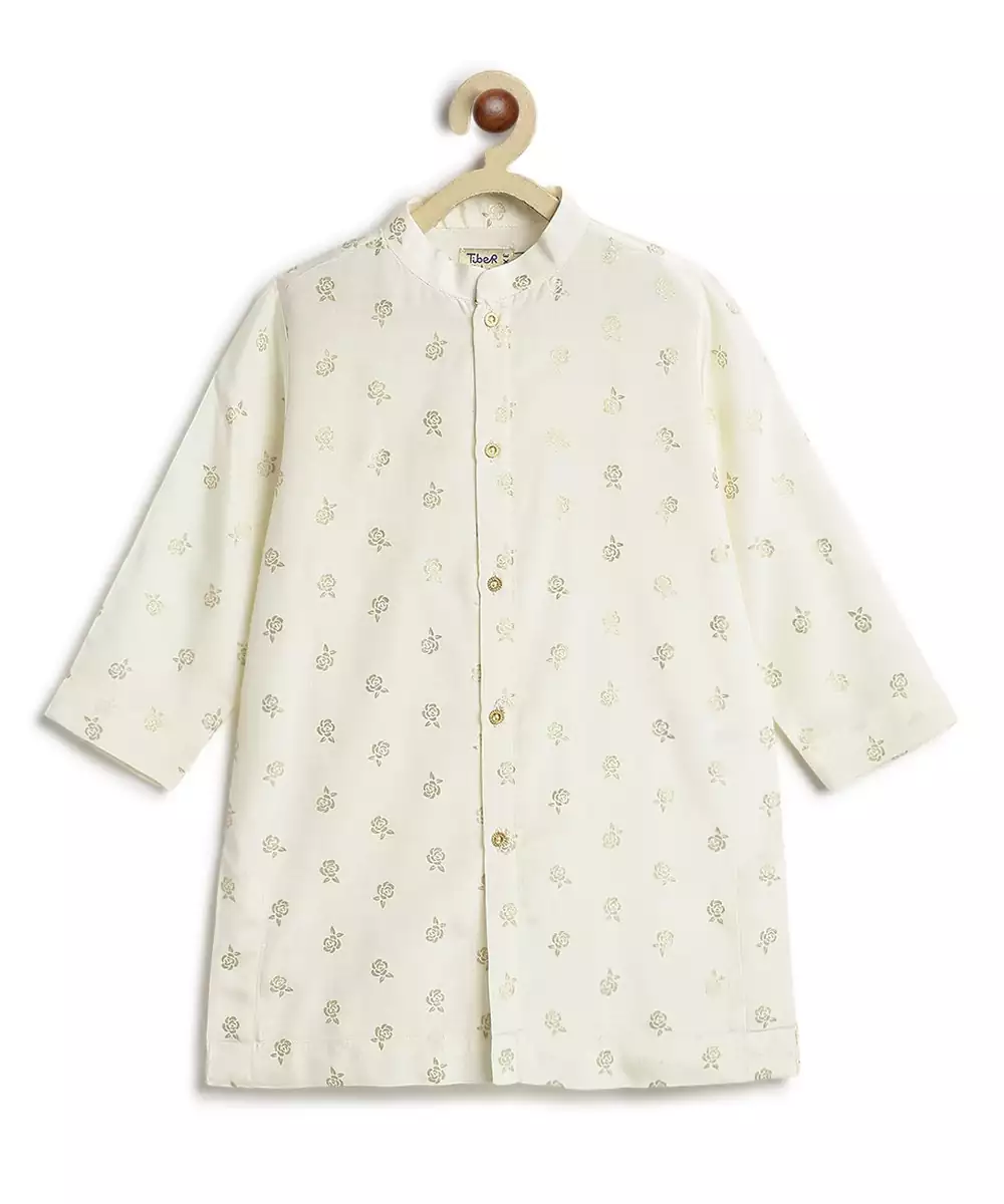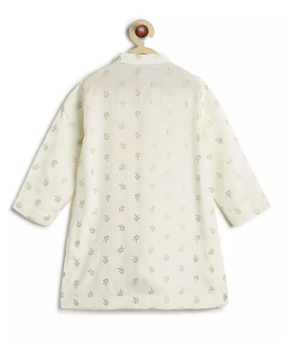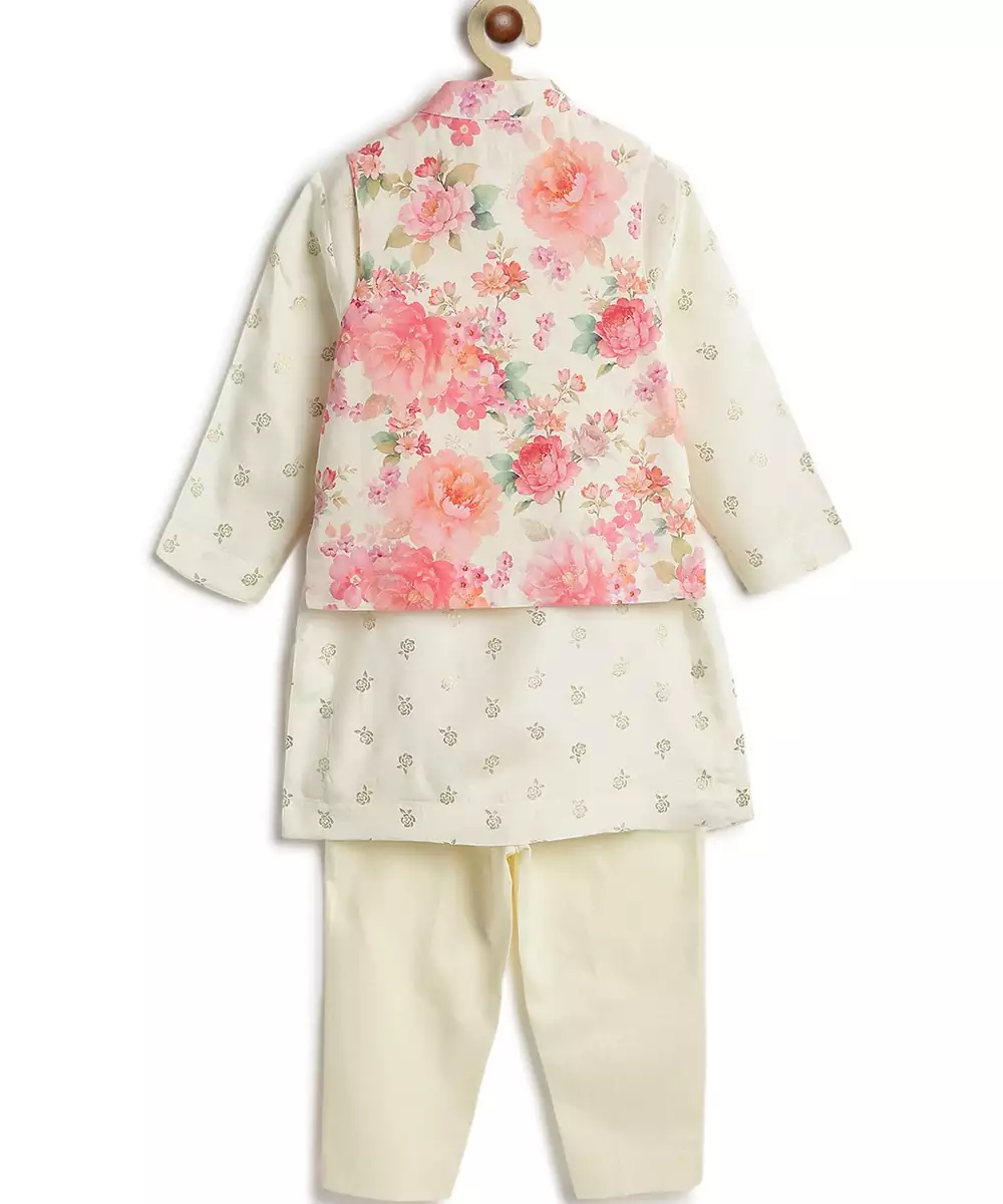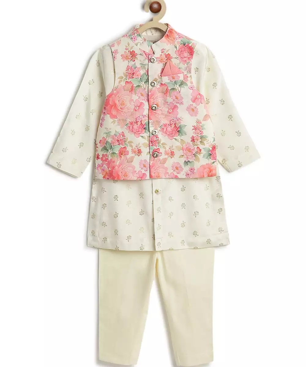 For The Little Gentleman Who Loves Color, This Floral Bundi Set Is All About Effortless Style. The Soft Viscose Cream Kurta Features Rose Motifs Foil Print Beautifully From Under A Cream Floral Bundi Tailored To Perfection. Comes With A Matching Pocket Square. Ideal For Weddings, Festivals, And Family Events.